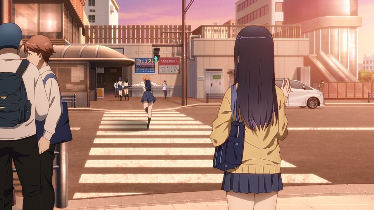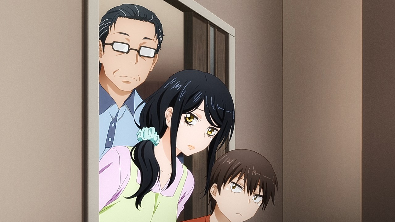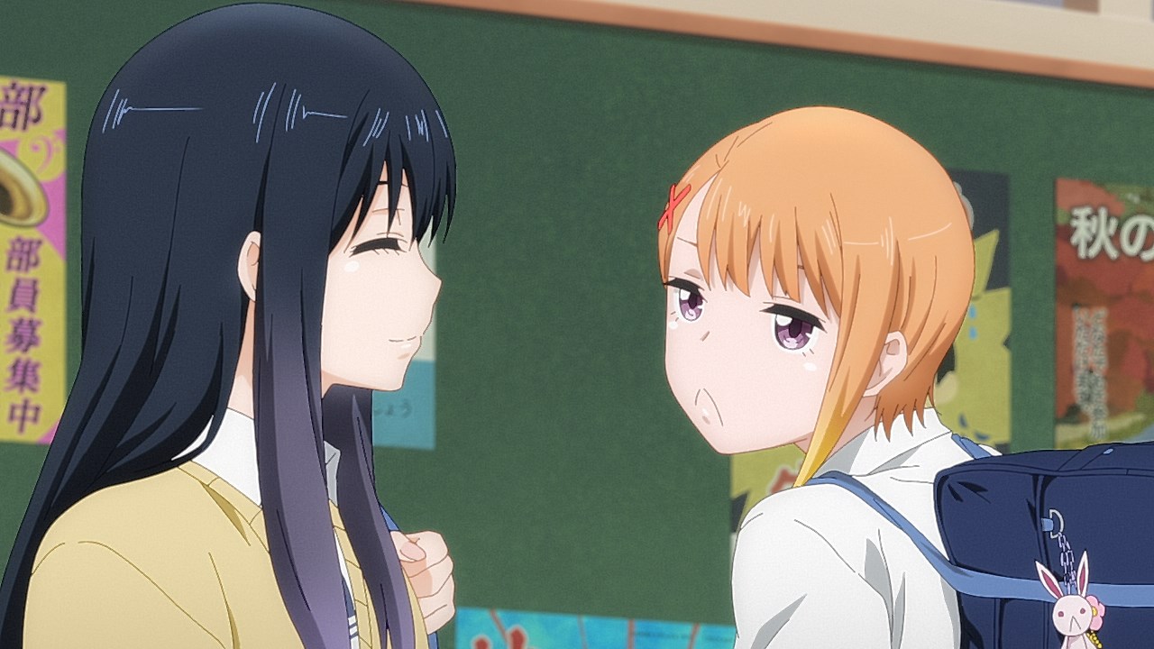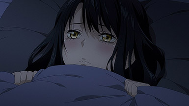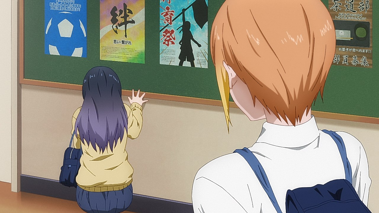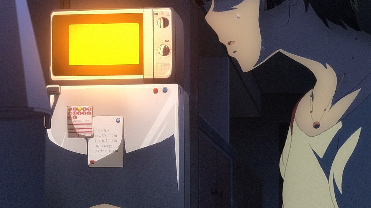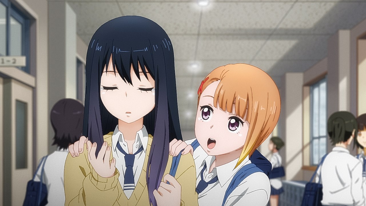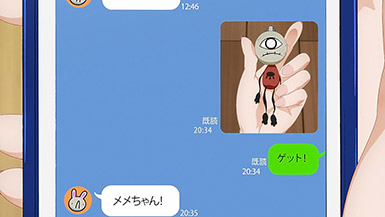 Is it while Miko’s carefree, food-loving friend Hana is having a casual conversation about plushies? Not quite. Is it when Miko hears rustling in the bathroom? Not quite. Is it when Miko finds her charm in an empty classroom as the lights flicker? Close, but no cigar. But because of the gradual build-up, it makes it all the freakier when we see Miko’s SMS glitching out due to spiritual interference as the episode’s first ghost gets right up in the camera’s face.