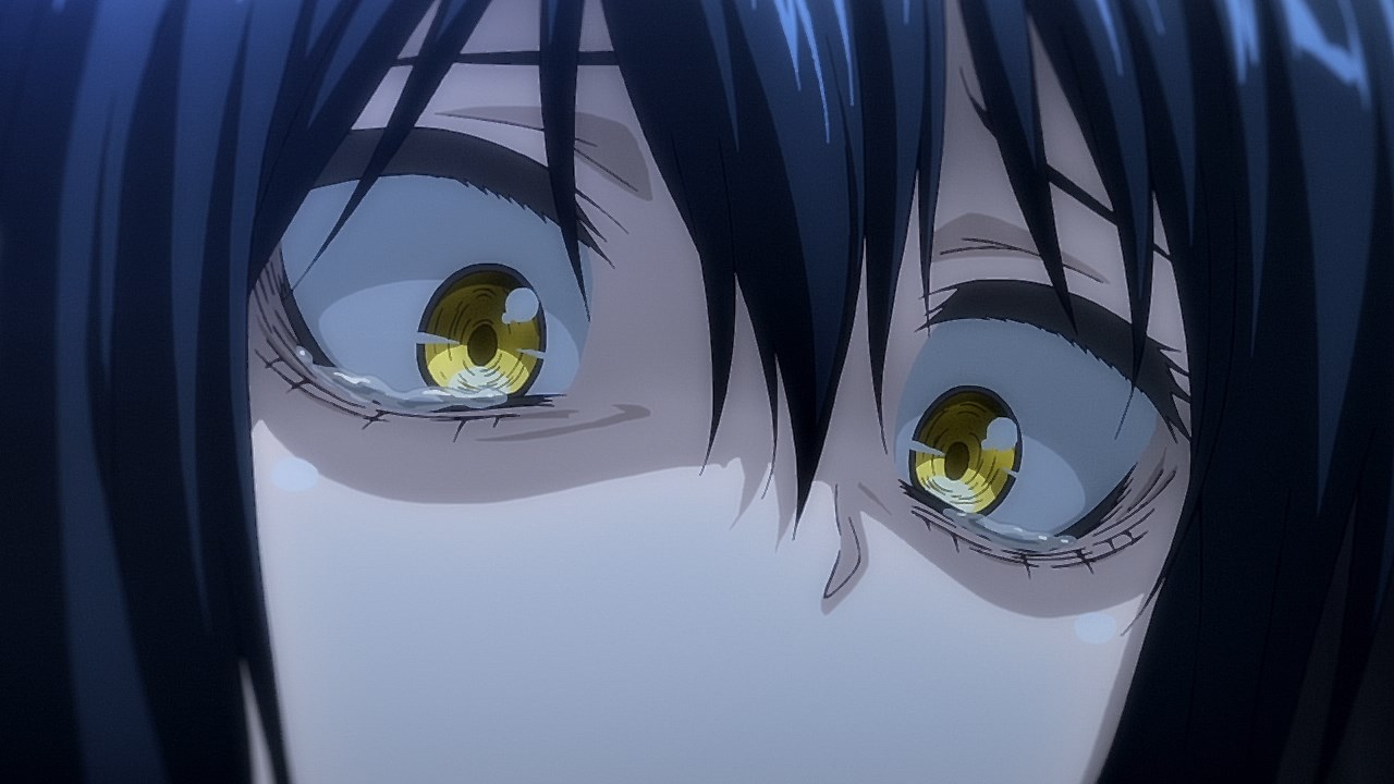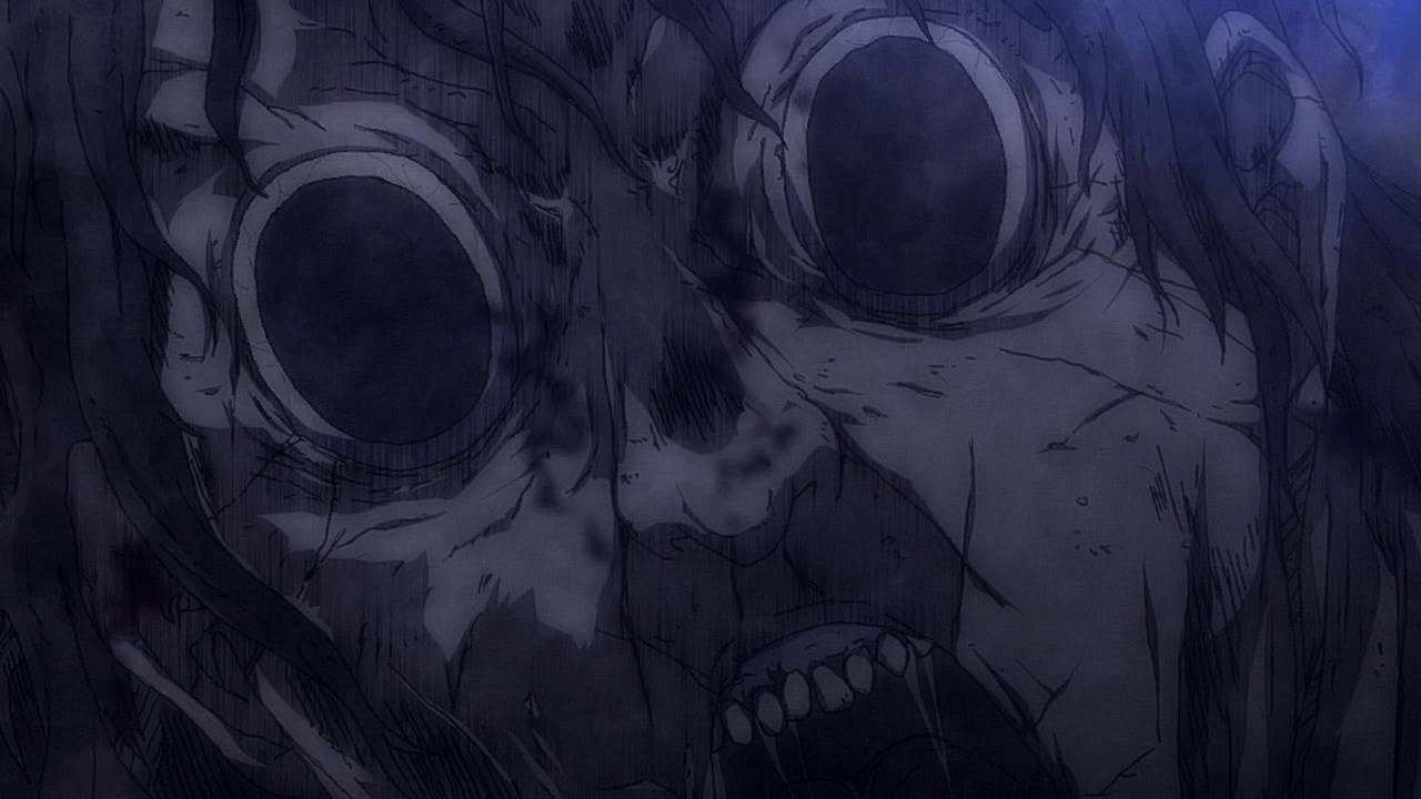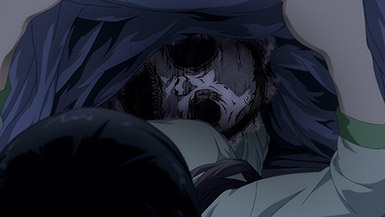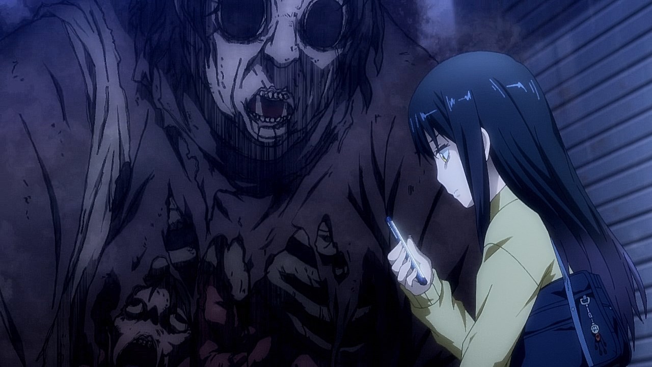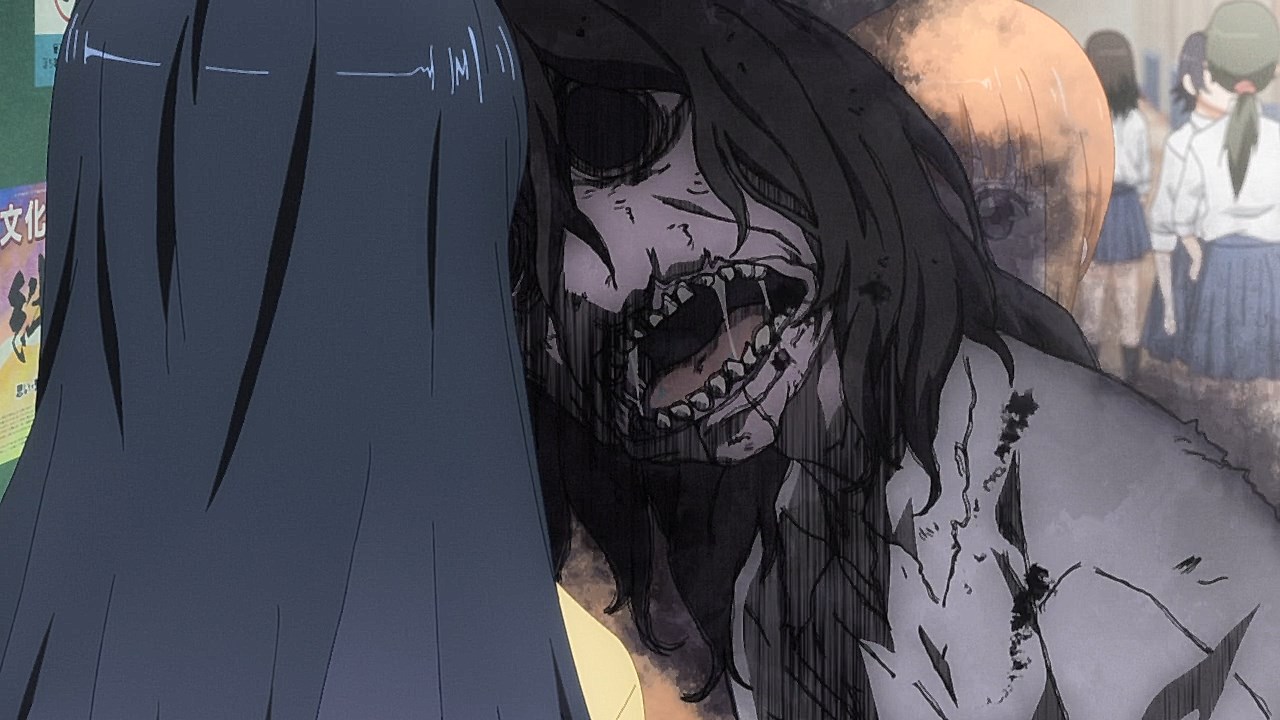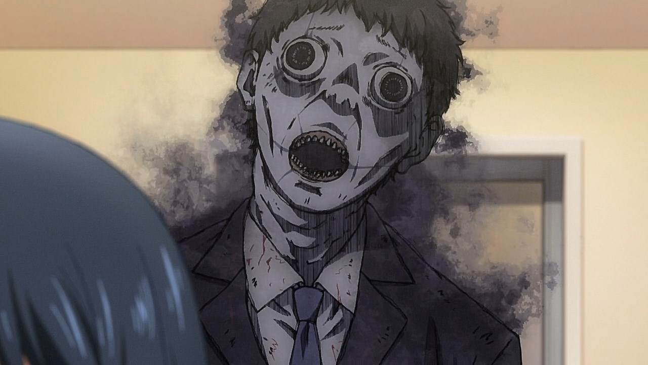 In fact, from here on out, the ghosts aren’t shy about giving you a good jump scare. It doesn’t help that the designs are honest-to-goodness horrifying as they are gargantuan ghouls with warped faces, vacant black eyes, a corpse-like presence, and no interest in personal space. I wasn’t sure how much the anime would lean on the comedic aspects of it, but the staff working on Mieruko-chan did excellent work on making it believable that Miko would have to hide her fear as she stared at these terrifying spirits in the face and pretend they don’t exist. Even the end credits start with a ghoul rushing the screen as it screams like a banshee.