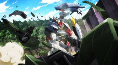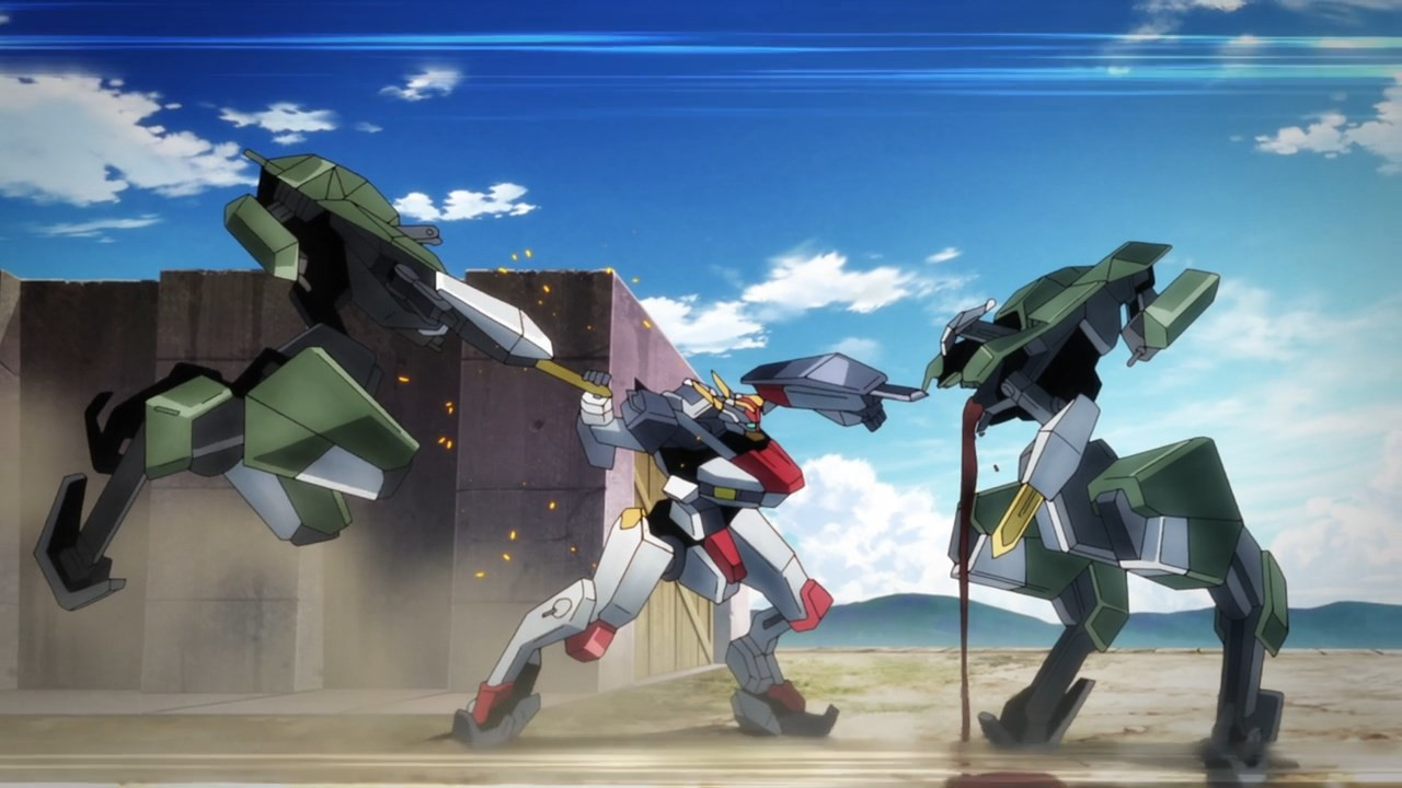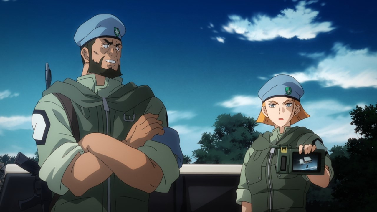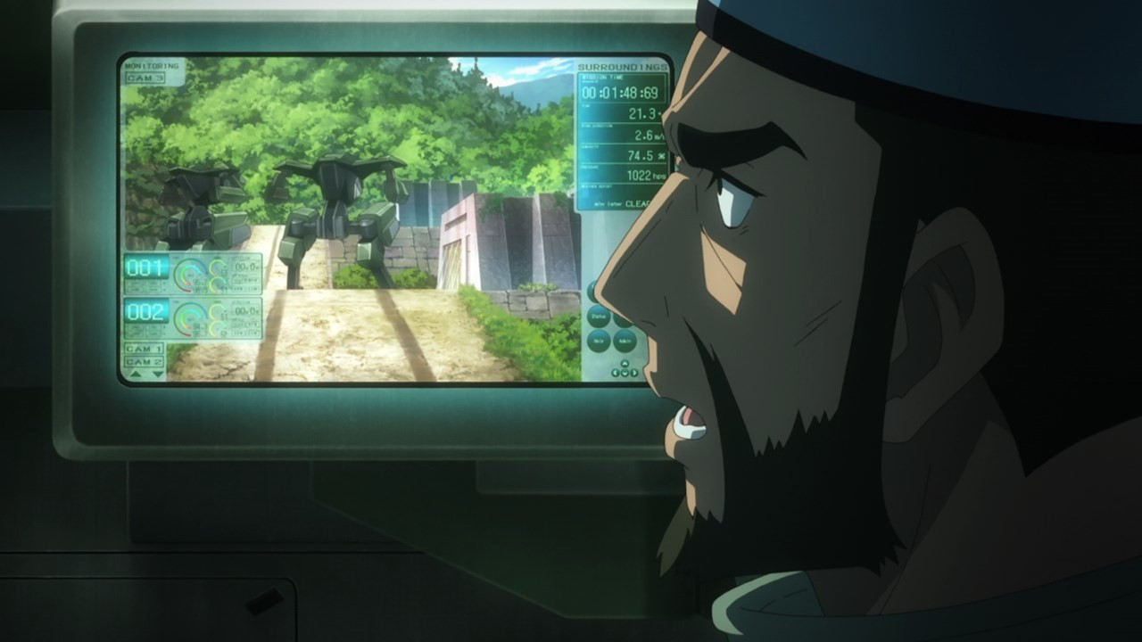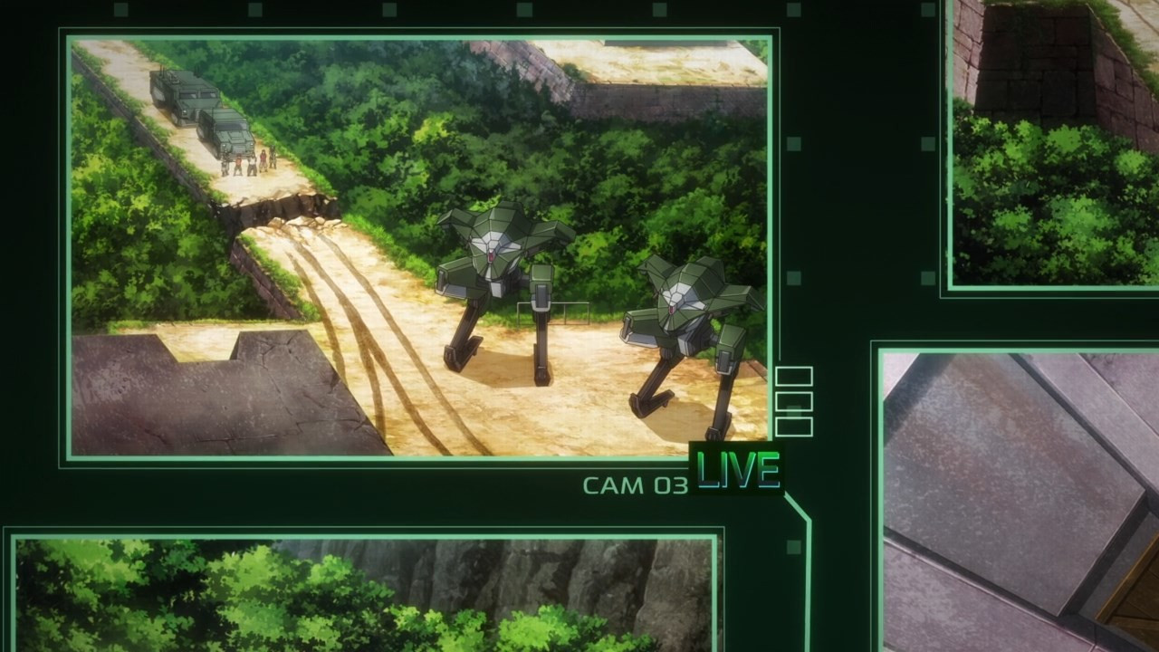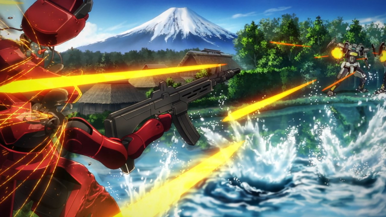 Where Kyoukai Senki starts separating from the pack, however, is coincidentally in regards to that premise. While I already mentioned Code Geass as a choice comparison it will be good to reinforce that this one will not be Code Geass: for all of Amou’s apparent smarts he’s no Lelouche, for all that Gai tries to take the comedic route he will never be C.C. Indeed outside of Japan being reduced to an extraterritorial playground Kyoukai Senki’s M.O. trends far more towards kiddy friendly Gundam than any sort of pulpy over the top thriller, as the atmosphere, characters, and array of named mecha abilities are so far more sanitized and ‘upbeat’ compared to the usual larger than life personalities which everyone often looks for in mecha stories. Mind you, still early days and all – we haven’t even rounded out the main protagonist trio yet! – but Kyoukai Senki certainly has its work cut out if it intends on going gritty over playful. After all, always takes more than a few hotheaded not-UN merc stand-ins to break the monotony of well-trodden paths.