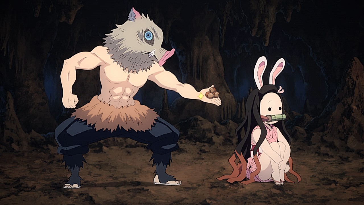 Meanwhile, Inosuke has an even less serious dream about a cave side expedition where his friends act as his bumbling underlings. I can see it serving more as a means to entertain Inosuke into diverting his attention to something more exciting than camping out on the train, but it was funny to see how everyone’s personalities shifted except for his. Shimono Hiro has always captured Zenitsu’s essence to a fault, but so far in Mugen Train, he’s been giving it his all with all the different interpretations of Zenitsu in everyone’s dreams. And with Inosuke’s dream and last week’s Rengoku praise scene, he did a great job at channeling the doofus energy that others project onto him in their dreams.