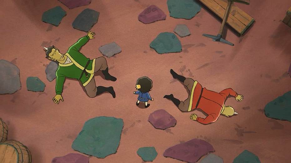 I’m extremely interested in this “amazing” additional ability Death-par speaks of, which apparently Bojji “won’t get to use too often” (maybe it was what allowed him to split the boulder). As for what we do see, it’s some very nifty martial arts-fencing hybrid stuff, with Bojji using the size of his opponents against them and employing a very impressive knowledge of human weaknesses. Death-par has given Bojji the sort of strength that fits him – the ability to subdue his opponents without killing or even harming them (much).