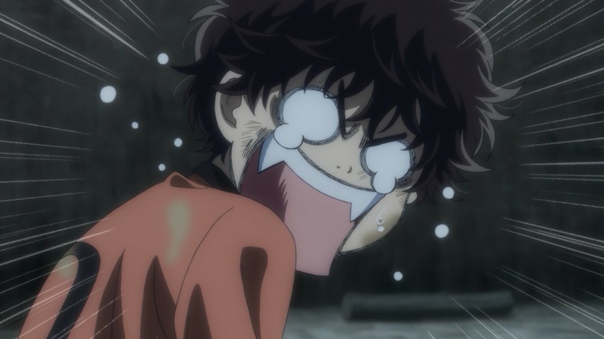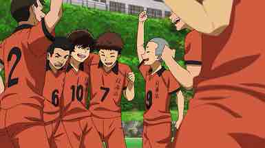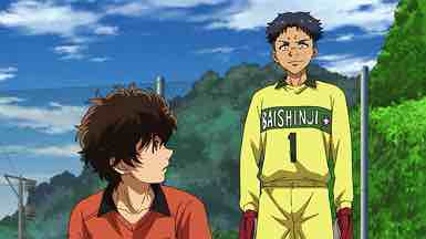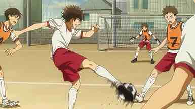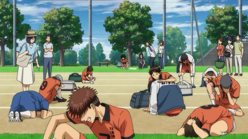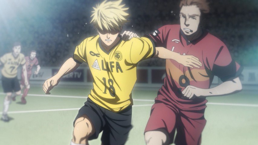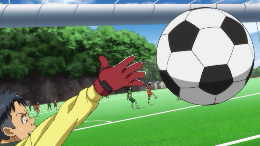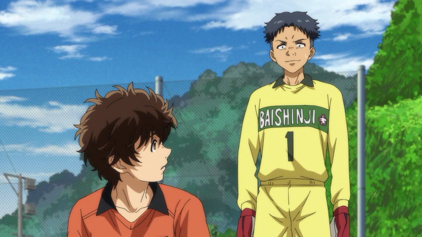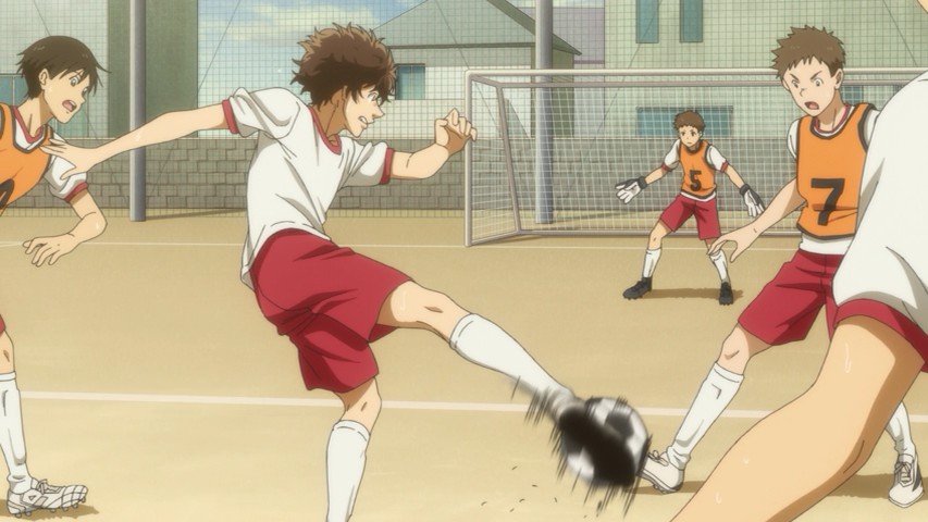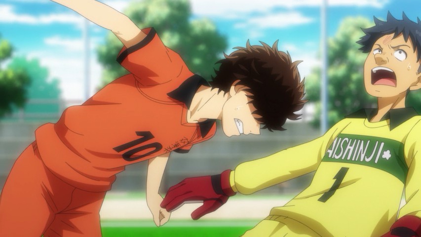The titular hero is Aoi Ashito (Ohsuzu Kouki). Production I.G. has cast a newcomer here and a teen at that, which I heartily welcome – and he’s great, though he does sound eerily like Yamashita Daiki at times. As we meet Aoi he’s carrying his backwater junior high team in Ehime through a fierce battle with a much better side on the merits of his own skill. Aoi makes no bones about the fact that he’s his team’s entire attack – and his teammates are fine with it, as they’d never won a thing until he showed up. It turns ugly, though, when the opposing goalkeeper goads Aoi into head-butting him by insulting first his teammates, then his mom. That’s an instant red card on any level if the ref sees it, much less in a middle school game.