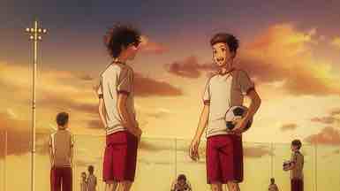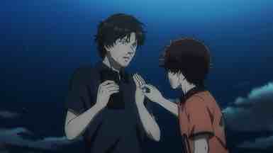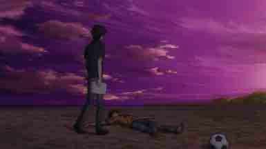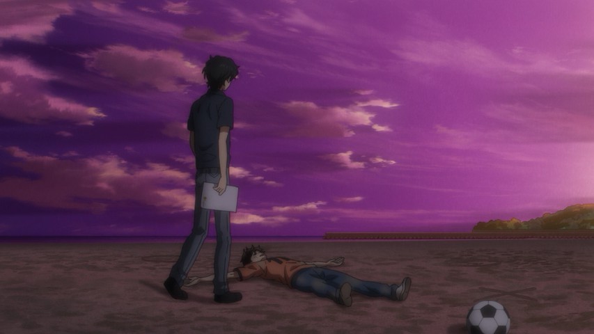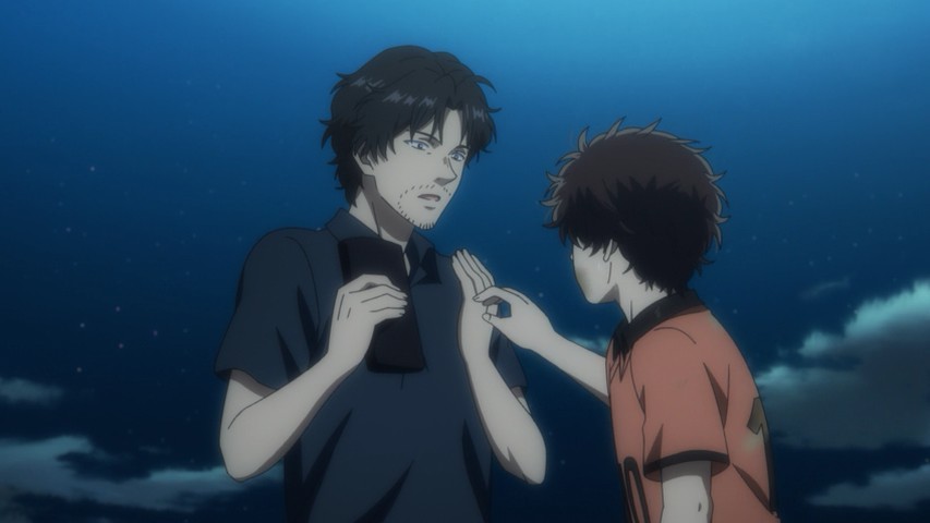 Stepping into the fray is Fukuda Tatsuya (an excellent Kobayashi Chikahiro), a youth soccer coach (“Esperion”) from Tokyo. It’s strongly implied that he was in town specifically to recruit Aoi, and he takes advantage of the situation to get some eyeball time with the lad on the beach as he’s letting off steam after the debacle. Fukuda’s mastery of Control Orientado (the high-level skill of directing the ball exactly where you want it with one touch) certainly gets the boy’s attention. And Aoi’s unwillingness to give up until he’s mastered the technique himself even if it takes all night (which it does) get’s his.