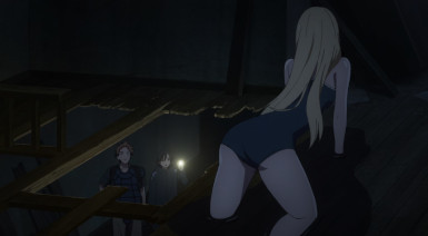 Strategy is a big element of the clinic investigation. As Shin says, Ushio is “worth of a hundred of us” in battle. But even more, if she dies first there’s no telling if she’d be able to join Shinpei for future loops. It makes sense for him to take the big risks, even if that doesn’t sit well with the others. Still, it’s Ushio (clever way to justify keeping her in the swimsuit, Tanaka-sensei) who has to go boldly in the clinic because of the spaces – the second floor, the crack in the walls – only she can get to. The real action is (of course) underground – accessible via the key she copies from the stomach of the Hiruko idol the kids find in the clinic.