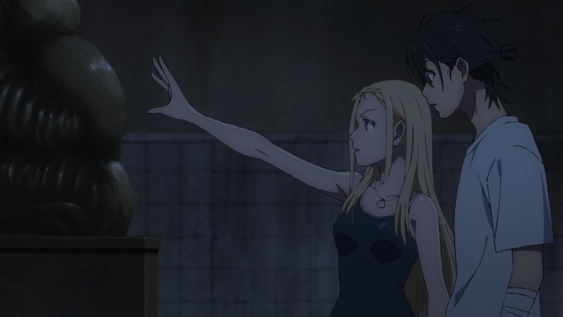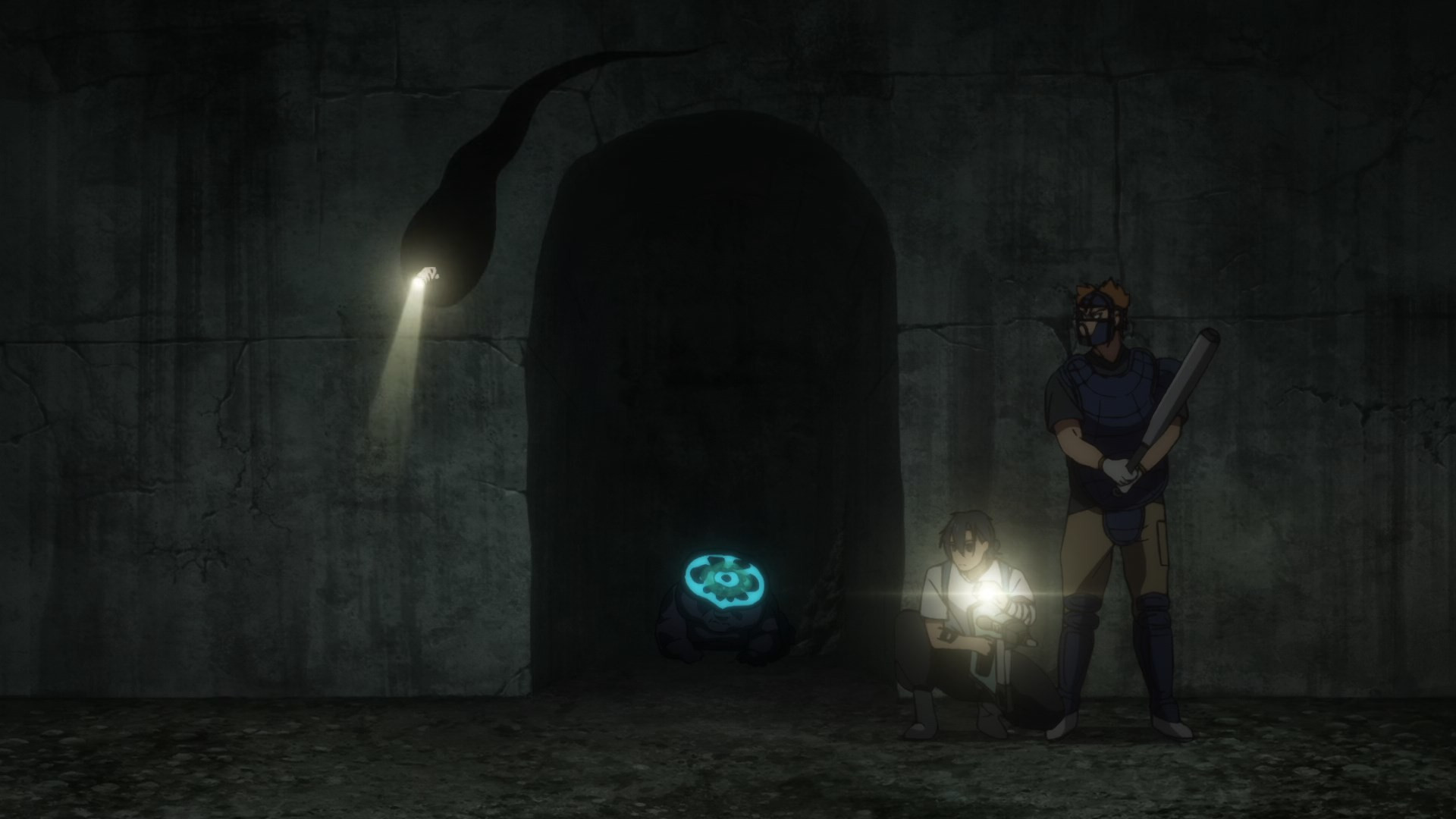 With the prefectural cops in town too (I’m withholding judgement on how I interpret that, but Tokiko is clearly displeased), things are getting more and more complicated. There’s more infodumping on shadows, as Ushio tells us that she can copy anything “as long as she has space” (there’s something very technology-sounding about that). But we also find out that machines only work when the original is destroyed. That doesn’t apply to a static shape like a key, which can fulfil its function, but to anything that requires energy to move (like a nail gun). This leads to some interesting strategery by Shinpei in using the copy rather than the original on this expedition. Also a crucial point – shadows can sense the presence of other shadows.