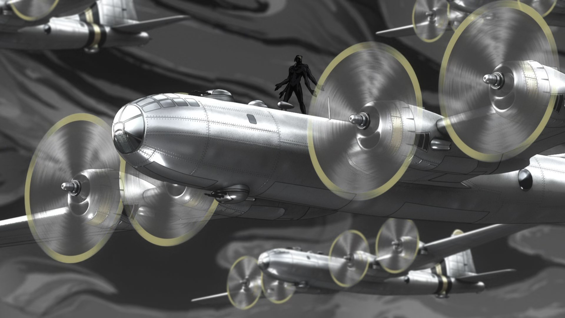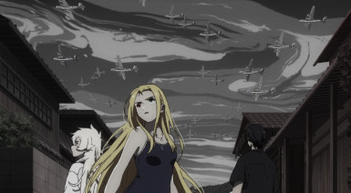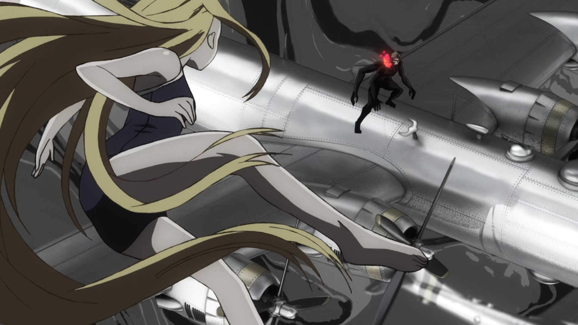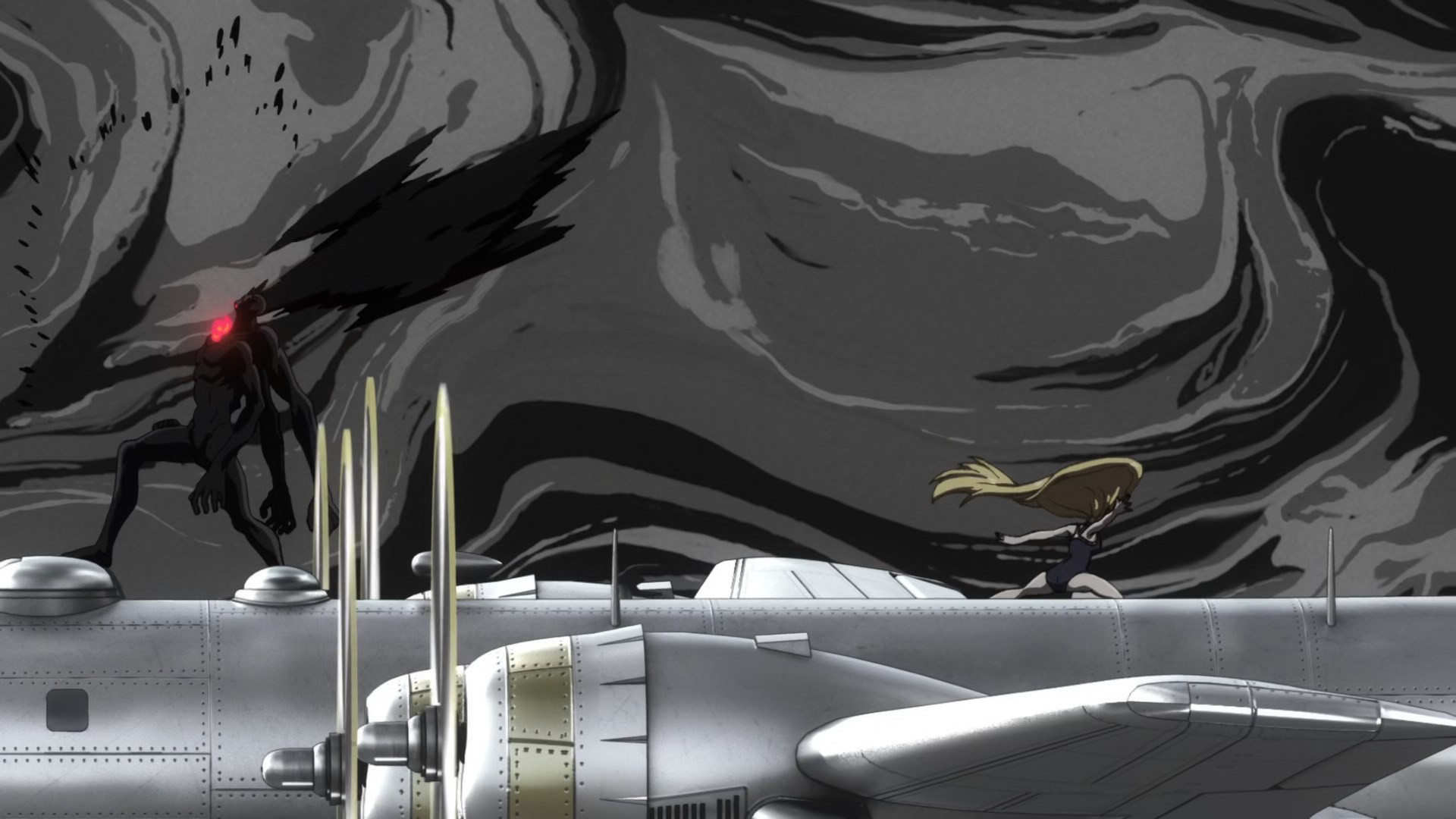 There are good reasons why Shide wanted to fight this battle here, not least that in Tokoyo Shinpei can no longer leap. That’s because as the land of the dead time stand still there, which has another important impact – Ryuu’s two-second preview is also nullified. Shide reaches into Hiruko’s memories and pulls out an air raid from WW II, with a squadron of B-29’s firebombing the area (remember those military installations), planning to burn the enemy to a crisp and steal the eyes back. This is a terrifying and primal memory for the Japanese, and it’s definitely playing literary hardball to summon it here, but I think that’s exactly the point.