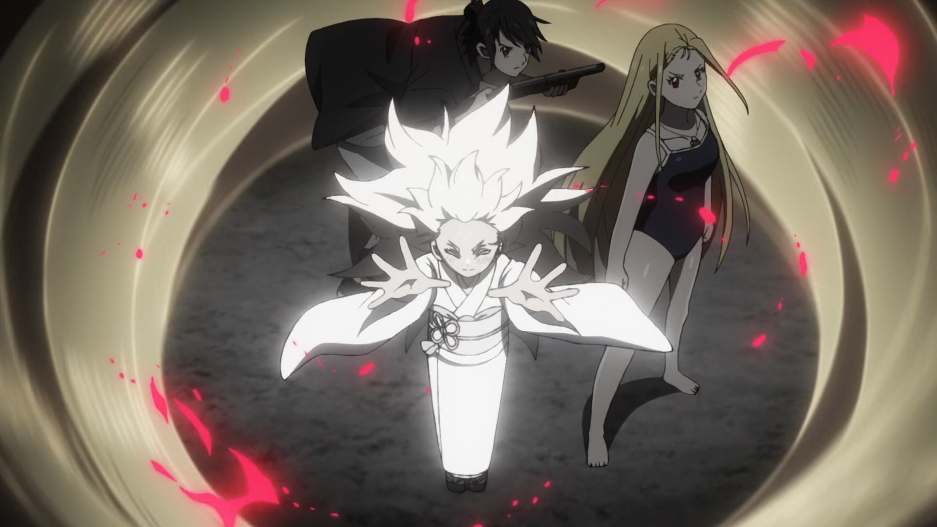 One box is checked as Shinpei officially tells Ushio he loves her, which pretty much eliminates the possibility that he pursues any end which sees her disappear along with the threat to humanity. Even following her (and Shide) to Tokoyo is a confession of sorts, since when he does it Shinpei believes he can never return. Shide goads the enemy into following him, knowing they have no choice but to do so. As it turns out there is a way to return – there has to be, since Shide plans to do just that once he’s plucked the eyes back into his possession and can execute his grand scheme (and the entire human race).