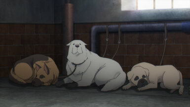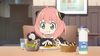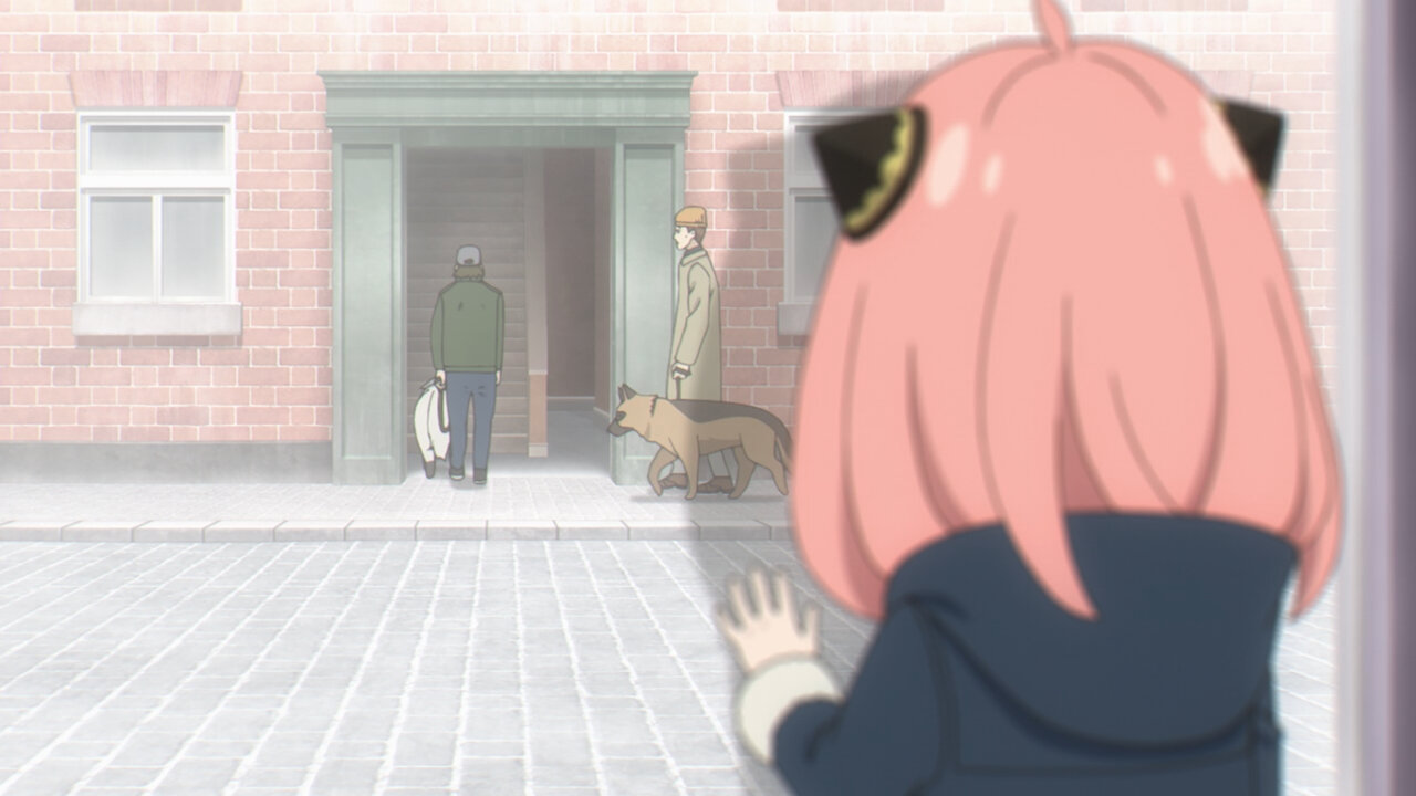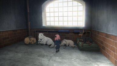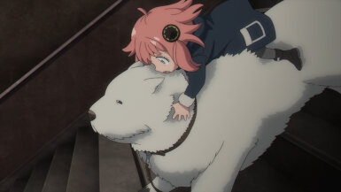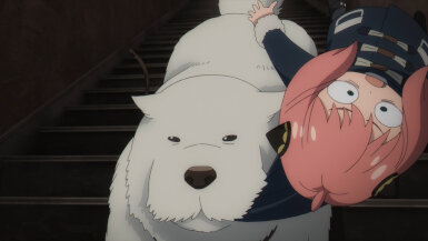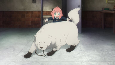Anya really does have a penchant for attracting trouble. Of all dogs, she is drawn to the one involved in an assassination scheme and then walks right into the schemers’ hideout. Good thing the dog in question has foresight abilities thanks to experimentation with the defunct Project Apple. In an incredibly adorable scene, the dog defends Anya and lets her ride him out to safety. A dog with foresight and a girl who reads minds- what a perfect duo, as if they were made for each other. The whole time I was almost expecting her to run into Loid while he was hunting for the assassins. I don’t know how she’d explain away that predicament to him. (He’d probably overlook it, like he did when she unlocked his room in the 1st cour premiere).