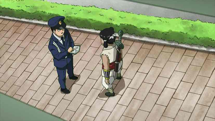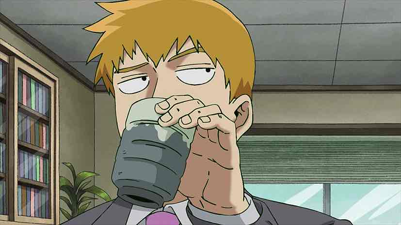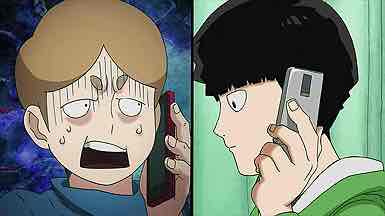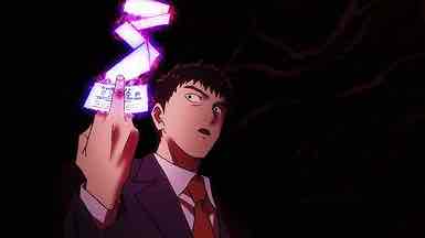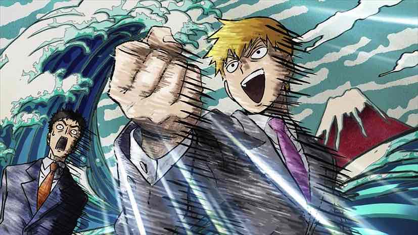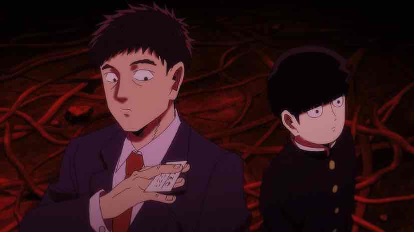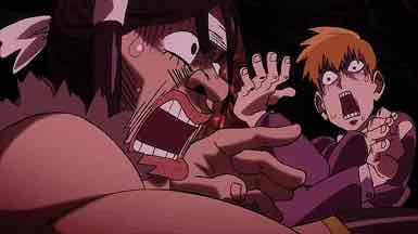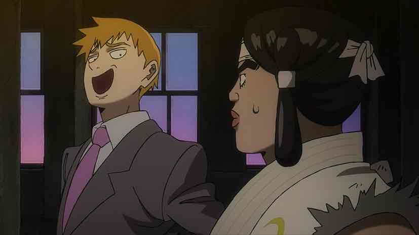 Meanwhile, a strange visitor arrives at Spirits & Such. Amakusa Harukai introduces himself as a youkai hunter, speaks in a kind of noh theater singsong, and proceeds to thoroughly annoy Reigen in world record time. Hiayama Nobuyuki is having way too much fun with this role – his performance more or less steals the episode. It’s not until Harukai slaps a million Yen wad of ¥10000 bills on the table – announcing that his rich parents subsidize his lifestyle – that Reigen decides he’s interested. Amakusa declares (in a magnificent scene where his tale is depicted on a scroll and he slips into normal speech halfway through) that a night parade of 100 demons is gathering in order to resurrect the Great Demon King, and that he needs Reigen’s help to defeat them.