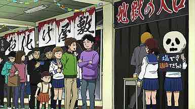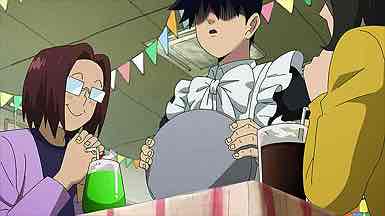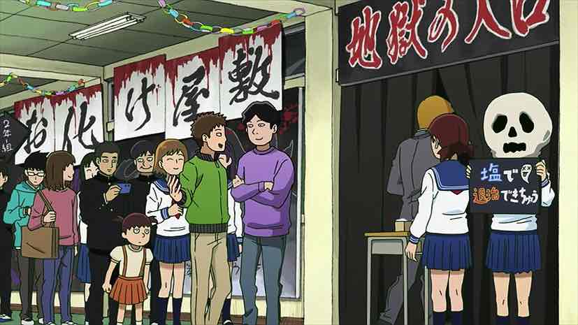 Also notable here is Reigen’s reaction – one might even say dismayed – to Mob figuring out his problem without his help. Our boy really is growing up, which Reigen will be happy about once the initial disappointment wears off. It’s not as if Mob’s designs for the haunted house exactly shake the bunkakai to its rafters, but for Mob just being able to convince the others to go along represents a sizable step in his social development. As for Ritsu, his social development is the last thing he’s worried about, though he does prove to be quite the hit with the local moms.