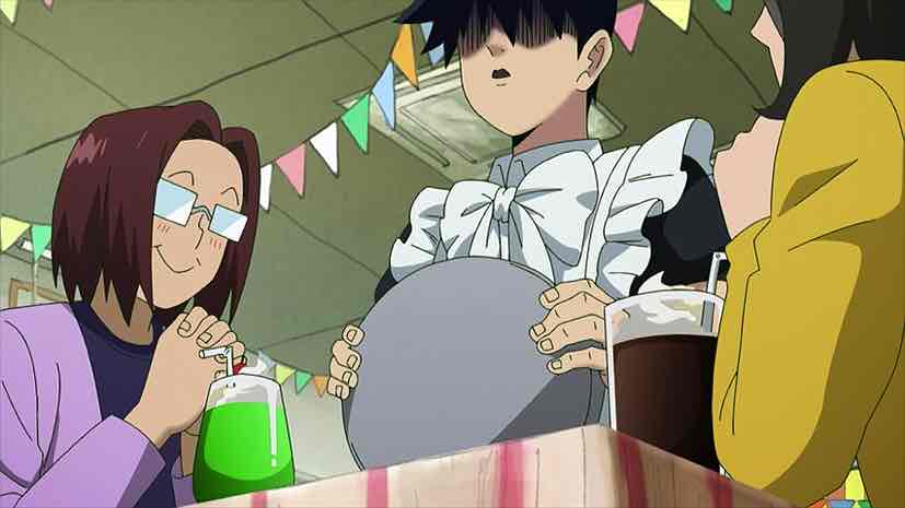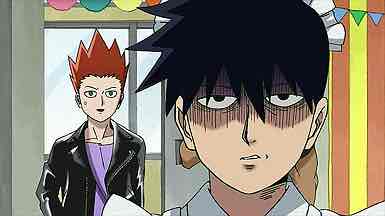 The story here was a two-pronged attack, starting with Mob’s culture festival coming up at school. He gets drafted along with three other boys (including Inuyama) to design the costumers for the class’ haunted house. The others, being middle schoolers, are keen to buy some white sheets and call it a day, but as ever Mob is constitutionally unable to half-ass anything. This is an interesting tug-of-war between the two halves of his personality – his shy, conflict-avoiding side doing battle with his relentless drive to take things seriously. Meanwhile Ritsu’s class has decided to do a cross-dressing maid cafe – a prospect he finds so horrifying that he tries to use his place on the student council to get it banned.