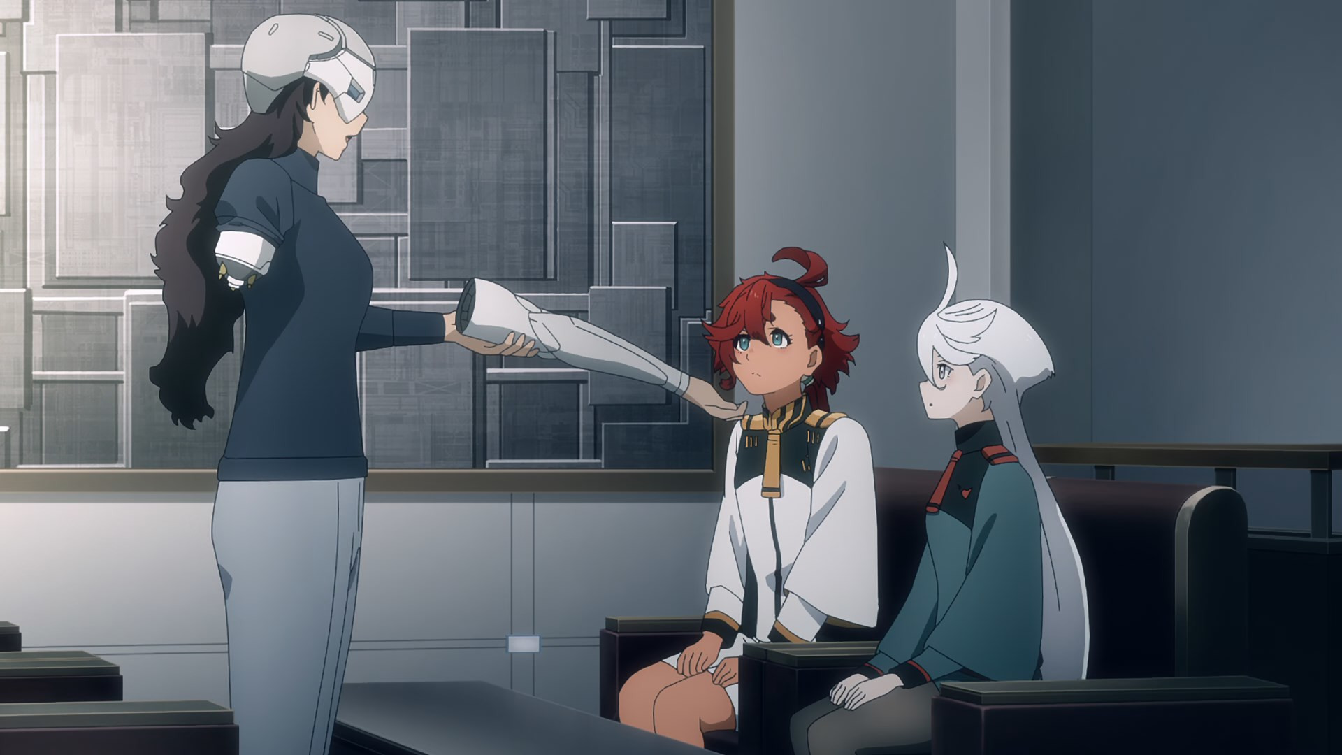 At the very least, the episode has made it clear that this is not healthy for Suletta. Prospera’s “for your own good” justification, surrounded by a halo, sounds deliberately manipulative and it’s raising Miorine’s eyebrows. As Miorine says, Suletta is overlooking the really important questions, whcih contrasts with Shaddiq’s going against his father’s wishes to do what he thinks best for the group and himself.