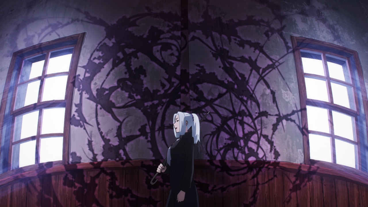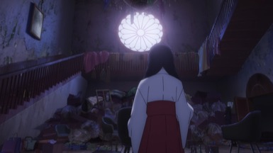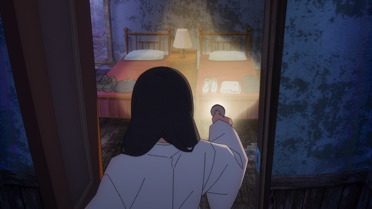 This shot reminded me a lot of the noose scene in Silent Hill 2, as the camera frames Utahime outside the loop, showing her discomfort. Unlike James, she’s not part of the situation, and both the camera and framing make that so. She lets out a small war cry, as she barges through every door – once again the show is relieving tension asking us to lower our guard, by using its funny bone. When she reaches the final room, she comes up to a set of well-made beds, with clothes left on the bed frame, another hint of suicide.