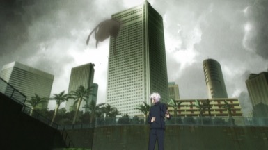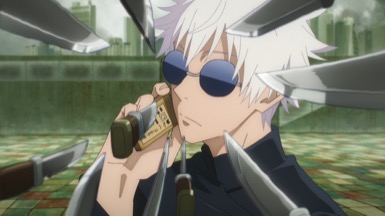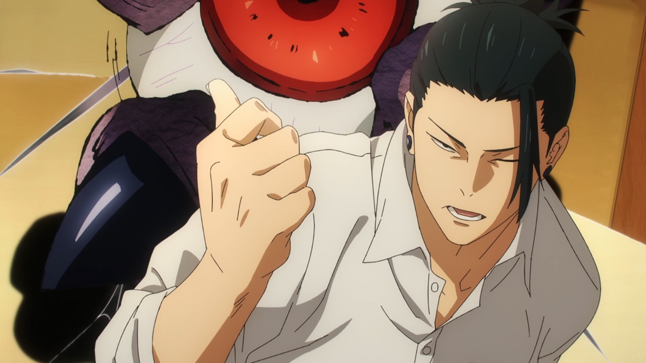 The rest of the episode pretty much serves to help us understand the plot behind the Hidden Inventory arc. Tengen-sama. I might not want to talk about him just yet to avoid spoilers, but all you need to know is that he’s immortal, and is looking for The Star Plasma Vessel, which is a candidate for him to transfer his consciousness into. Gojo and Getou are tasked with protecting her. A group of terrorists only known as Q are after the Star Plasma Vessel, things take a turn when Getou is going up to her room only to find that a bomb has been placed, thankfully The Star Plasma Vessel is fine and just thrown out the window, Getou saves her promptly, and Gojo has to fight a guy with knives! But before the episode ends Fushiguro (Koyasu, Takehito) makes an appearance, you might know him as Zen’in, only for the credits to roll after his face reveal!