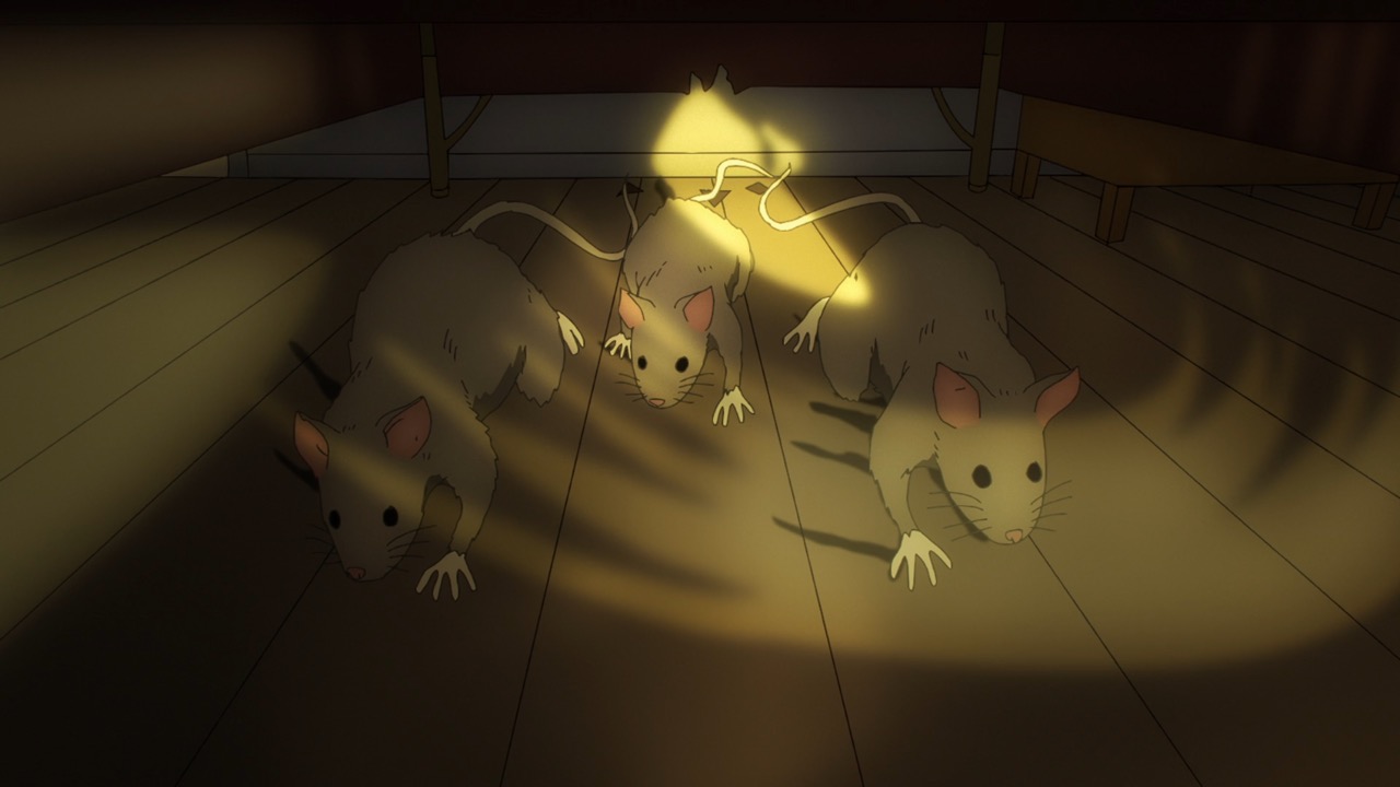 Of course, it’s a fake out and Utahime runs away from the silly cute rats currently burrowing under the bed. The tension is pulled and we might find her reaction comical, but every fake-out needs a jumpscare following it, in this case, Mei-Mei touches Utahime’s shoulders and she screams her heart out. To us all of this is just typical Jujustu fun! But poor Utahime shoulders the burden of your one-two-three jumpscare rule.