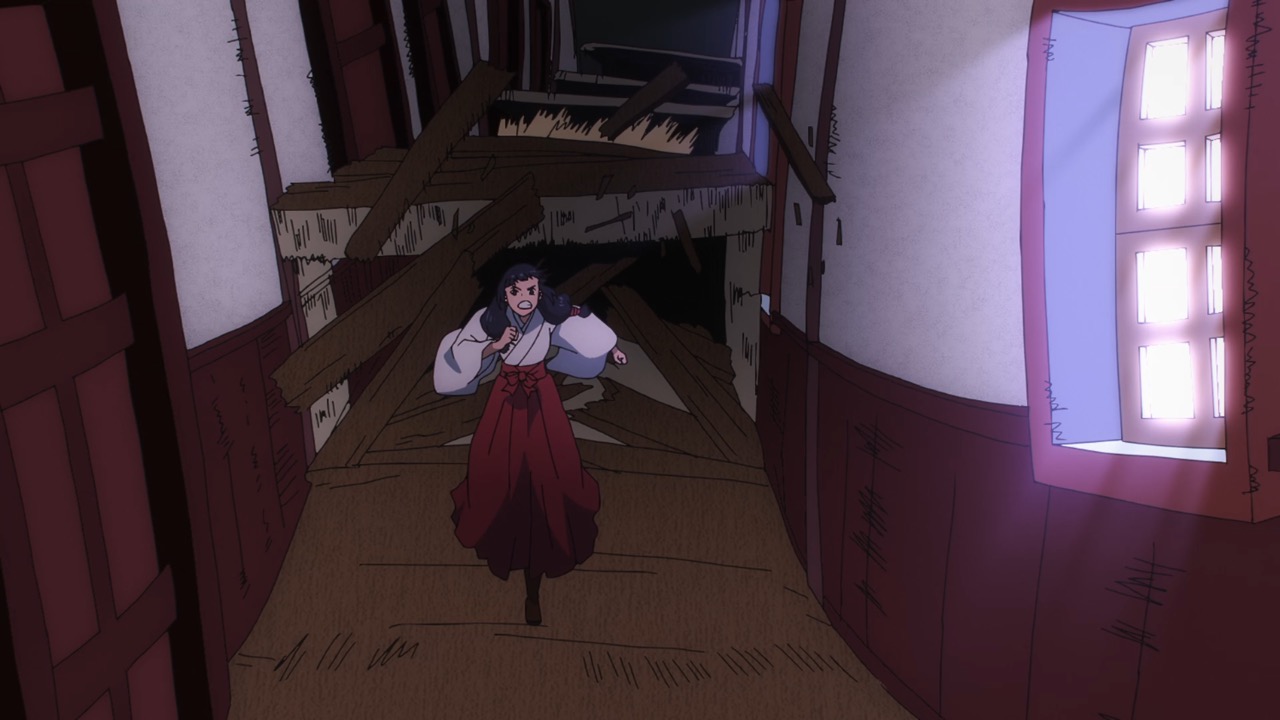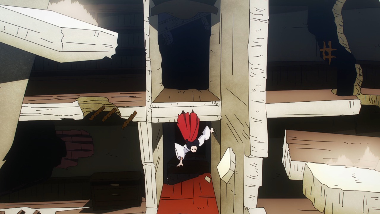 As the sorcerers run along the corridor, we get our first glimpse of “Sakuga” animation – highly detailed and fluid moments that stand out from the rest of the episode. The corridor twists and turns and the camera work becomes even more complex. There might have even been a dolly zoom used, adding to the dramatic effect. In fact, the scene reminded me of the twisting corridor in the Forest Temple in Ocarina of Time or the rotating corridor in Inception.