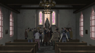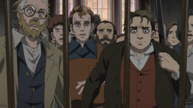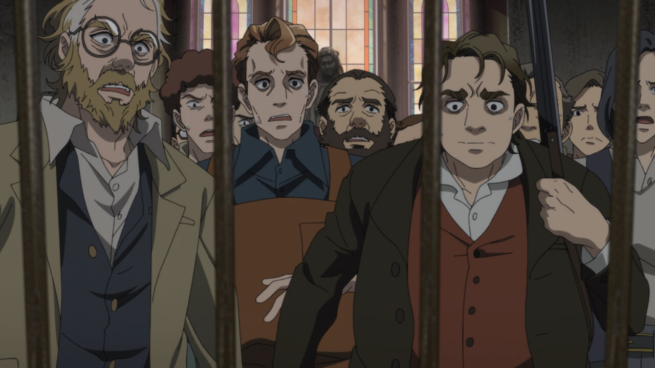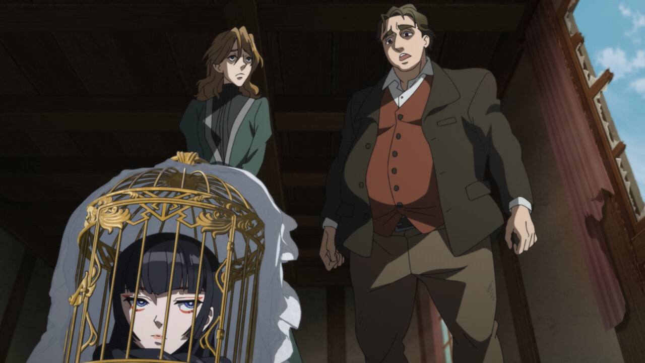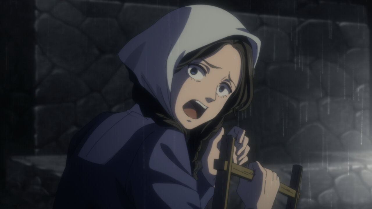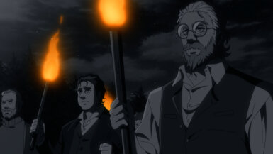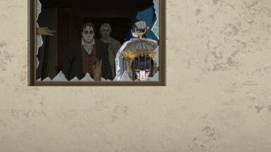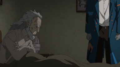It was kind of matter of course that the bite-mark evidence was a copy of Goethe- I was starting to wonder when some reference to that would show up. The bite marks on Tsugaru’s handkerchief and the ones on the book matched, suggesting the same culprit more than a copycat, though I’d be skeptical of that until I saw the actual teeth. Whereas the family hyper focuses on the bitemarks, a potential clue that gets suspiciously brushed off is the rifle that went missing around the time that the supposed werewolf attacks began. We witnessed an “Oh shit” moment when the old guy tried passing off the werewolves’ location as someplace completely different from the “Forest of Fangs”, only to find out his BS wouldn’t stick- something smells here and it isn’t the werewolves (or is it?). I have a hunch the gang is a lot closer to the werewolf town than the people living there would have them believe.