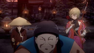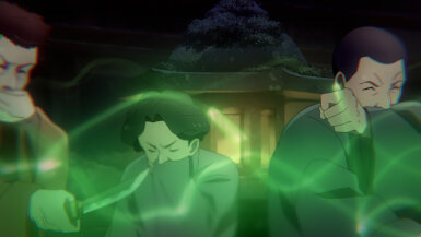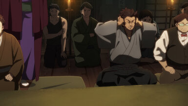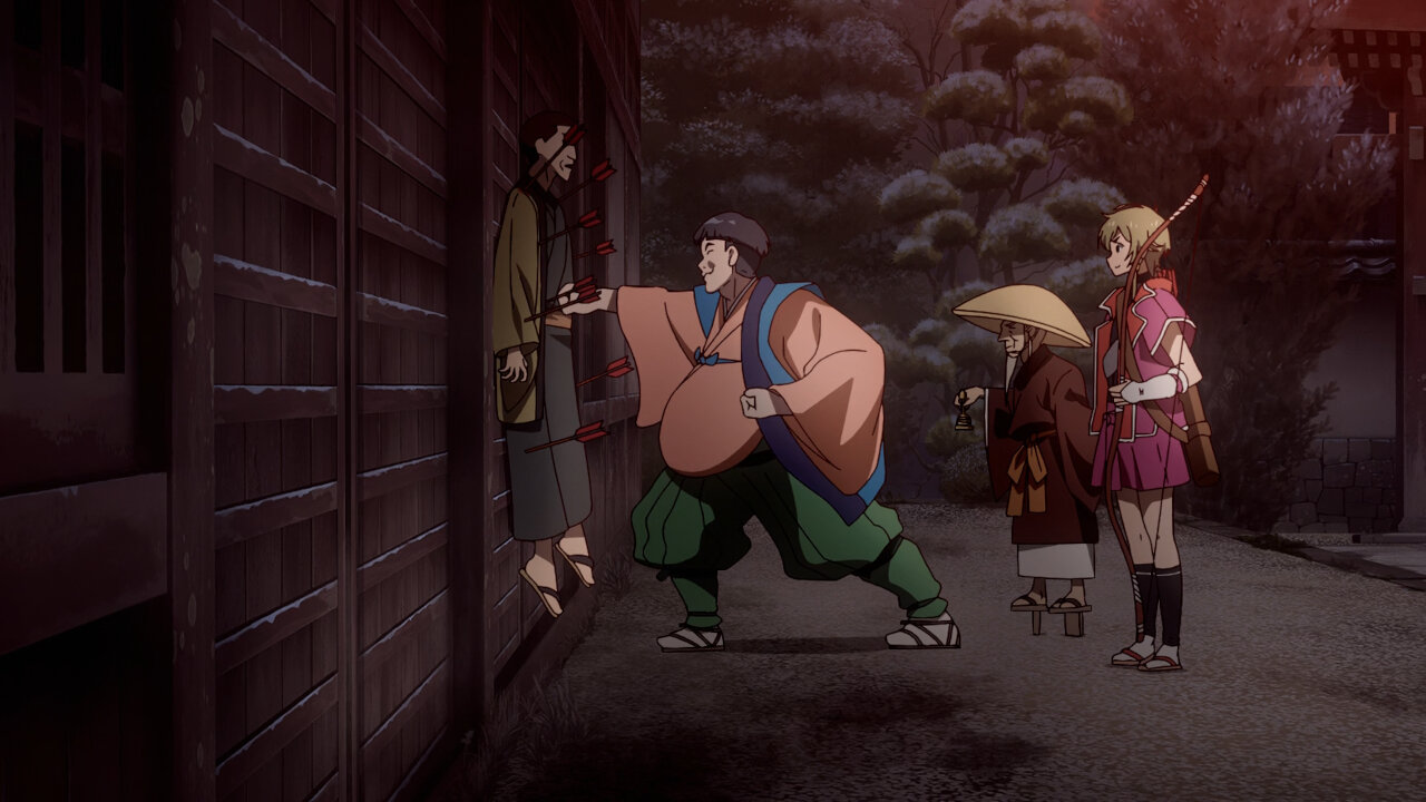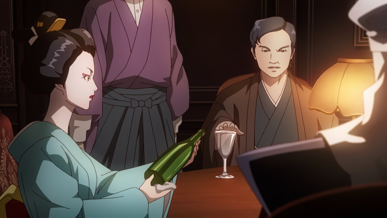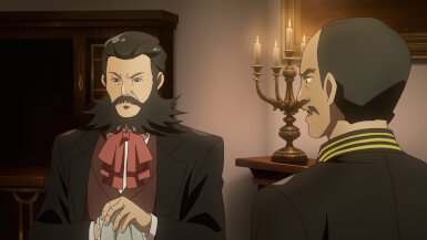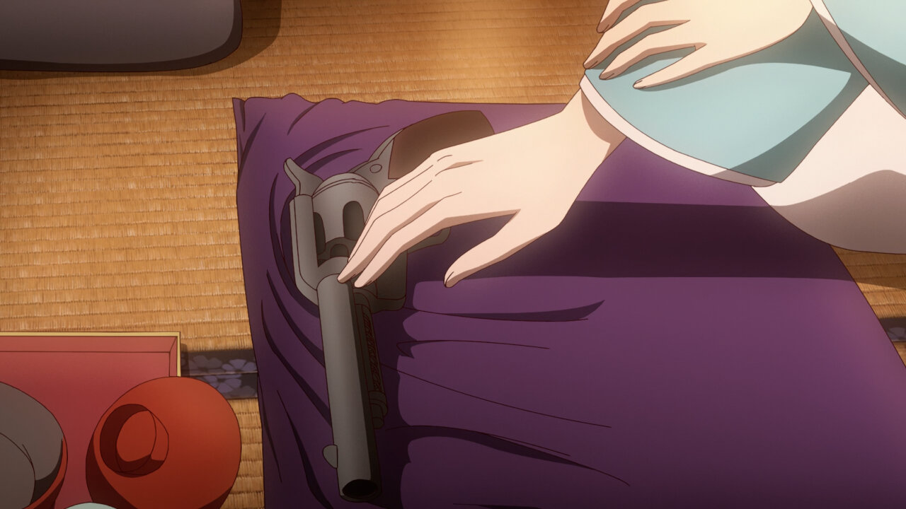 The Sumire-Origasa-Meiji government is only just one part of the story. We also have Kyoushirou Shuragami (Mikami Satoshi)who shows up at the gambling den. Not sure what his deal is, but he has a sharp eye, catching the dishonest game-master red-handed. It doesn’t seem like he came for money, turning down the hush bribe offered, then leaves shrouded in mystery. He’s got some pretty bizarre friends there- the Buddhist monk with the hallucinogenic incense, the Catholic archer girl, and the guy with the knock-out punch. Again, we don’t know what their angle is, whether they’re acting on their own self-interests or part of some underground force, but they add extra color to the cast of characters.