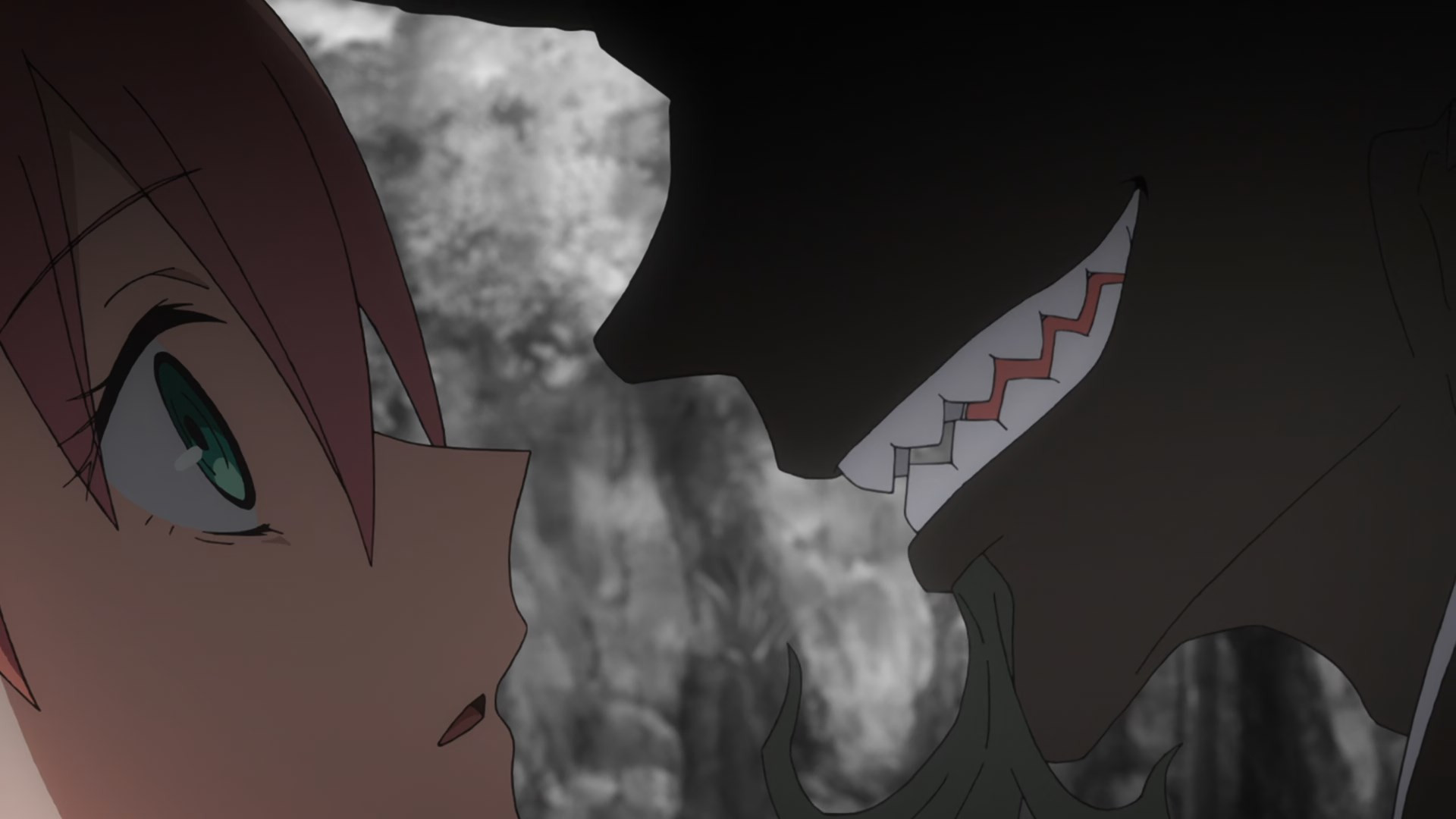 The focus at the start here is the monster the Dangaisyuu went to battle with at the close of the premiere. And the two monks sent to deal with it are no match for the creature called Shakugan. Fortunately for them Jinka intervenes and saves them, even carrying the pair to safety as they flee. It may seem odd for Jinka to save katawara-killing humans from a (seeming) katawara, but things are never quite straightforward with the world reform siblings.