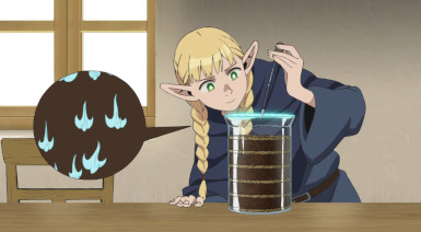 The notion of a dungeon ecosystem is a rather prominent feature in Dungeon Meshi. Usually it’s been Senshi who’s brought it to the surface, but this time around we get a sense of how Marcille is focused on the idea. We see a very direct continuity here, with things picking up immediately where last week left off – to wit, Laios being wracked by the agonies (thoroughly deserved, it must be said) of his foolhardy dining choice. Marcille slept through her assignment to give him some healing boosters during the night, but Laios has more of less gotten through the worst of it.