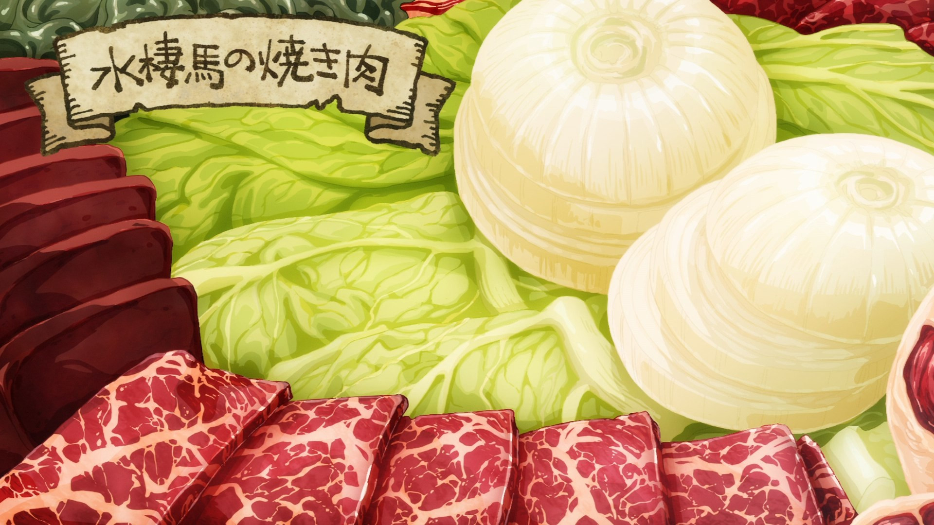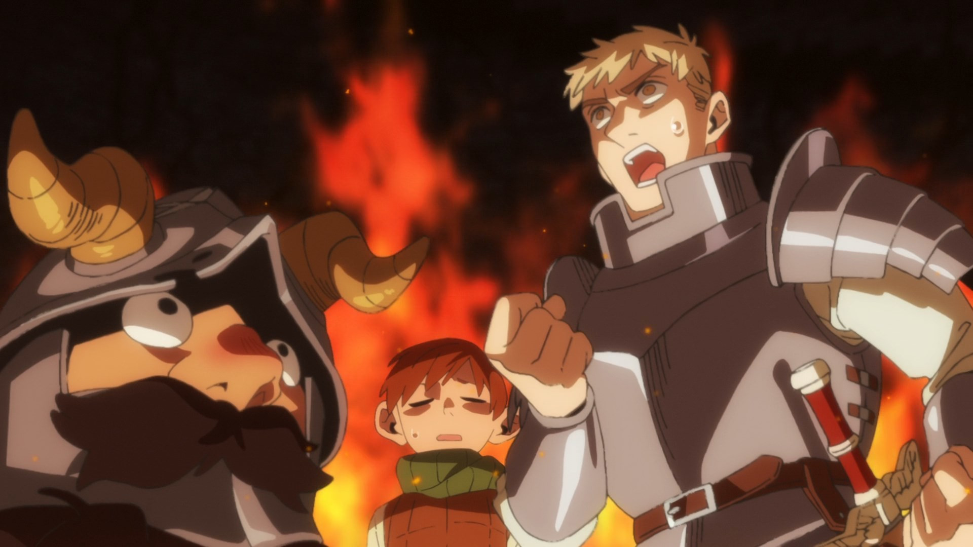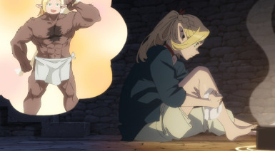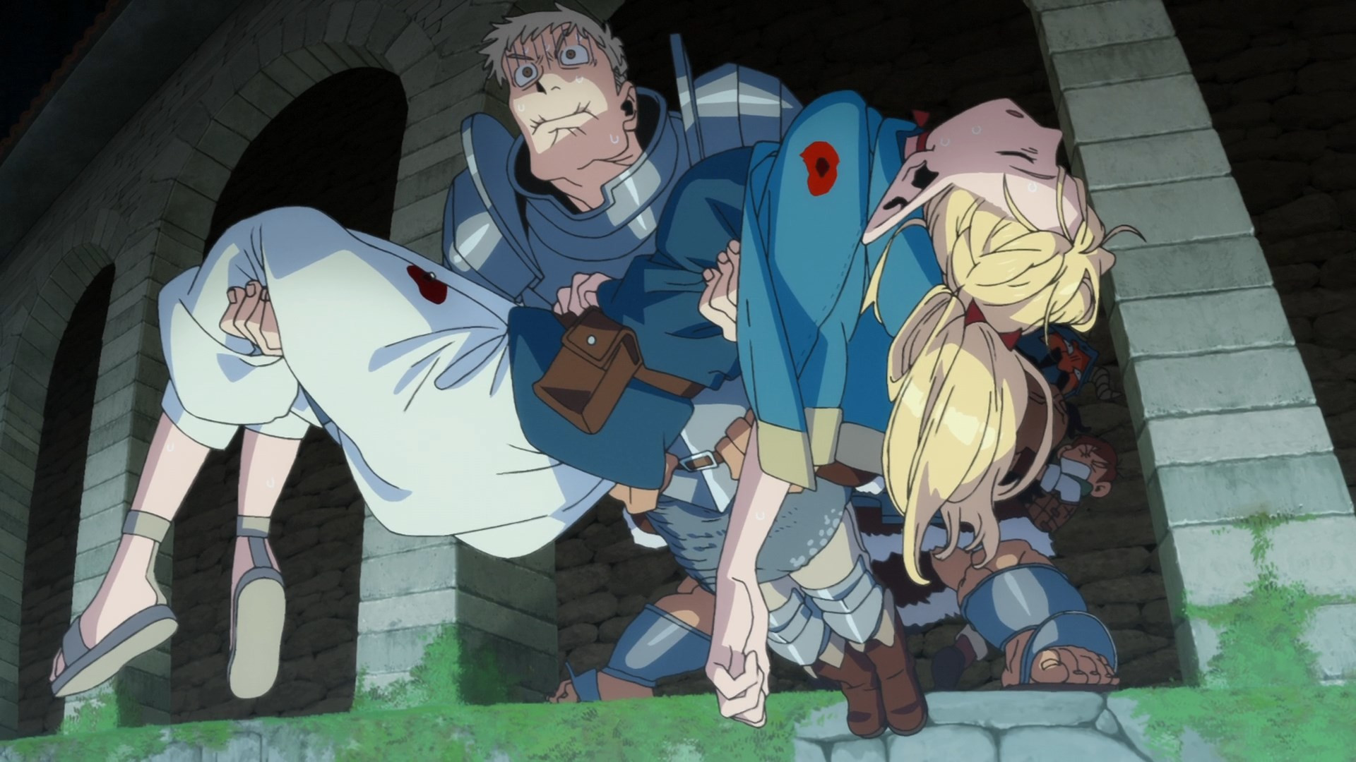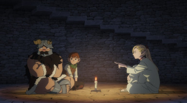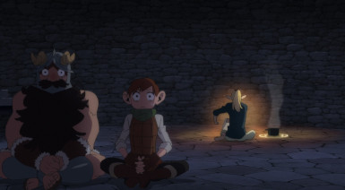 Not for the first time, the practical import of Falin’s absence is keenly felt here. Wounded in fighting the undine, Marcille is in real trouble – even after Laios rouses himself to lend a hand and lead their escape. She loses a lot of blood and magic, and no one else in the party can do much about it. All they can do is feed her – Laios hits on the idea of yakiniku once he confirms that Senshi has saved the kelpie’s liver along with the rest of the meat. That can help blood production, but there are no shortcuts to getting her mana back. That leaves the group vulnerable not only to potential injury, but unable to cross the watery obstacles between them and the red dragon. They’re about to have company however – and none too thrilled that someone is grilling meat in this location.