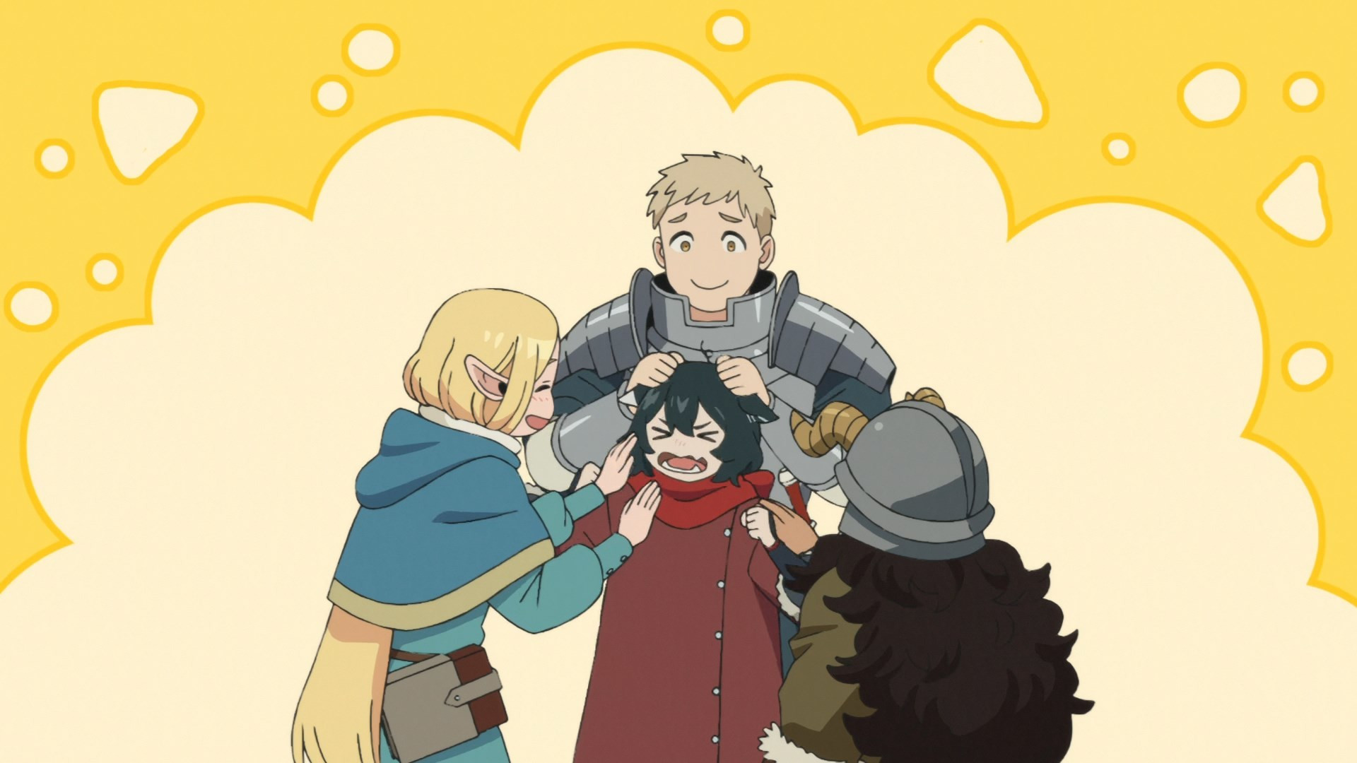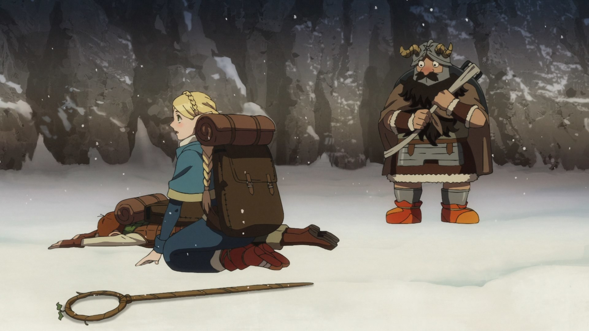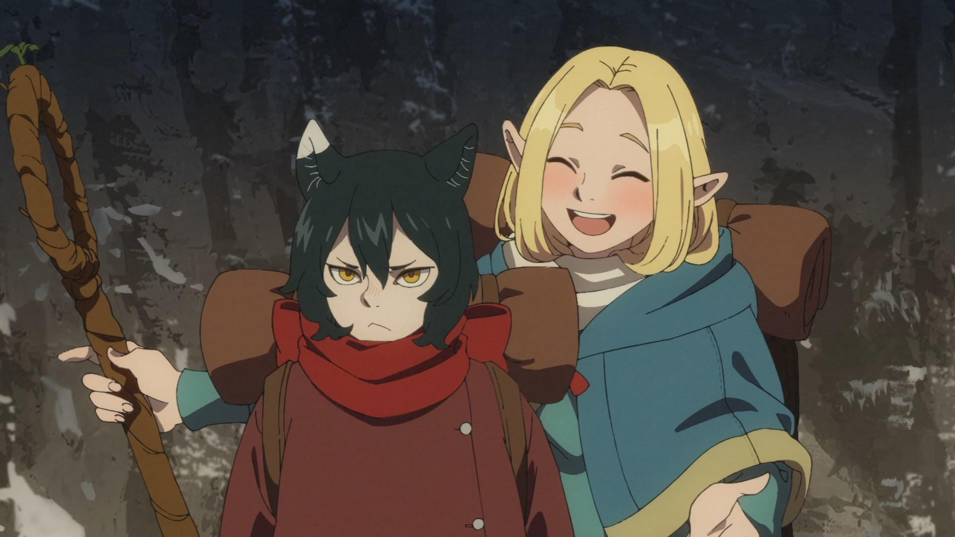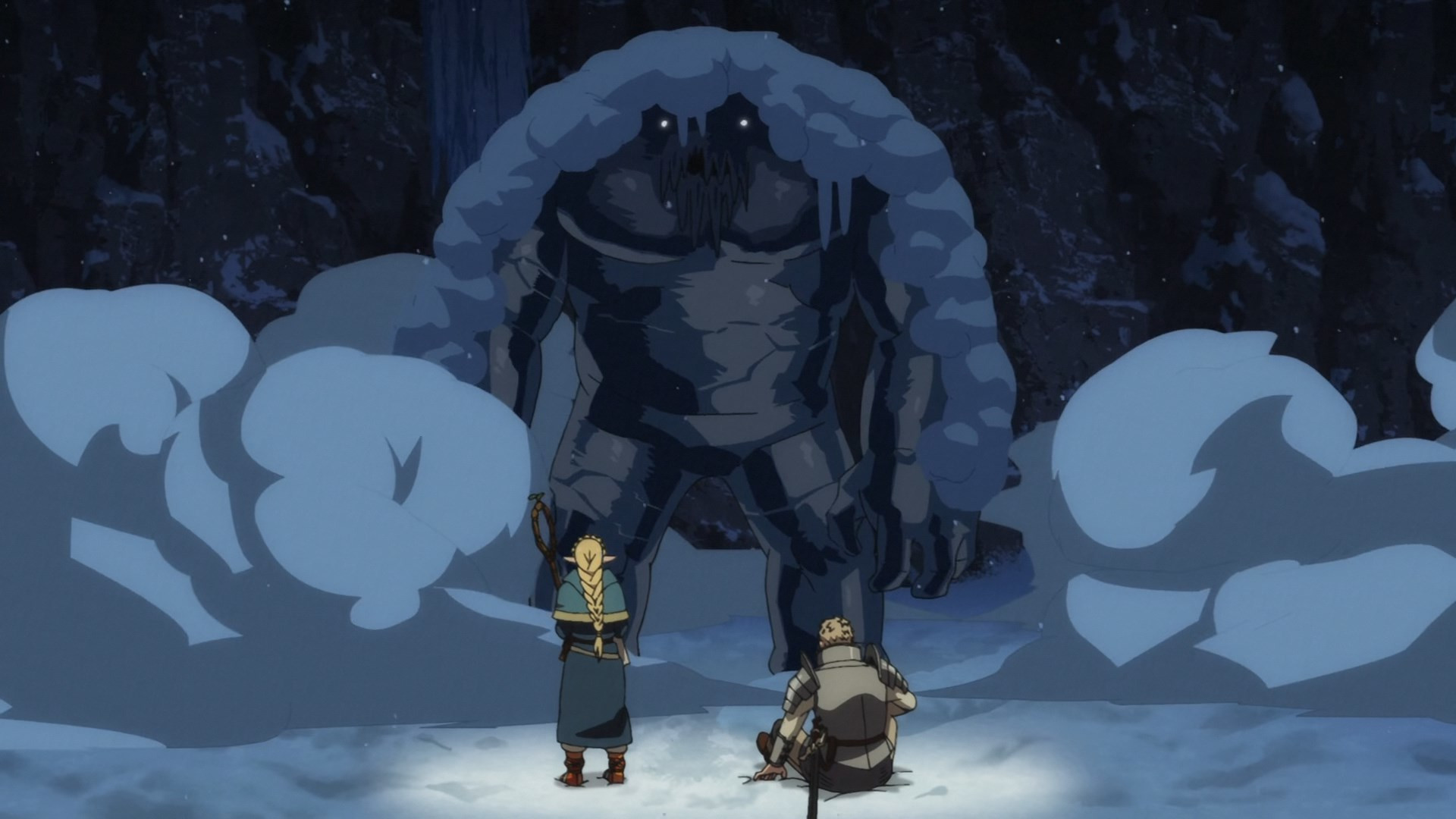 Fresh with a tweaked OP adding Izutsumi, the now five-strong party is right back into the storm, literally. As a blizzard rages they keep pushing forward, eventually making their way to where they left their gear. It’s been ransacked, but apparently by beasts – only the food (and Marcille’s soap) has been taken. Izutsumi tries to take a little bit for herself, but the sharp-eyed Chilchuck catches her in the act. The catgirl makes a very unkind remark about half-foots – that they got their name because so many of their kind had half their foot chopped off for stealing (this information is neither confirmed nor denied by Chilchuck) and the pair of them are squarely off on the wrong foot, half or no.