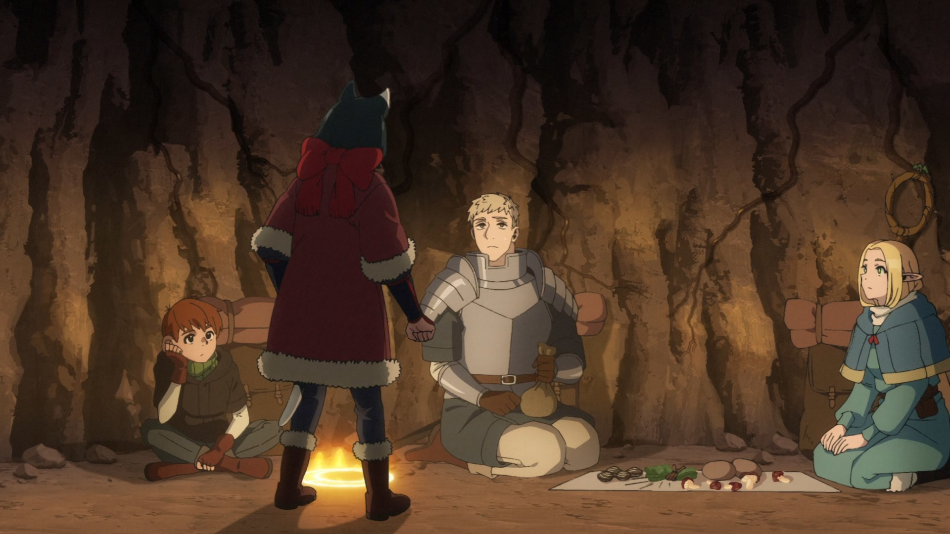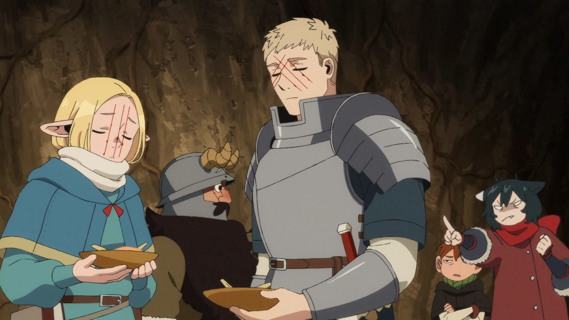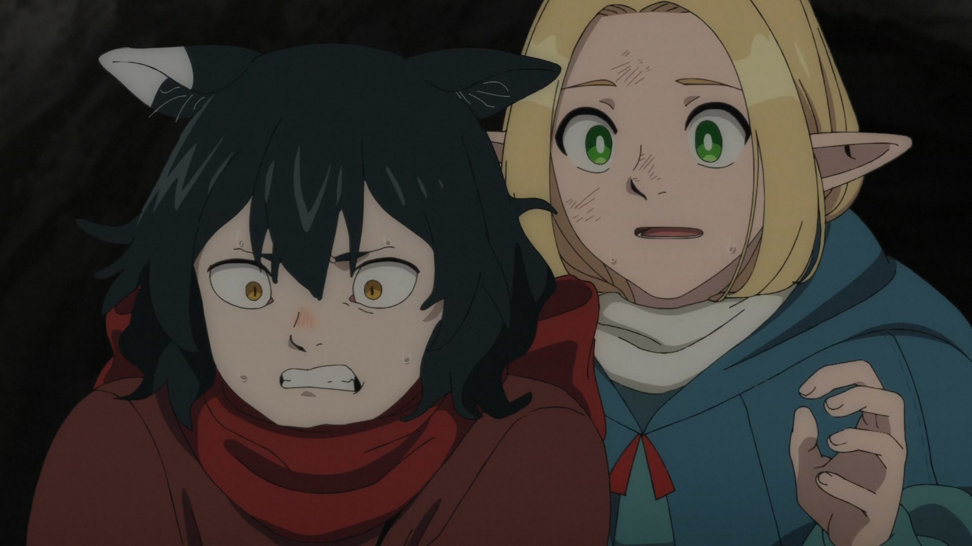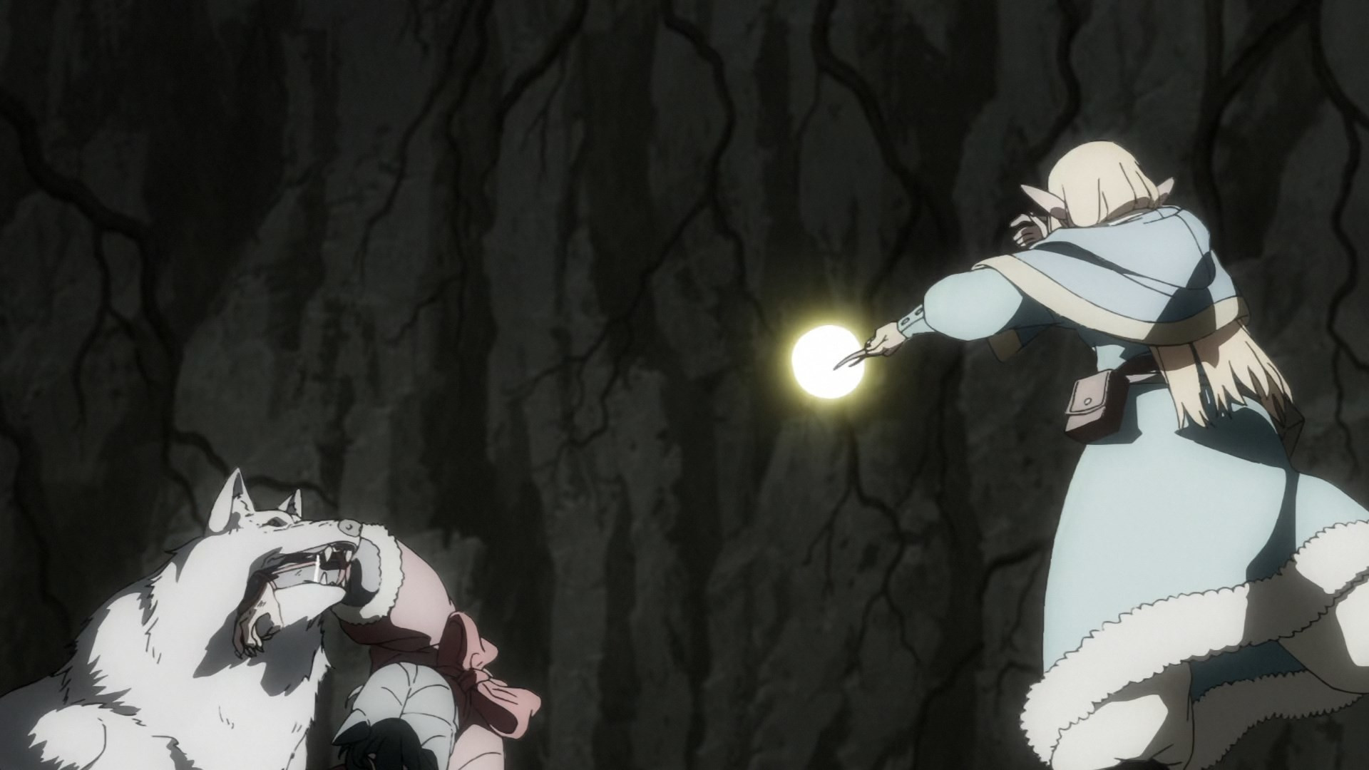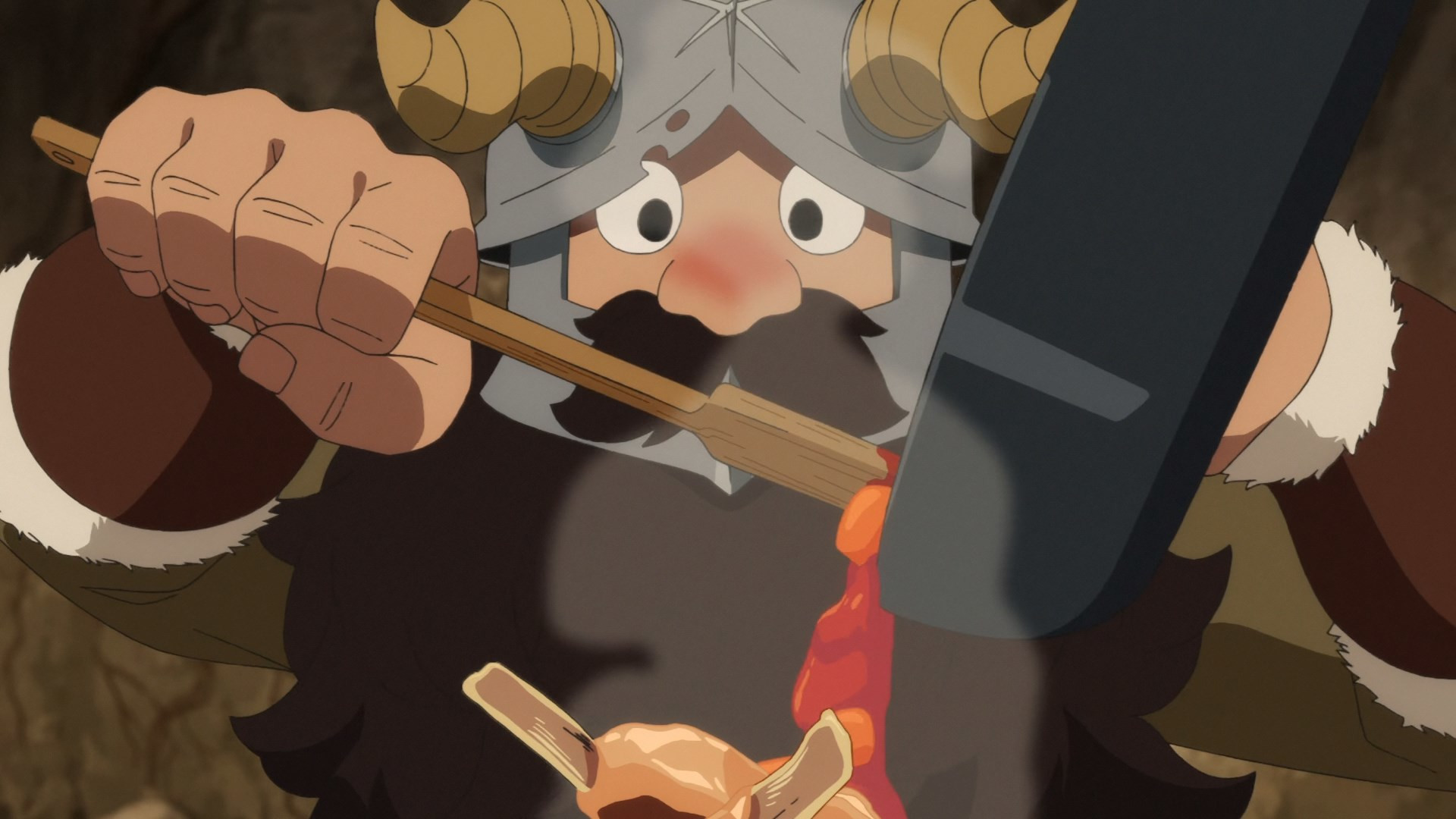 Fresh with a tweaked OP adding Izutsumi, the now five-strong party is right back into the storm, literally. As a blizzard rages they keep pushing forward, eventually making their way to where they left their gear. It’s been ransacked, but apparently by beasts – only the food (and Marcille’s soap) has been taken. Izutsumi tries to take a little bit for herself, but the sharp-eyed Chilchuck catches her in the act. The catgirl makes a very unkind remark about half-foots – that they got their name because so many of their kind had half their foot chopped off for stealing (this information is neither confirmed nor denied by Chilchuck) and the pair of them are squarely off on the wrong foot, half or no.