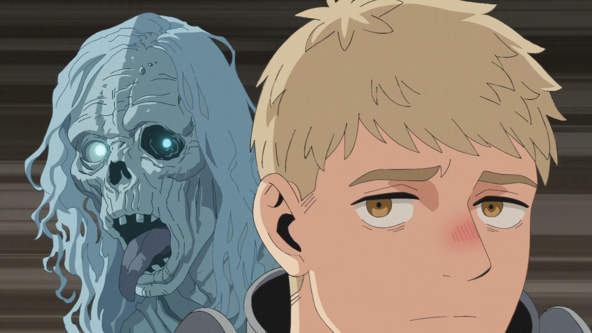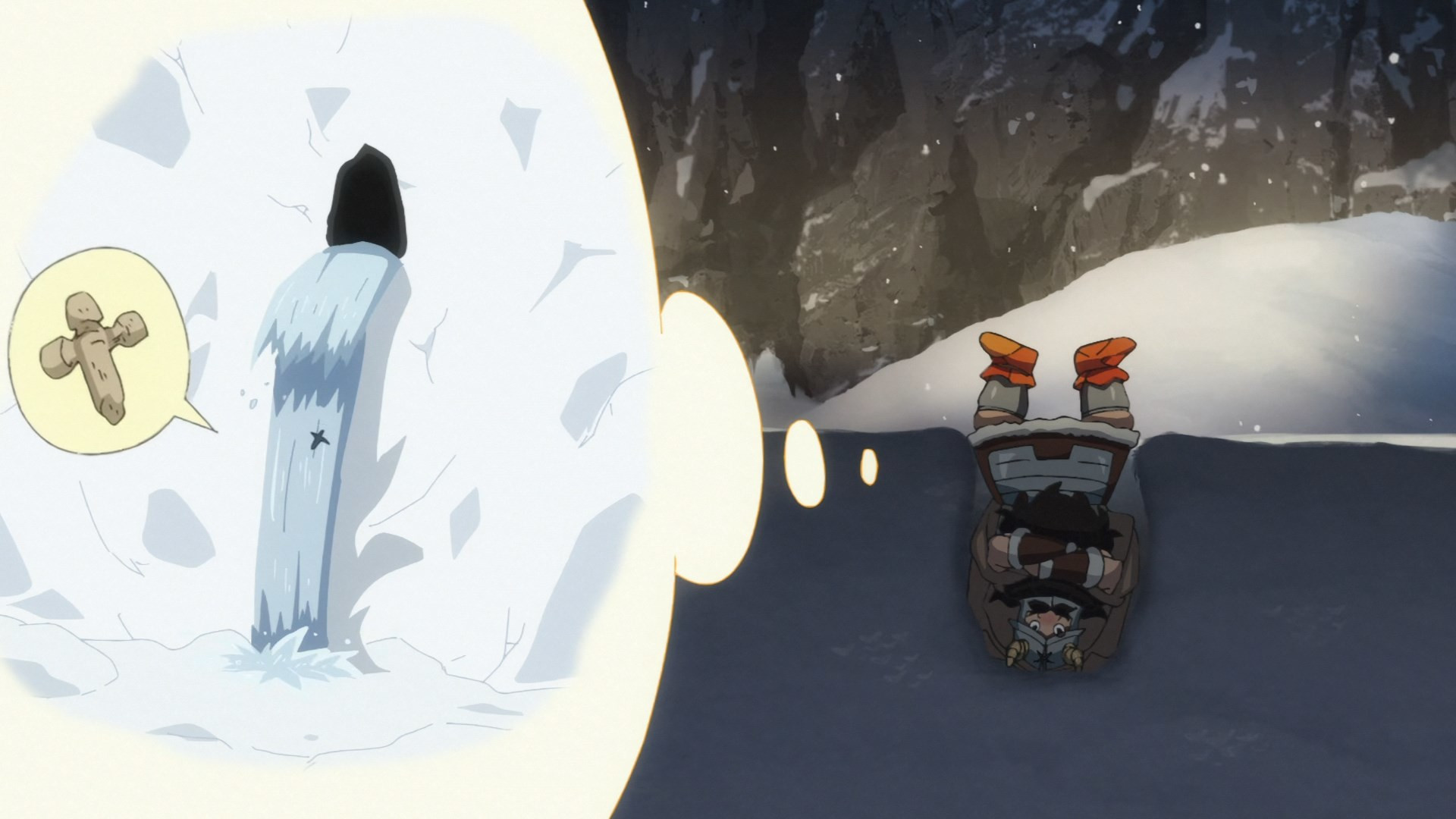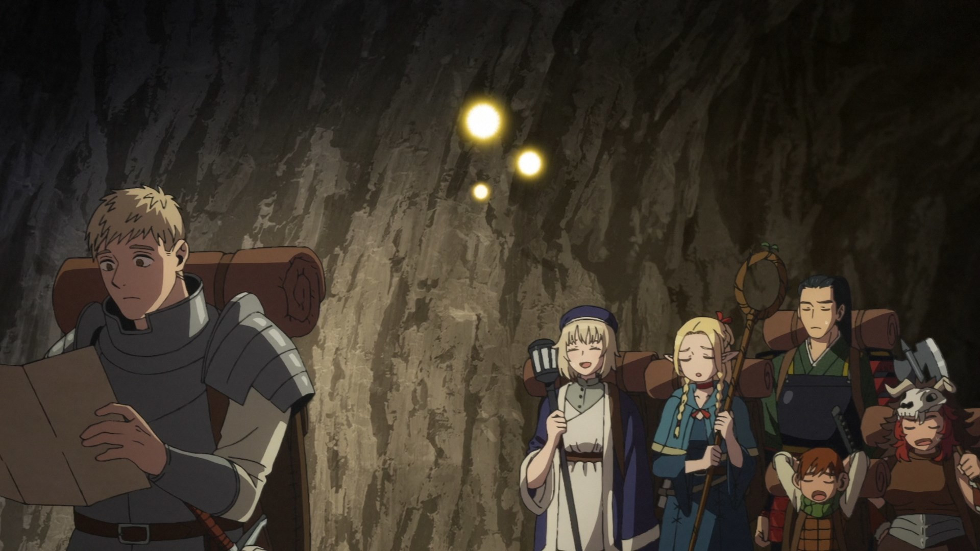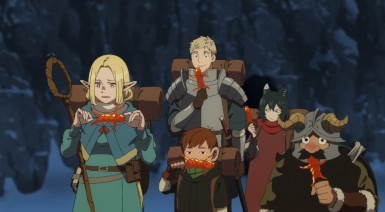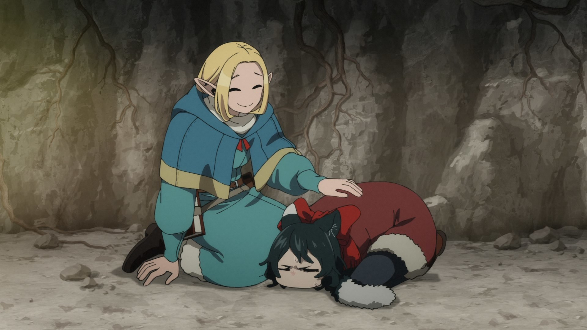 Fresh with a tweaked OP adding Izutsumi, the now five-strong party is right back into the storm, literally. As a blizzard rages they keep pushing forward, eventually making their way to where they left their gear. It’s been ransacked, but apparently by beasts – only the food (and Marcille’s soap) has been taken. Izutsumi tries to take a little bit for herself, but the sharp-eyed Chilchuck catches her in the act. The catgirl makes a very unkind remark about half-foots – that they got their name because so many of their kind had half their foot chopped off for stealing (this information is neither confirmed nor denied by Chilchuck) and the pair of them are squarely off on the wrong foot, half or no.