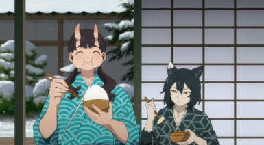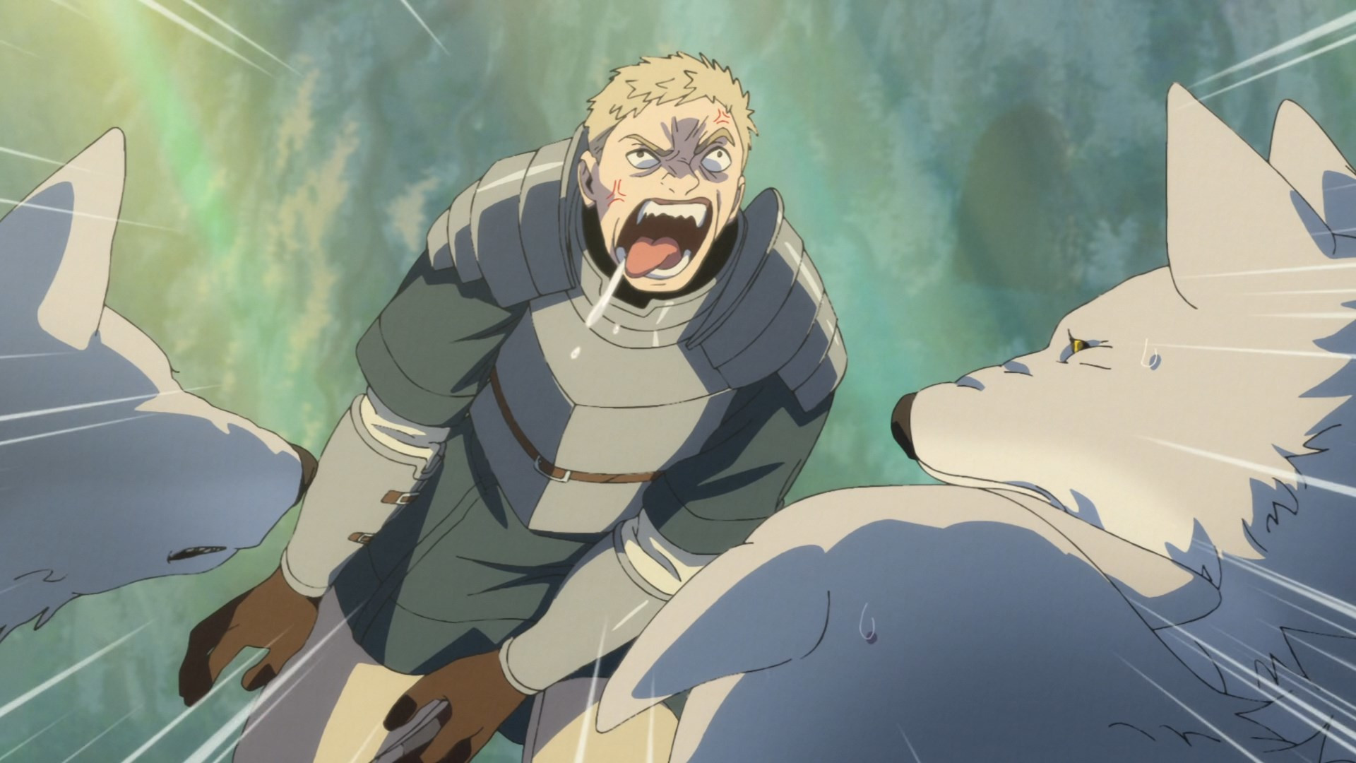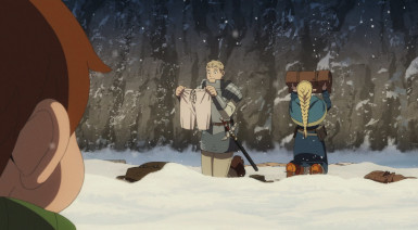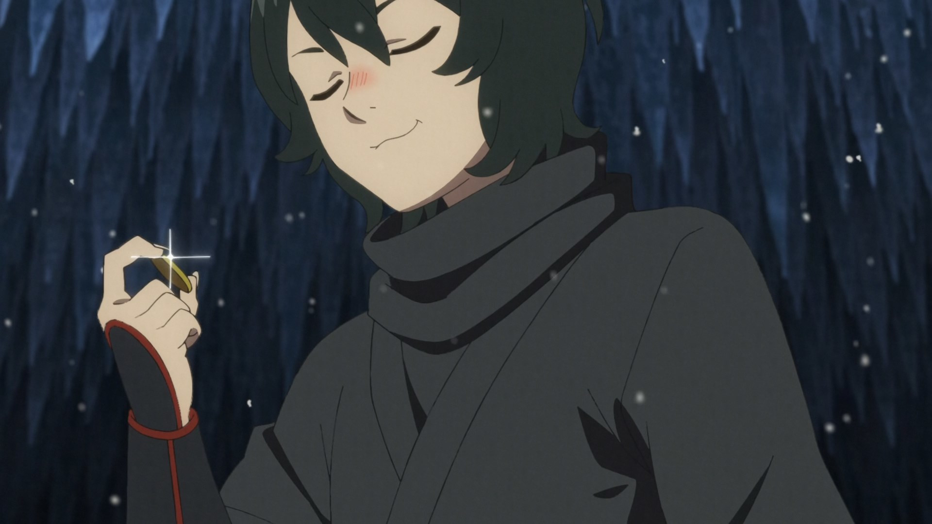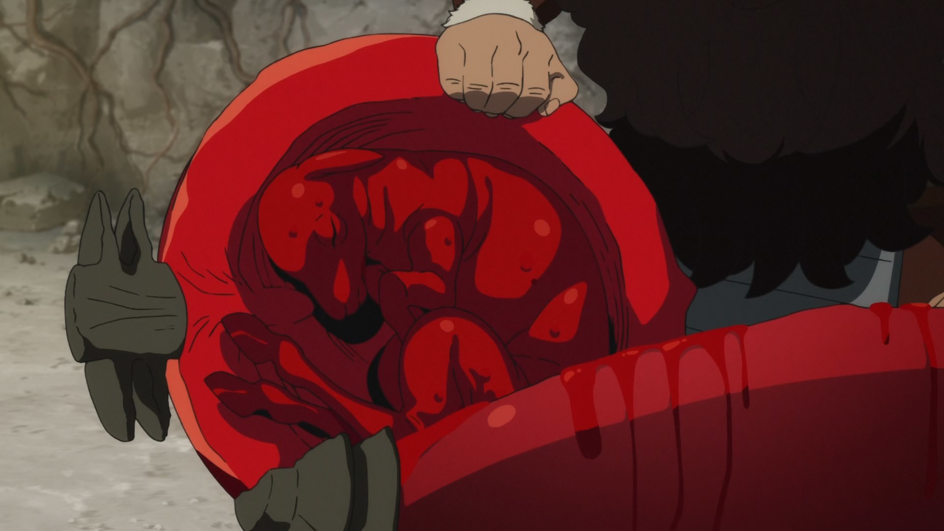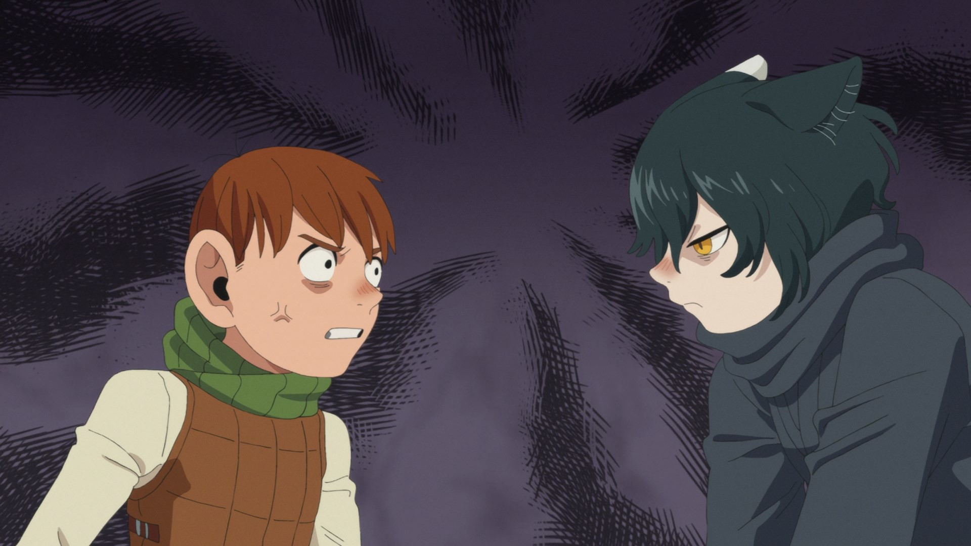 Fresh with a tweaked OP adding Izutsumi, the now five-strong party is right back into the storm, literally. As a blizzard rages they keep pushing forward, eventually making their way to where they left their gear. It’s been ransacked, but apparently by beasts – only the food (and Marcille’s soap) has been taken. Izutsumi tries to take a little bit for herself, but the sharp-eyed Chilchuck catches her in the act. The catgirl makes a very unkind remark about half-foots – that they got their name because so many of their kind had half their foot chopped off for stealing (this information is neither confirmed nor denied by Chilchuck) and the pair of them are squarely off on the wrong foot, half or no.