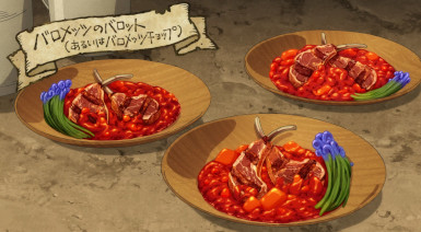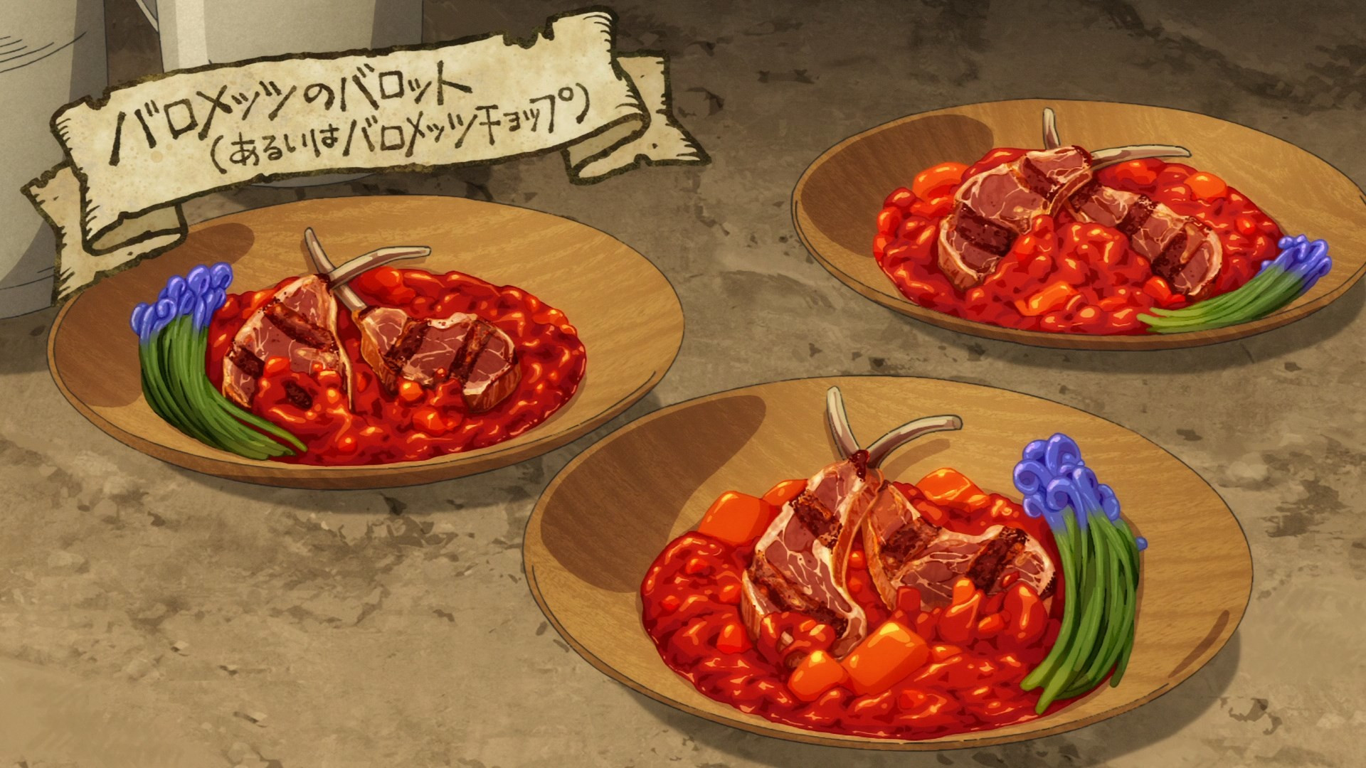 The dire wolves, by the way, were after something called a “Barometz“. And this very weird thing – among the weirdest in a series full of them – is based on a real legend. The Barometz – better known as the “Vegetable Lamb of Tartary” – is a mythical plant from Central Asia that supposedly grew a lamb as its fruit. The lamb would be “born”, connected to the plant by an umbilical cord, and forage the area around the rooted plant. When it ran out of grass and shrubs, both it and the plant would die. Unsurprisingly no one ever found evidence the Barometz actually existed, and it’s so strange one wonders how even the legend came into existence. But it’s definitely one of the grossest things Senshi has ever cooked (even if it eventually looked pretty delicious).