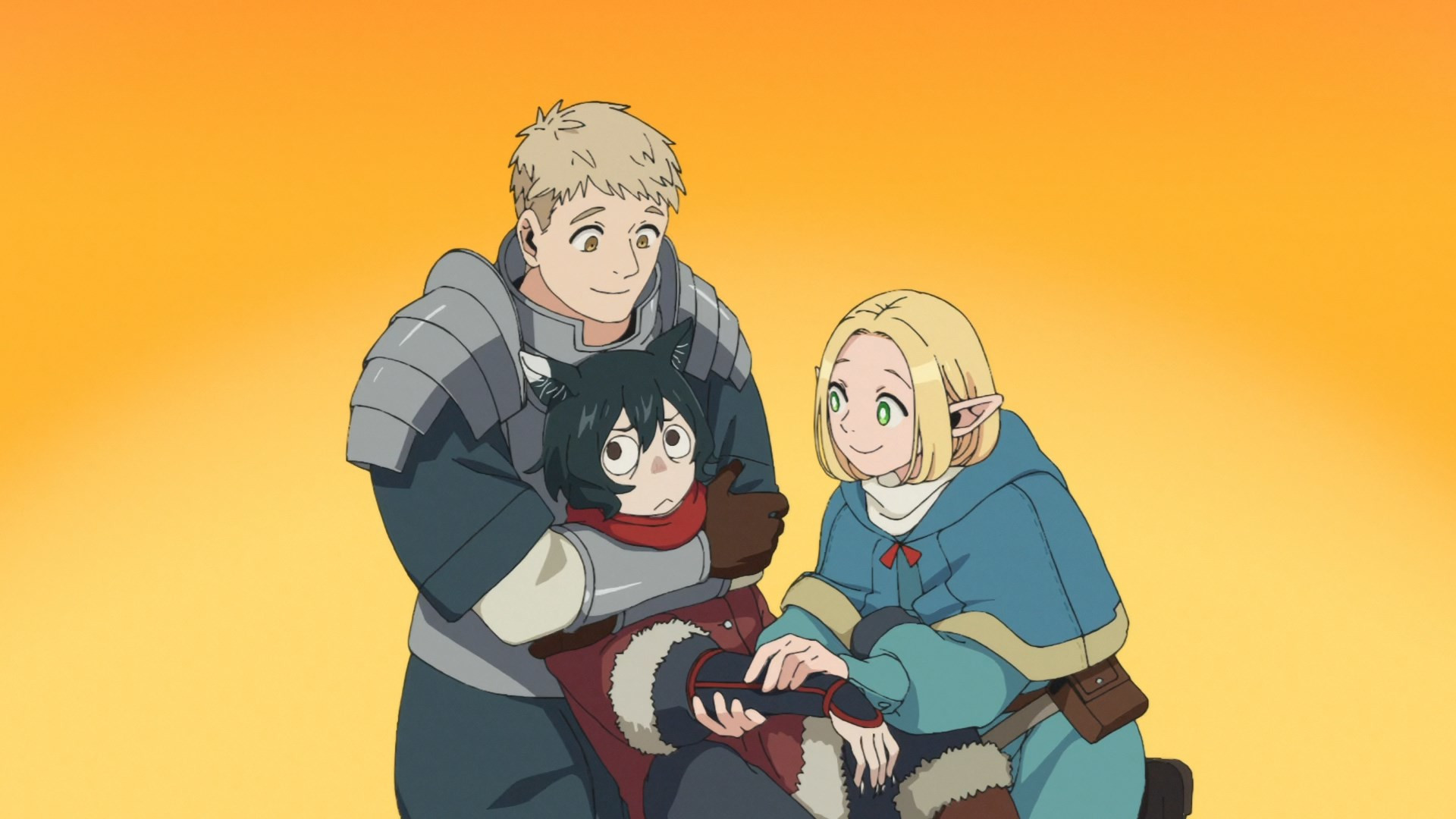 I’ll say now that of all the relationships in Dungeon Meshi, Chil and Izutsumi is my favorite dynamic. I won’t go into details now for obvious reasons but they’re a really fascinating pair. And it’s the half-foot who seems most in tune with why the catgirl is so discomfited in her new situation. He repairs a pack for her to use, and lets her know that he understands what it’s like to feel the newbie and an outsider. They even team up to take out an ice golem which takes them by surprise while they’re defrosting a fish. Chilchuck finds its core and reveals its location with his arrow, and Izutsumi – who proves herself to be extremely formidable in a scrap – does the rest.