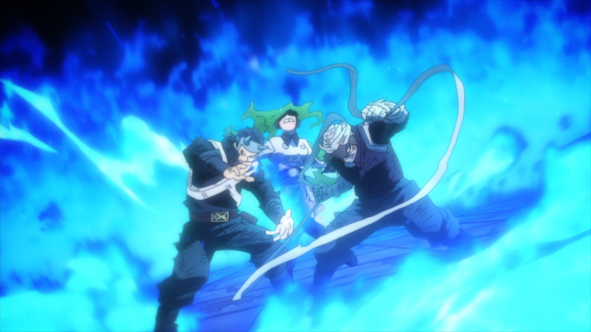 Dabi’s expectation of death does cast his behavior in a slightly different light. It’s unsurprising and it fits, but it crystalizes his mindset very clearly. He doesn’t care what damage he does to himself as long as he takes his father (if he ever gets the chance) and brother out. Shouto by contrast not only wants to preserve himself, but wants to avoid inflicting mortal damage on Touya. That’s at least one hand tied behind his back, but the power that made his father exploit him so greedily does come into play here. Cold flames of one sort or another were always going to be his ultimate move.