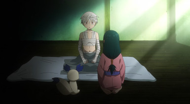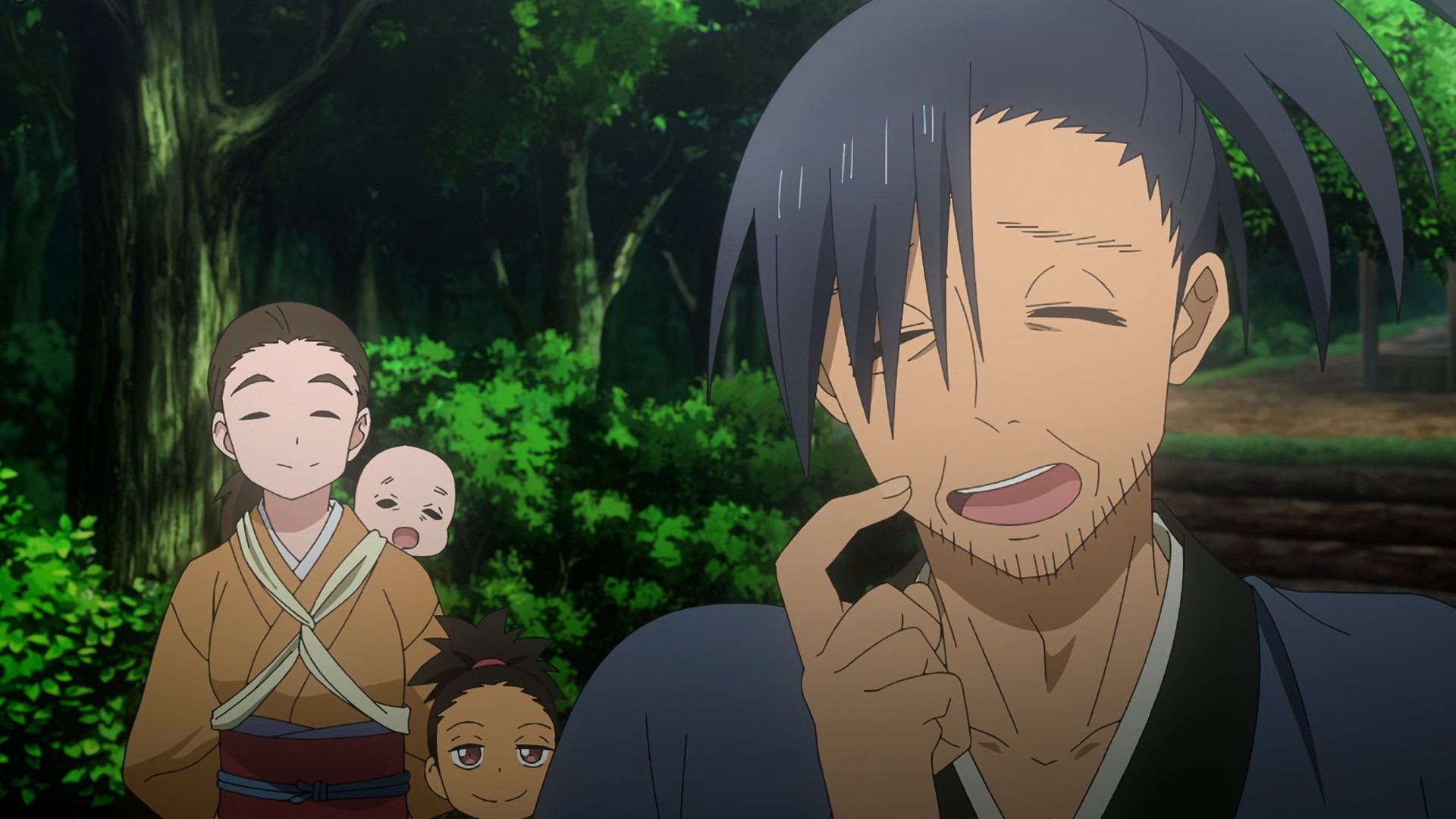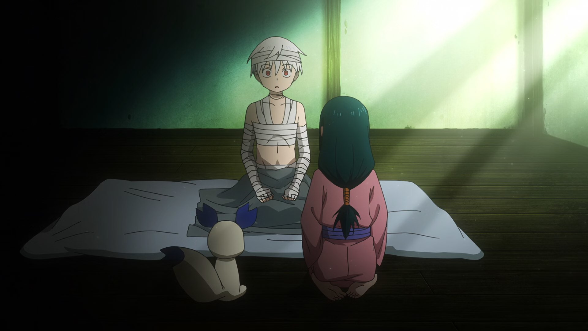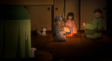 When Senya returns, pretty beat up, from his battle with Mudou his reaction to the news of the Shogun’s death is about what you’d expect. Except for one thing – he didn’t cry over it. He wanted to – even asked Shinsuke if he cried (he did, as we know) – but can’t find it in himself to do it. Shinsuke reassures him that as soon as he’s recovered, their journey will continue. But Hanatora has a rather rude surprise for him. When she made the barrier in order to transport the Shogun’s retainers out of his palace, she needed anchors in the village to transport them – humans who’d been touched by her spiritual power. And Shinsuke and Zanzou fit the bill.