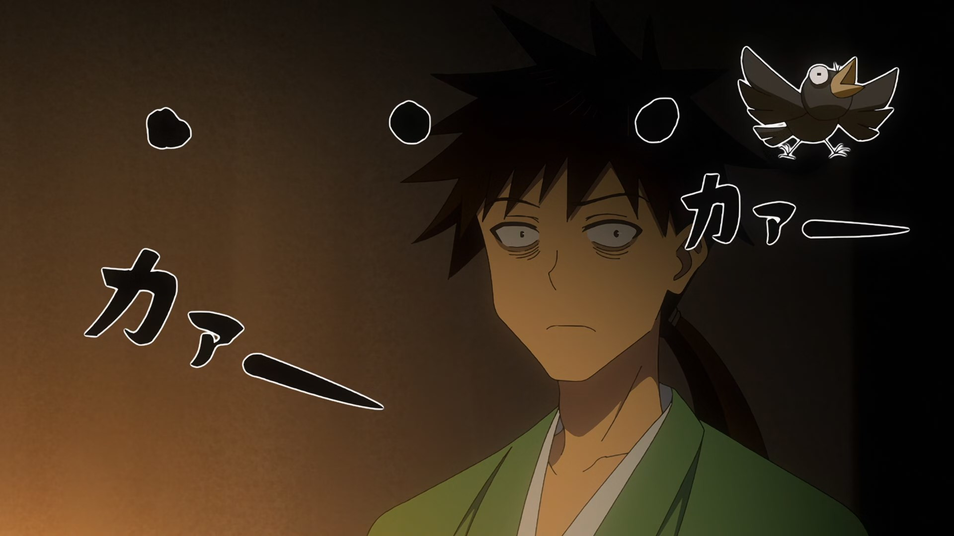 The upshot of this is, the two swordsmen can’t leave the village. “Land Gods, but without the spiritual power”, Hanatora calls them. Whether permanent or not she isn’t sure, but for now at least – they’re stuck. And that’s a problem for all concerned, Shinsuke because he has a date with Tama he can’t keep, and Senya because he’s not sure if he’s capable of continuing his journey on his own. But he also realizes what will happen if he stays in the village – what always seems to happen to him, whenever he plants his feet for any length of time. And it finds him a lot sooner than he would have wanted.