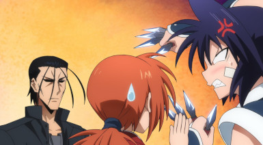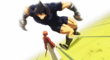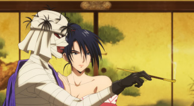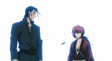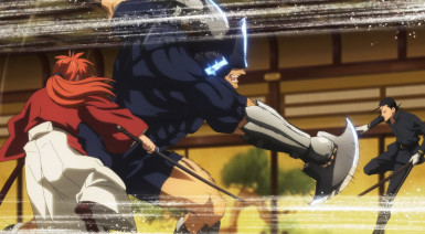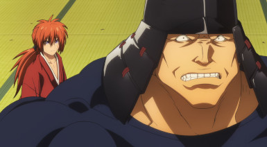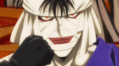 Kenshin is obviously not receptive, and wouldn’t be even if the treatment off Shingetsu hadn’t hardened his hostility towards his kouhai. He suggests the pair of them settle things then and there; Shishio declares that he doesn’t mind the idea of fighting but he’d rather do it in the historical capital. He then unleashes Senkaku (Satoshi Tsuruoka) to take on Kenshin. Soujrou and Saiitou remain on the sidelines feeling each other out. As for Shishio, he immediately stops his braggadocio and concentrates on the spectacle in front of him.