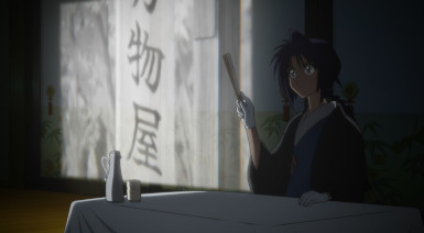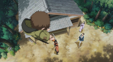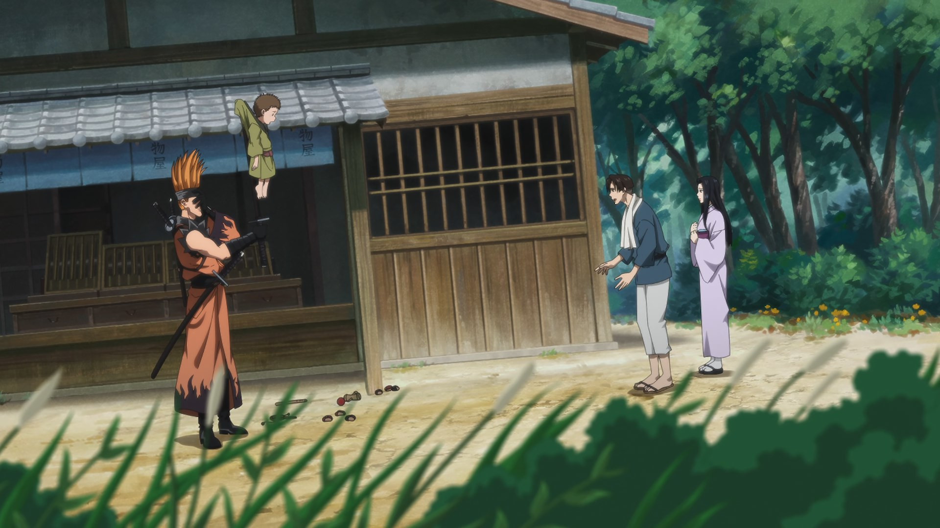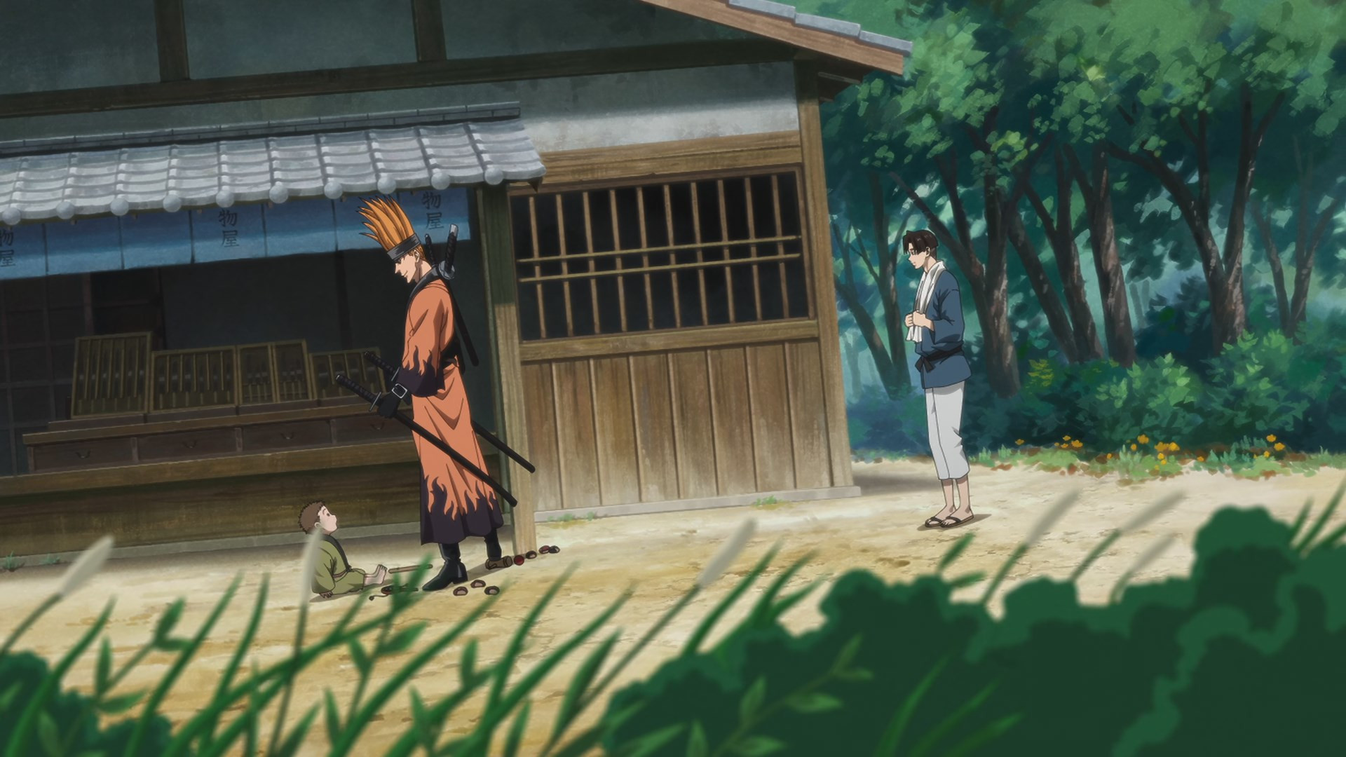 There doesn’t seem to be too much mystery with Sawagejou Chou (Okamoto Nobuhiko, continuing the usual suspects casting pattern). An Osaka boy, he’s the first to arrive in response to Shishio’s summons. “Chou the Swordhunter” seems to be all about just that, swords. He clearly has skill with the blade (as he demonstrates later in the episode) but he’s also a serious sword otaku. And when he hears from Houji’s spies that one of Shakku Arai’s katana was left behind, Chou determines to head out to Seiku’s shop and claim it for himself.