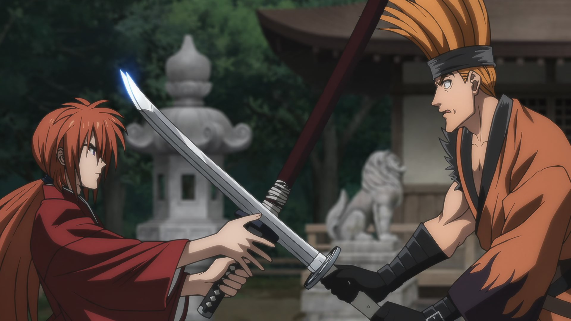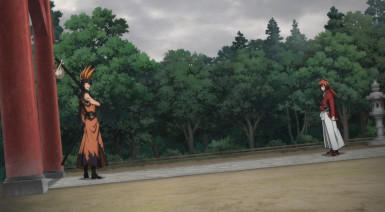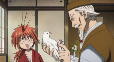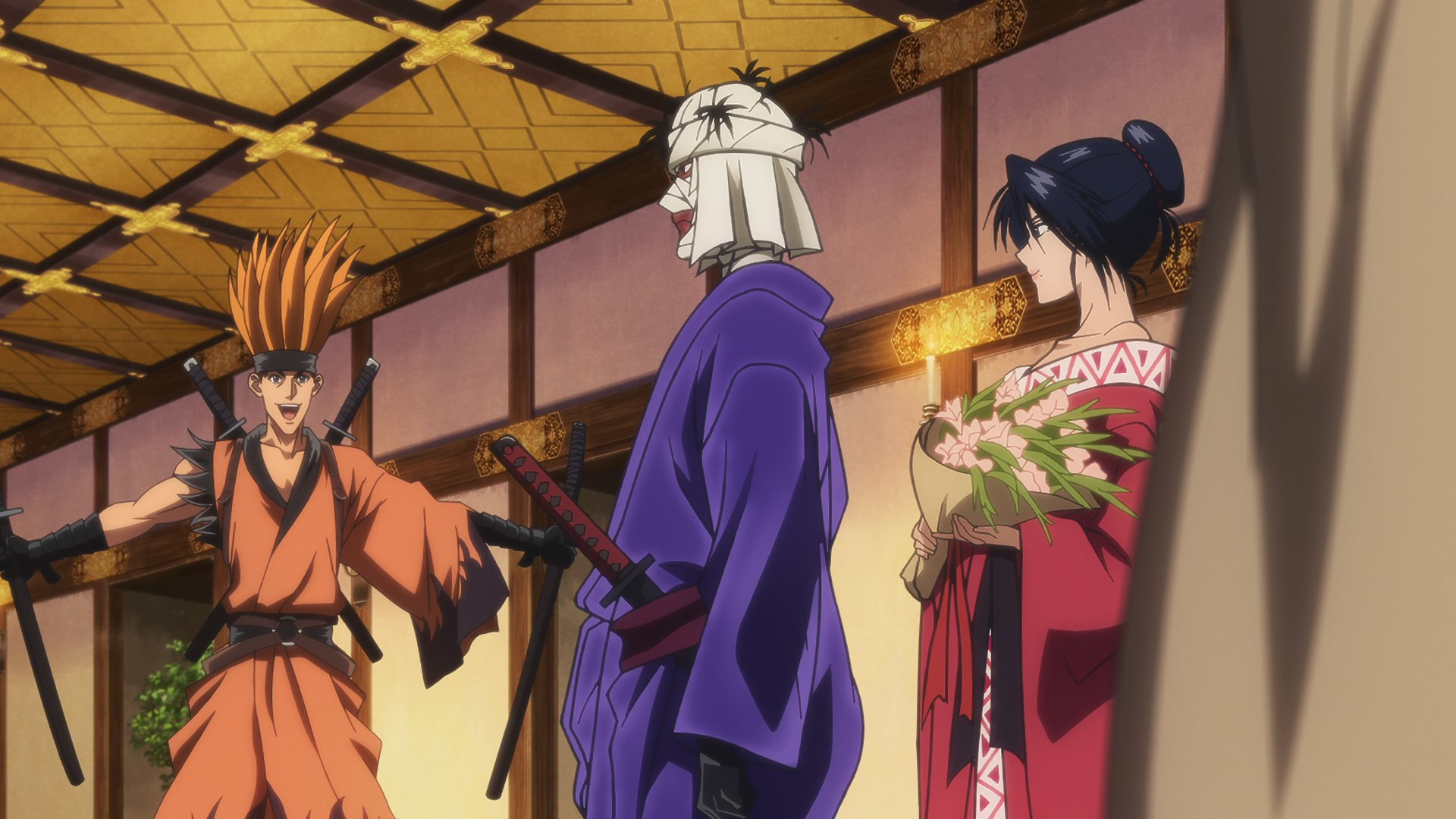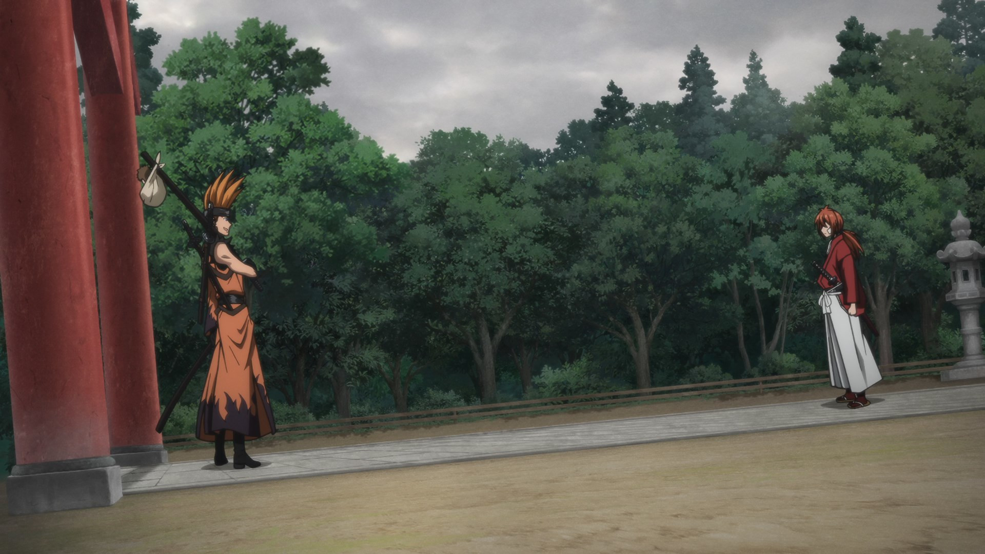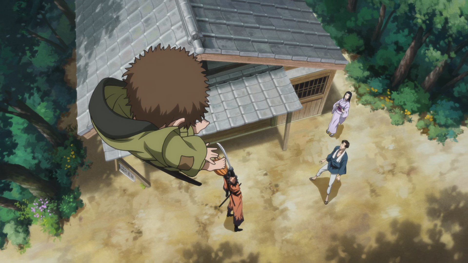 Misao (who provides a rakugo-style cold open this week, an affectation I don’t remember from the first anime) is meanwhile berating Kenshin for not bullying Seiku into making a sakabatou for him (though Nenji tells her in no uncertain terms why it wouldn’t have worked). Frankly Misao starts to get on my nerves after a while (as she always has) – she’s better in modest doses. But she does play a critical role here, as she decides to try and convince Seiku herself and winds up observing what’s happening with the Swordhunter. She immediately tells Nenji (using the Oniwabanshuu’s carrier pigeon network) and before you can “Oro!” Kenjin has zipped over to Hakusan Jinja to rescue Iori.