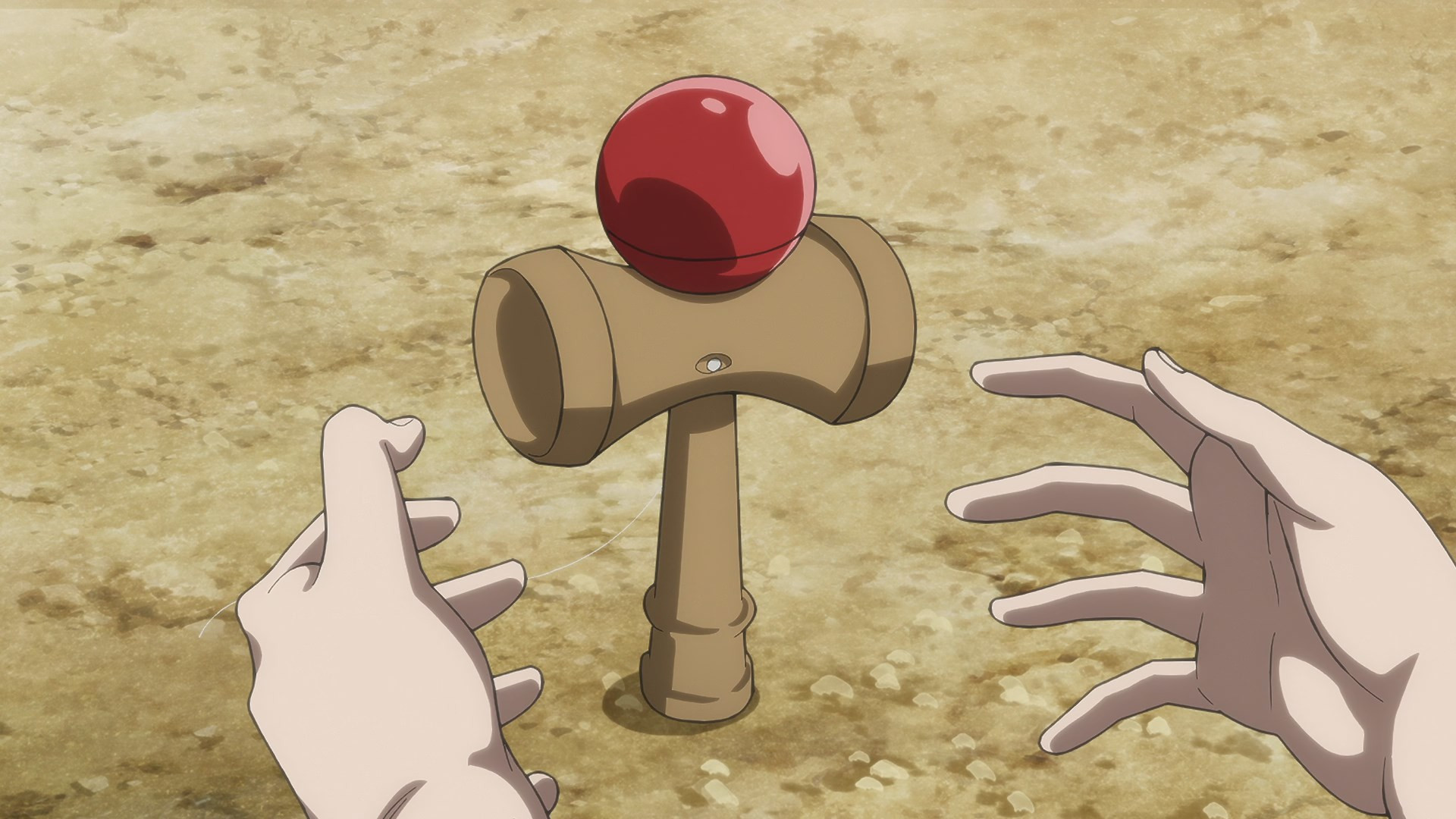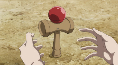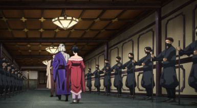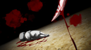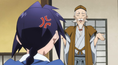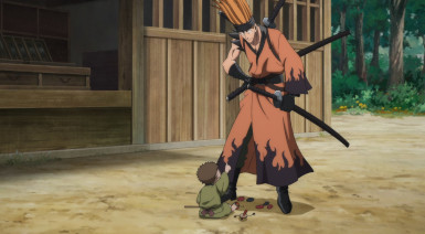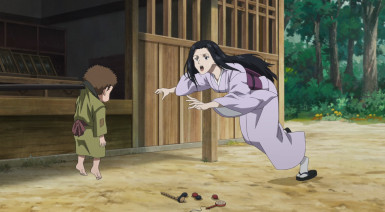 Despite Shishio’s admonition not to make too much trouble just yet, you get the idea that Chou is not exactly a paragon of self-restraint. He plays around with Iori for a bit (kendama doesn’t seem to be his game) but when the parents arrive he goes straight into blackguard mode and takes Iori hostage. This is pretty tense stuff, as you get the sense that Chou is the sort that’s capable of pretty much anything. But his threats convince Azusa to spill the beans on the location of the last sword (which her husband refused to do). It was given as an offering to Hakusan Jinja, she tells him. But Chou takes Iori with him, ostensibly to make sure she was telling the truth.
