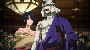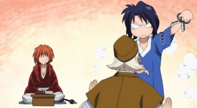 In point of fact the two newest additions to the cast made cameos last week. Sadojima Houji (Itou Kentarou) is the one who welcomes Yumi and Shishio back to their Kyoto kave. He musters the zaku for a salute, says a few words to stoke the fires, and generally betrays no obvious sign of what his talent it. But it’s clear he feels on secure footing with Shishio, as he’s comfortable confronting him with his disagreement on a decision (to use the Ten Swords to take out the Battousai). Houji is in the inner circle to be sure, but apart from that he remains a mystery.