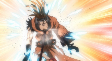 Nenji and Misao are certainly right to worry about Ken taking on one of Shishio’s Ten Swords without even a reverse blade of his own. But having brought this on himself and carrying more karmic baggage than any man could cope with, he doesn’t hesitate for an instant. Using only the lexicon of Hiten Mitsurugi and his scabbard he lands some blows on Chou and foils the enemies attacks. It’s hard to get much of a read on Chou here – even the half-unarmed Kenshin runs circles around him but, but he says he was holding back against a weakened opponent.