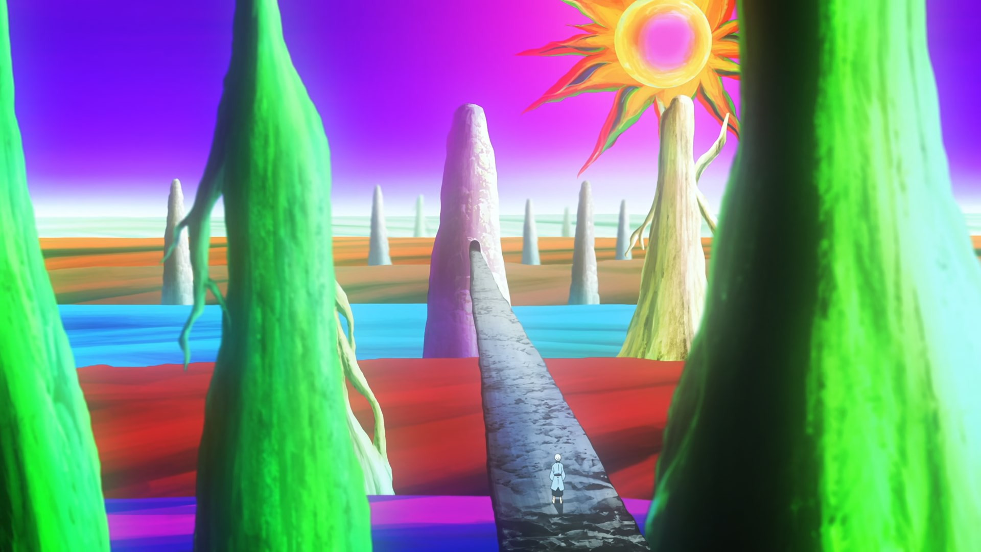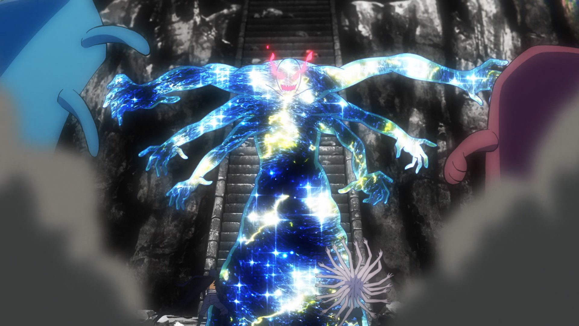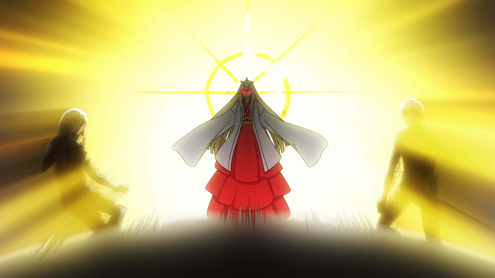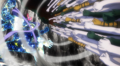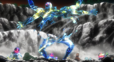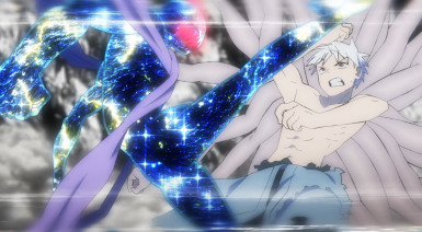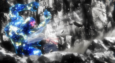 There are an awful lot of fronts to this battle, and with so many moving parts it’s somewhat miraculous that everything flows as smoothly as it does. Banshouou was never the main event here, the big bad – but his very presence makes him the center of the battle. All of this is entertainment to him – he has no interest who wins or loses. To that end he splits himself apart (just what Inga suggested was the best way to defeat him) in order to take on the katawara army and to give Mudou and Senya a better chance. Arrogant? Sure – but by the evidence he’s not wrong.