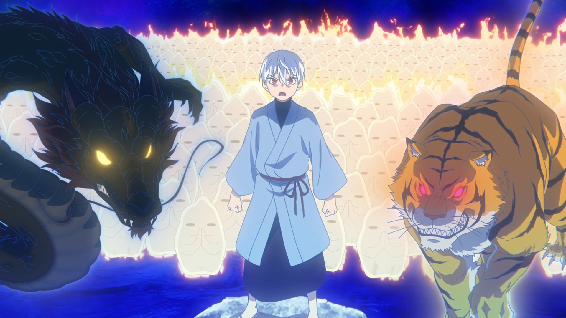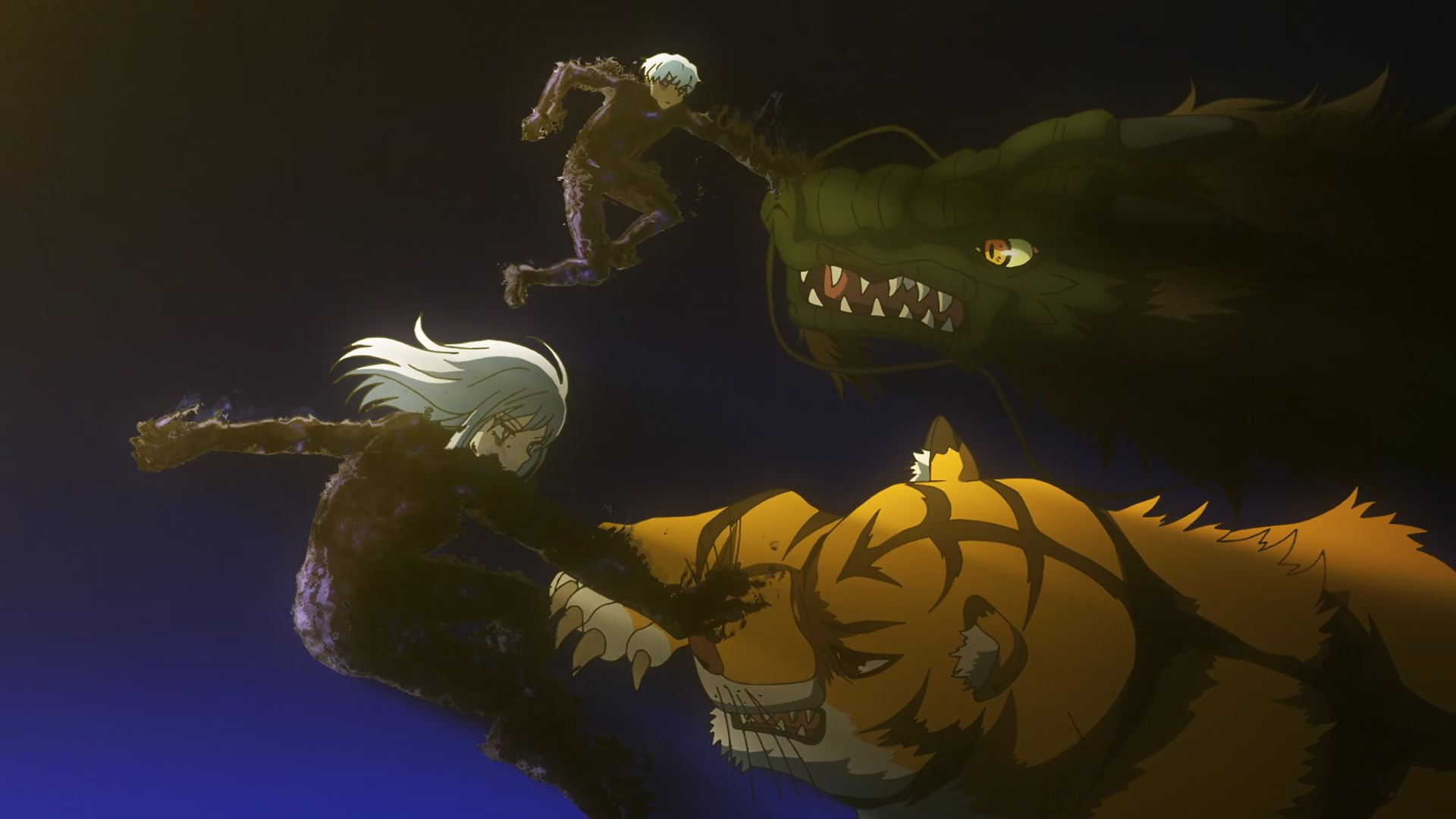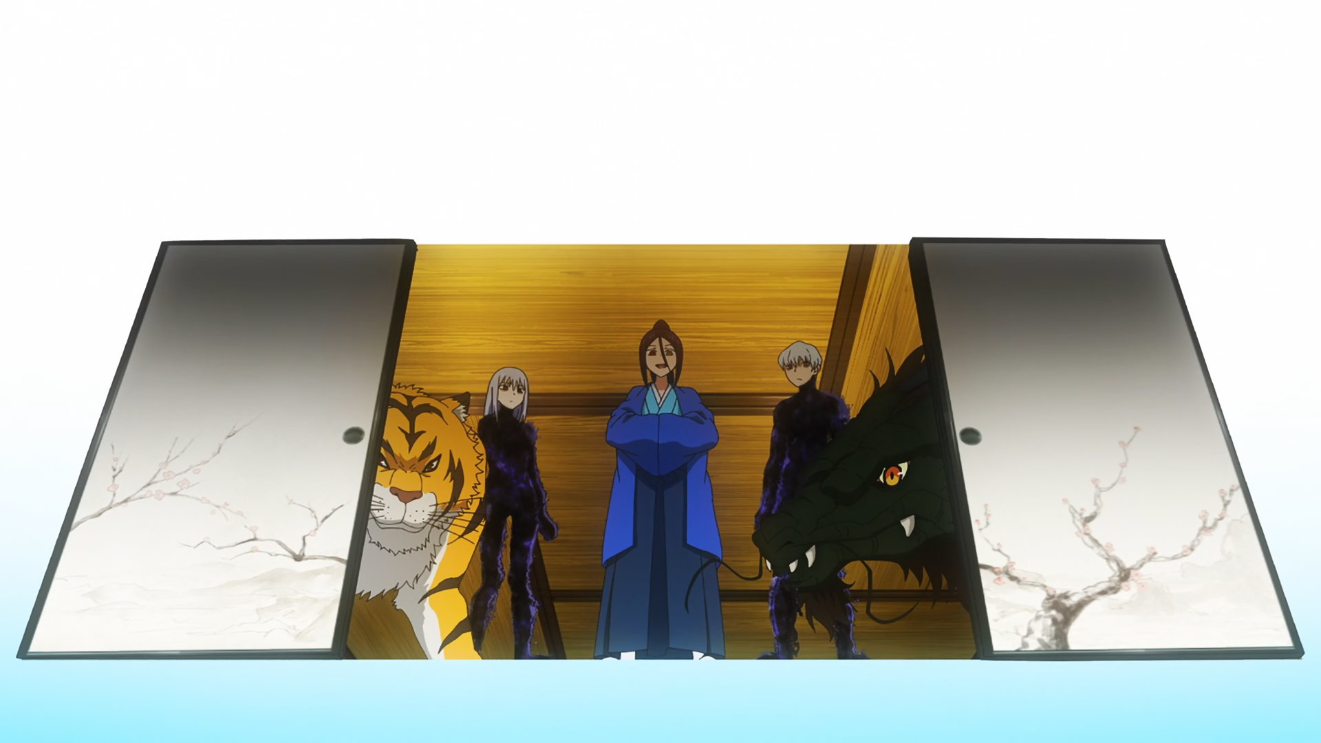 But soon, Senya has bigger fish to fry. Yazen sends Nau and Tsukiko to collect him, because it seems Douren and Jinun are just about at the end of their journey. For them this is surely not a bad way to go out, but for Senya it’s yet another heart-rending loss to deal with. Having only now gotten the two of them back in this life, he has to give them up again. Yazen says he can transplant the tiger (Shirokuma Hiroshi) within Douren (Jaki – I think this is the first time we’ve heard the name) and the dragon (Takashi Matsuyama) within Jinun (Nadare of course) into Senya. But that’s not the same as having his (admittedly lousy) father and (excellent) surrogate father in his life.