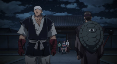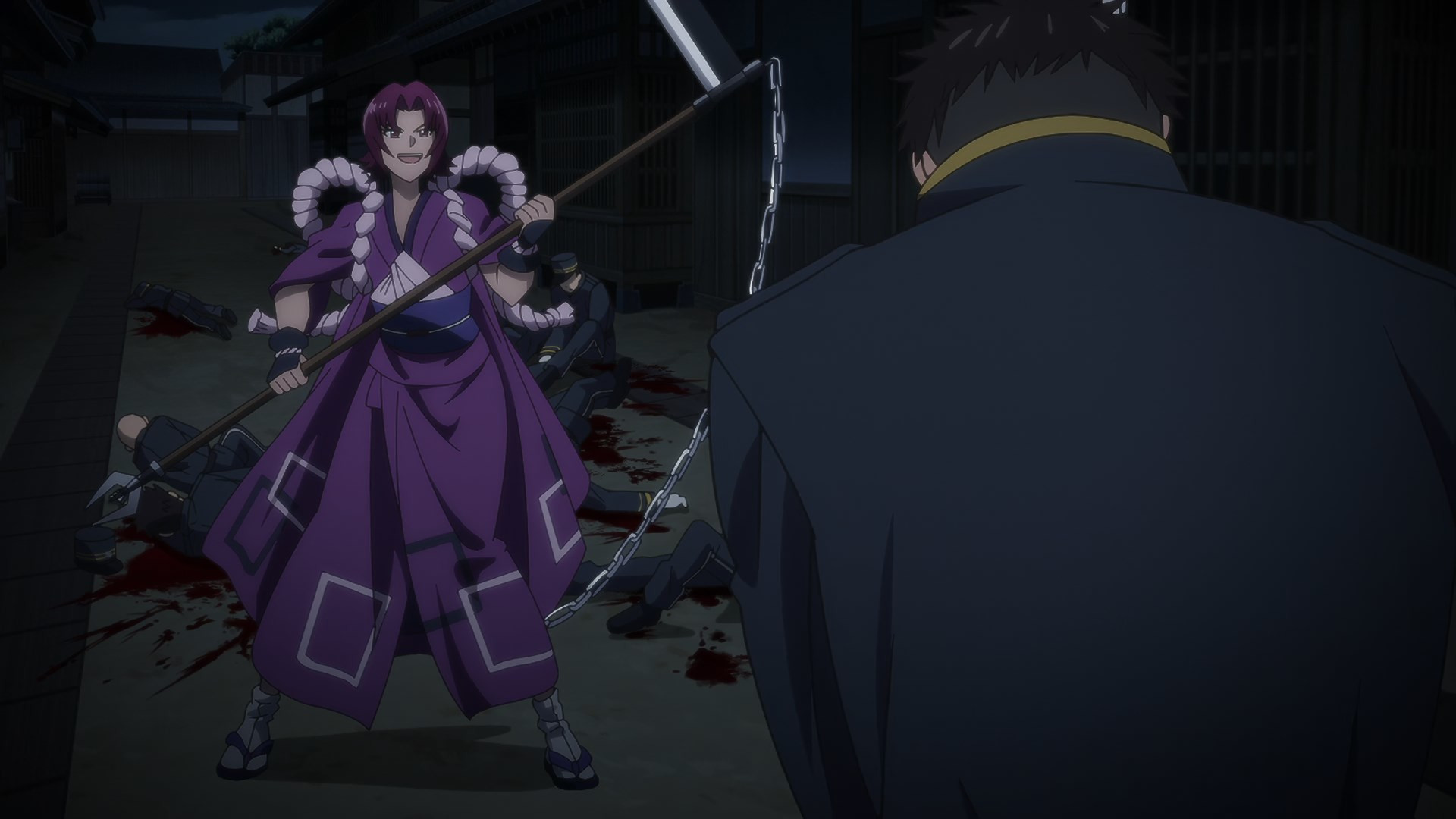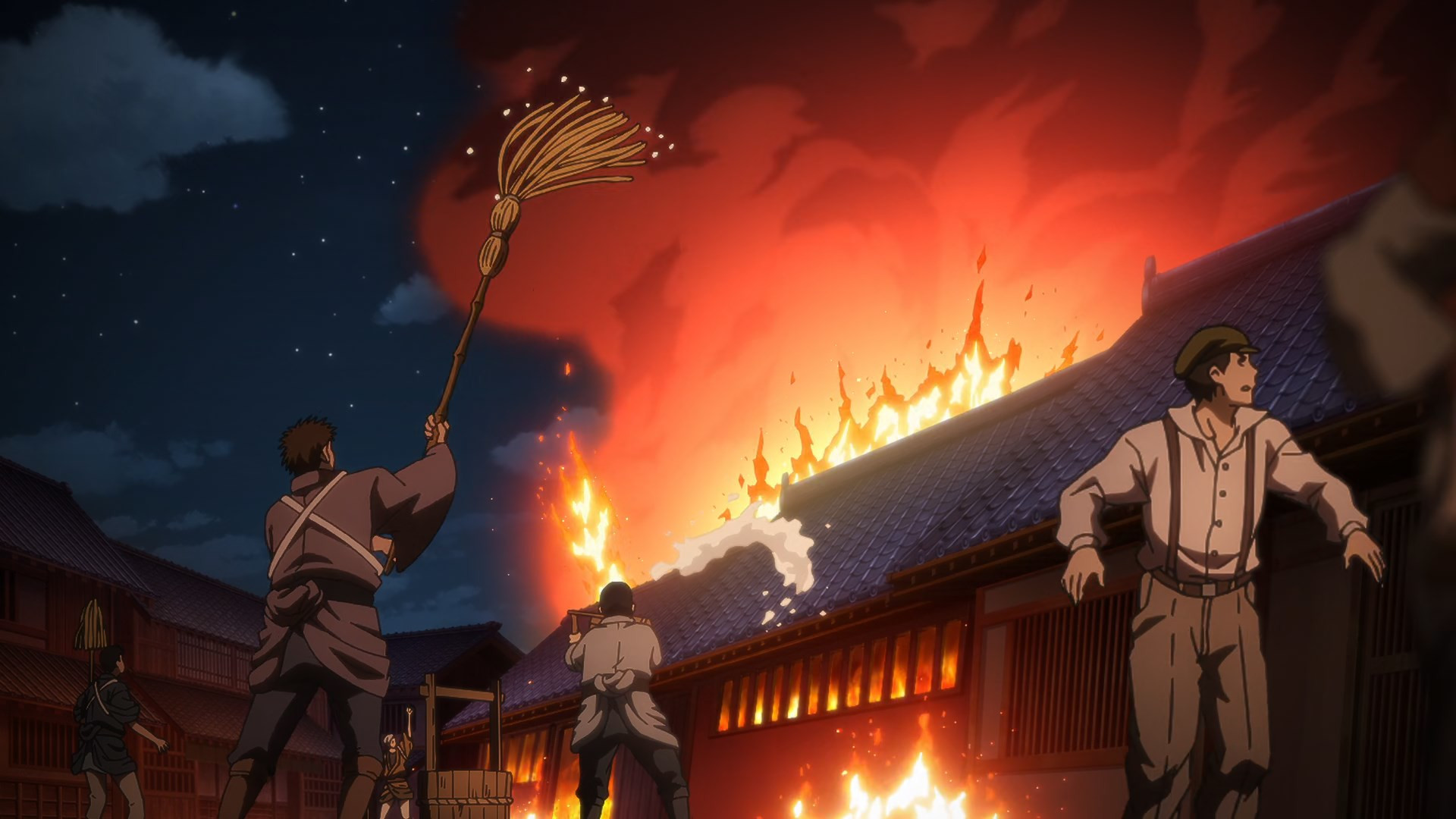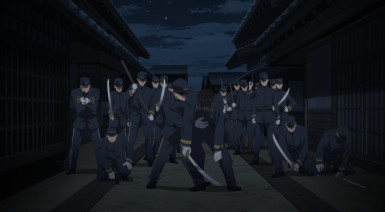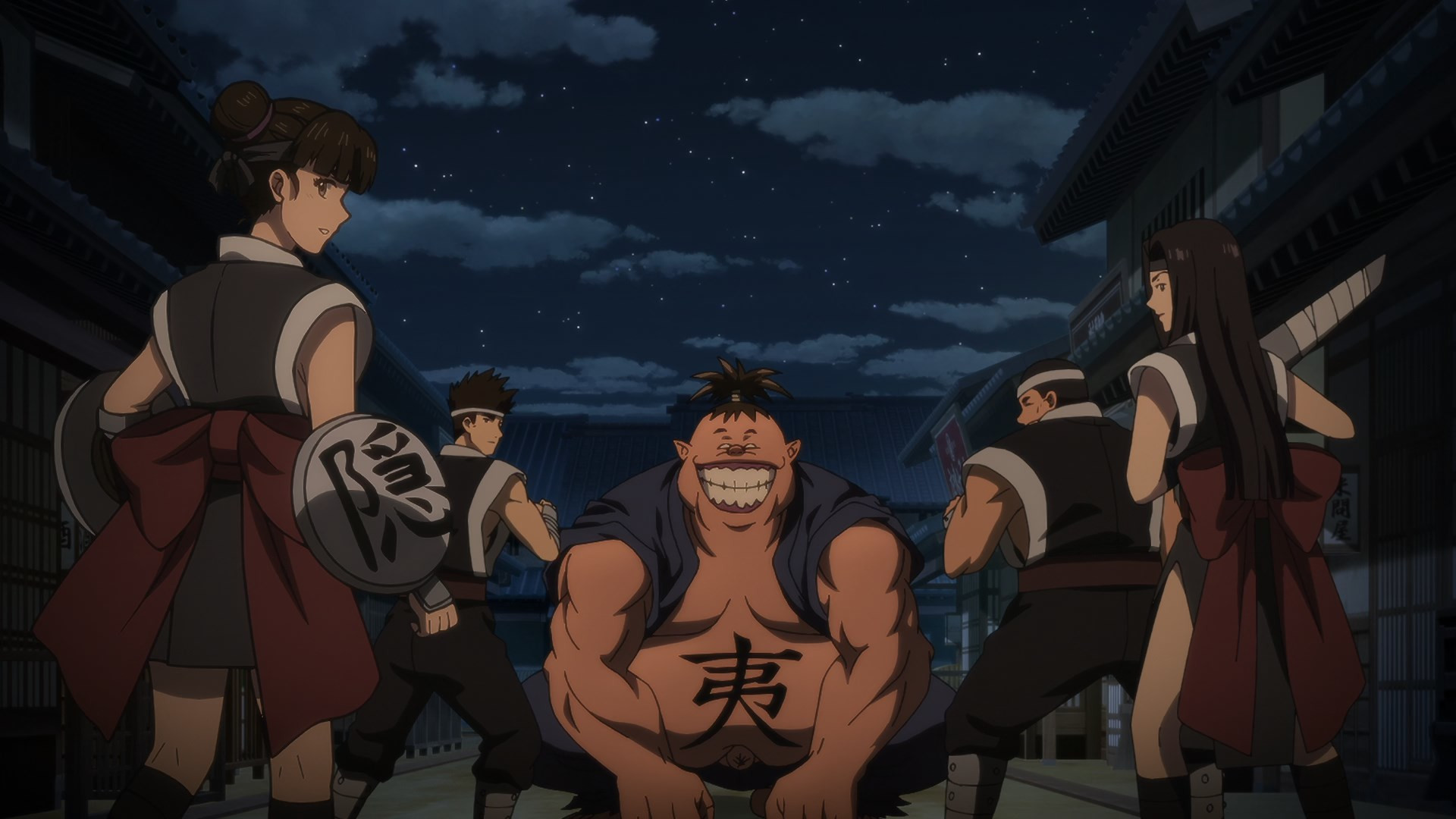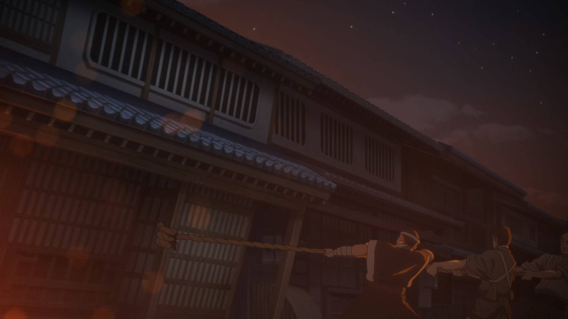 The zaku have their moment in the sun (well – moon) as well. Arato holds out against Henya and Kamatari long enough to let his injured men evacuate, though the two Juppongatana inflict serious damage to the remaining officers still able to fight. Fires are springing up all over. but Arato – ever the pessimist – has arranged for firefighters from the neighboring domains (Shiga, Koka et al) to come and lend a hand. They manage to limit the spread of the blazes (though it was heartbreaking to see all those gorgeous kyomachiya pulled down as fireblocks). Megumi, meanwhile, treats friend and foe alike, true to her beliefs as a doctor.