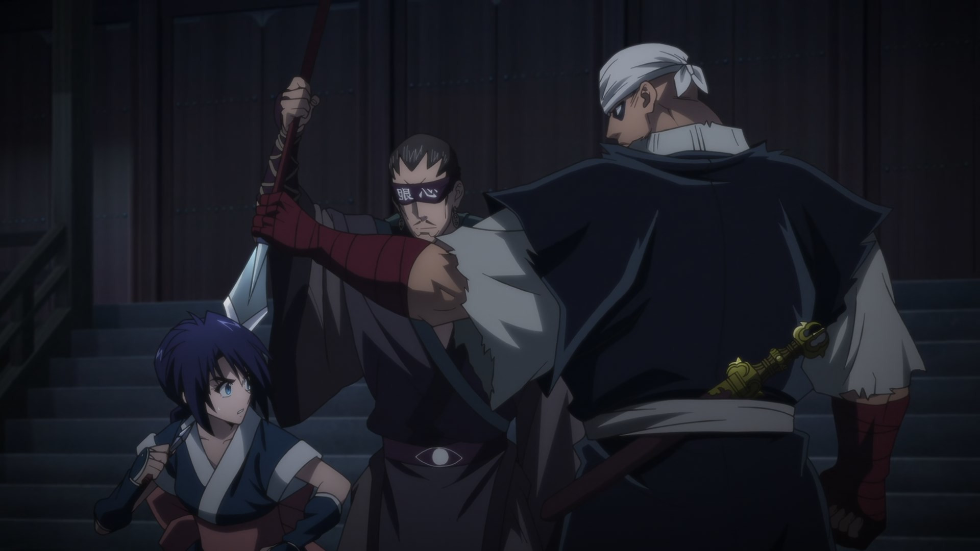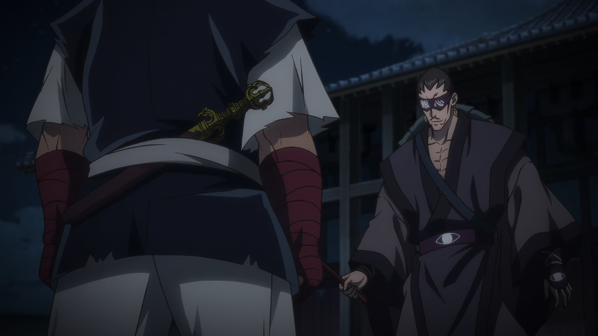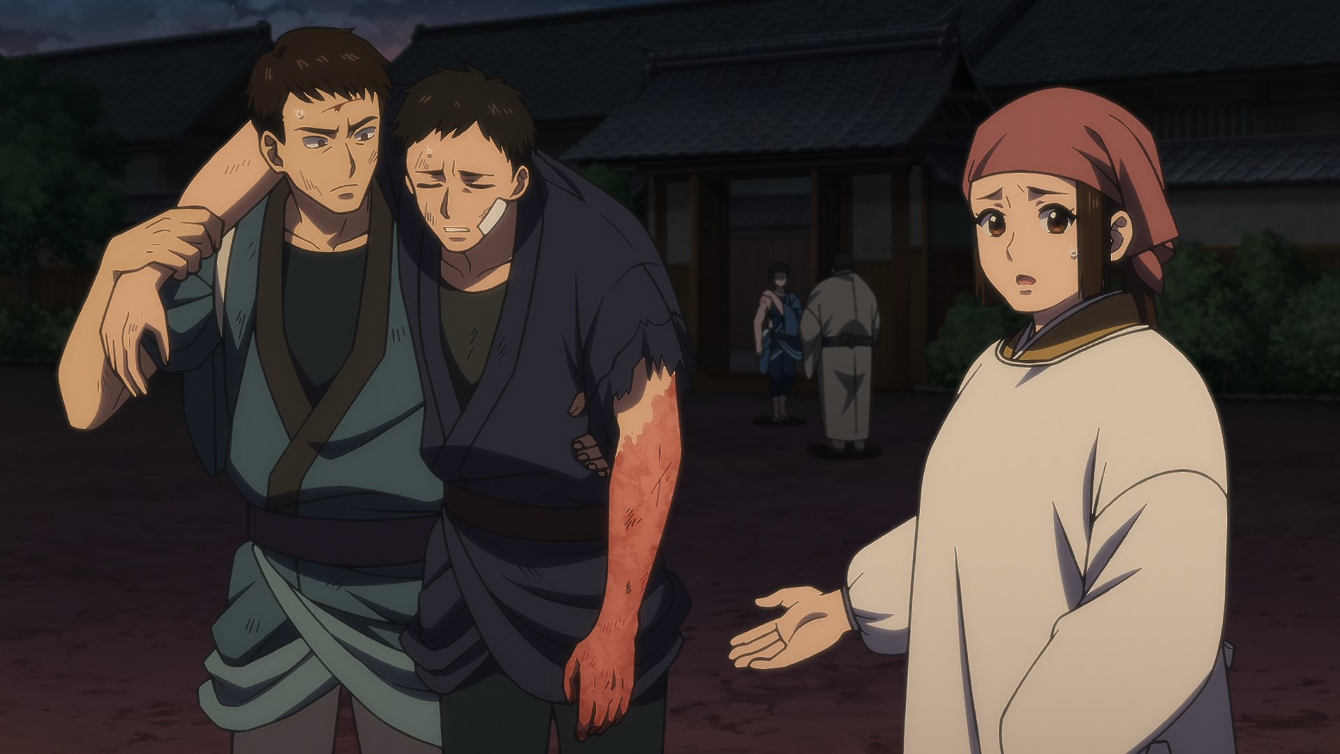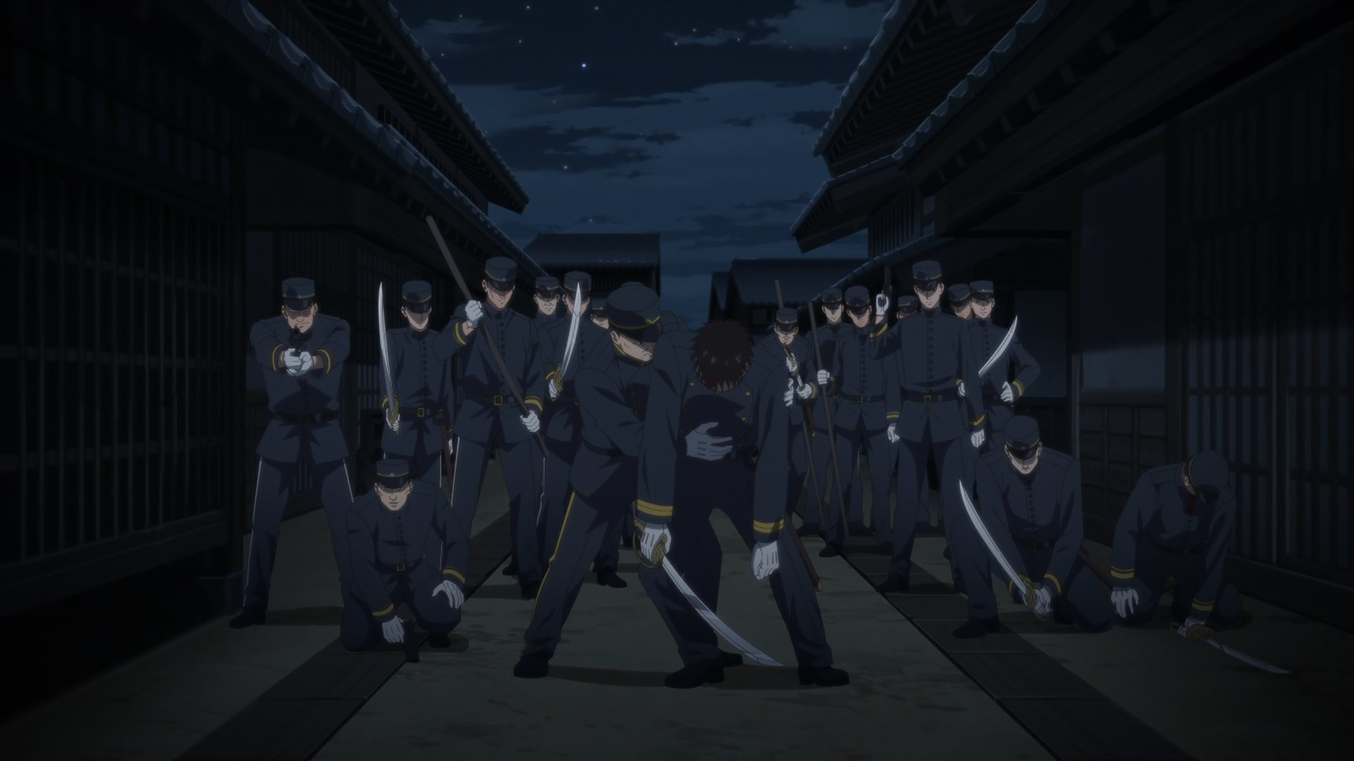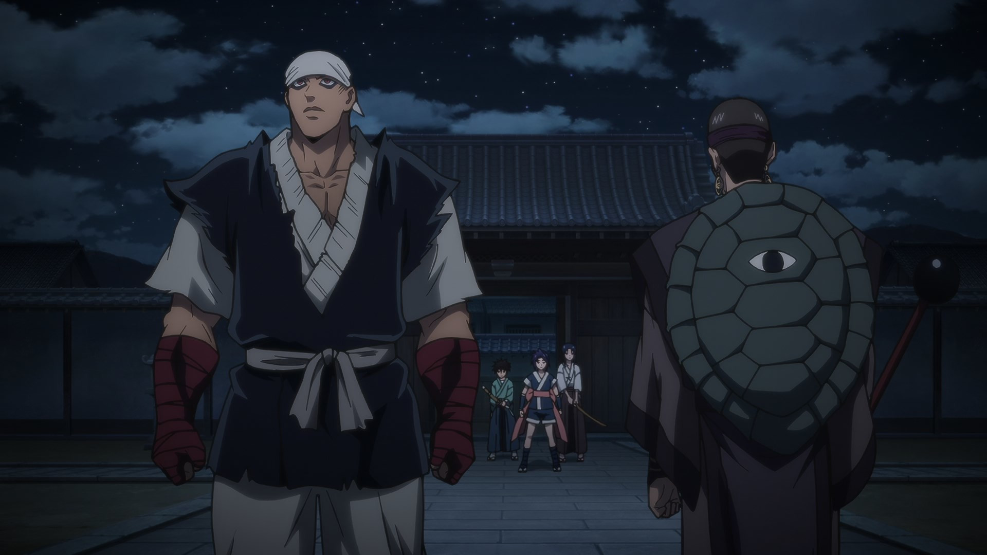 The zaku have their moment in the sun (well – moon) as well. Arato holds out against Henya and Kamatari long enough to let his injured men evacuate, though the two Juppongatana inflict serious damage to the remaining officers still able to fight. Fires are springing up all over. but Arato – ever the pessimist – has arranged for firefighters from the neighboring domains (Shiga, Koka et al) to come and lend a hand. They manage to limit the spread of the blazes (though it was heartbreaking to see all those gorgeous kyomachiya pulled down as fireblocks). Megumi, meanwhile, treats friend and foe alike, true to her beliefs as a doctor.
