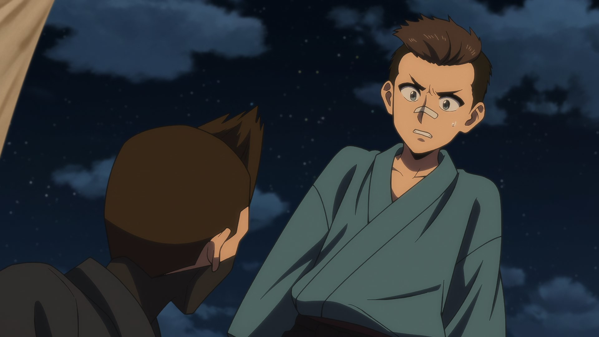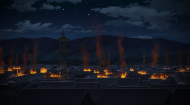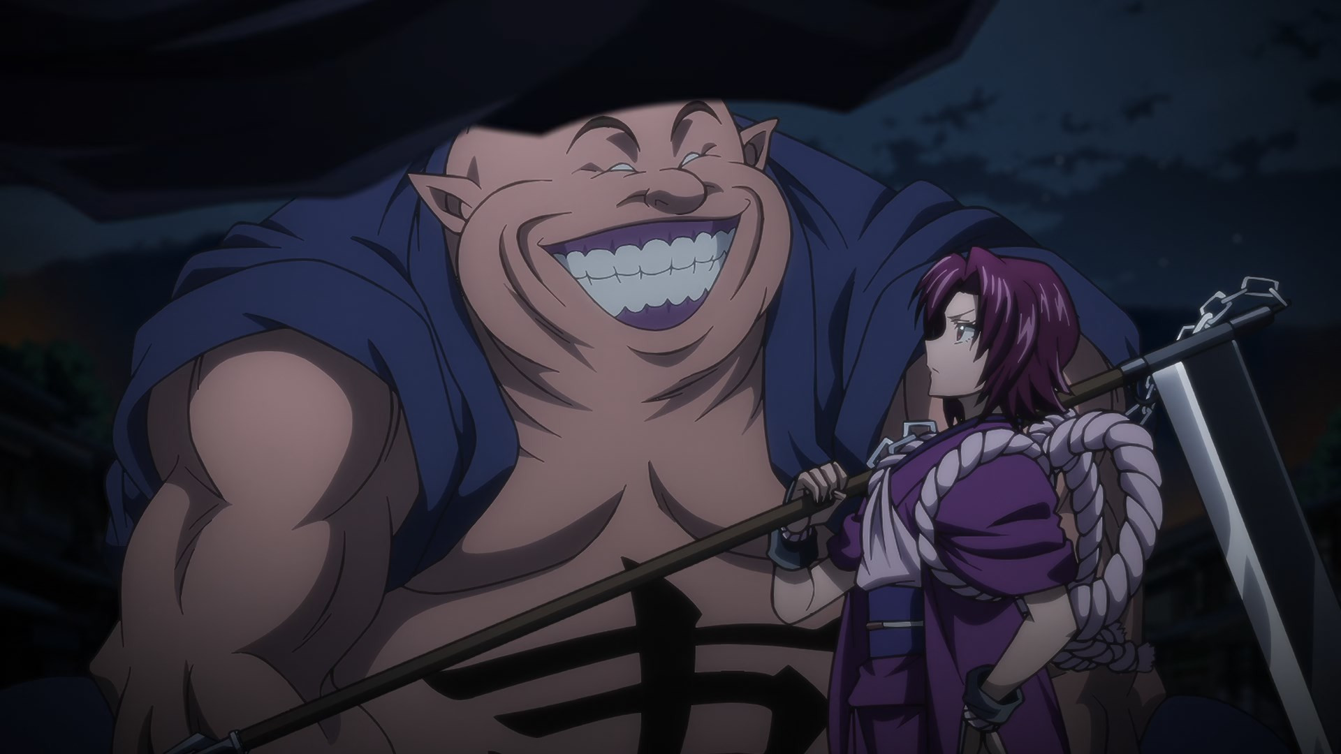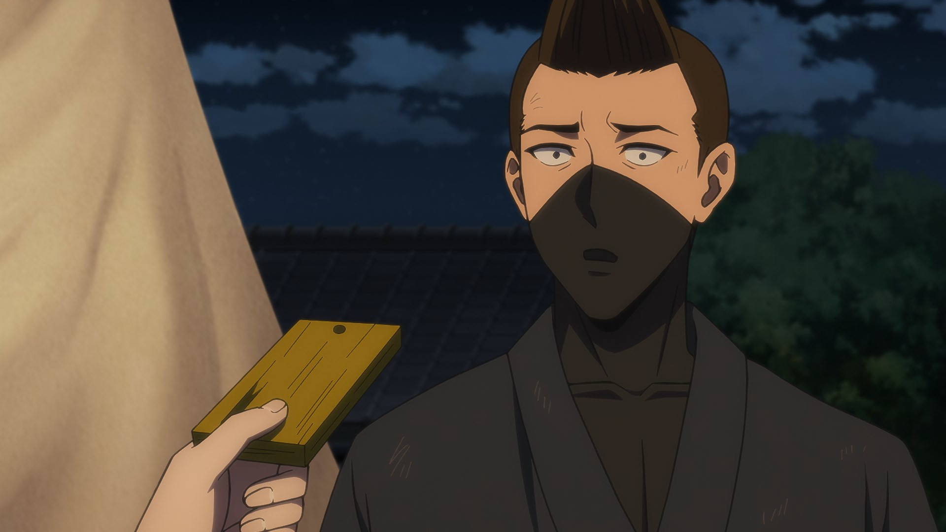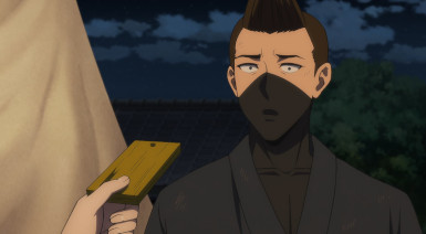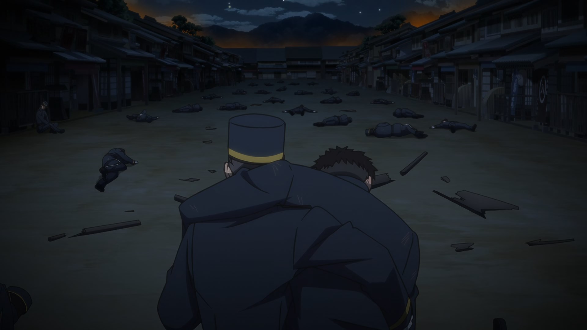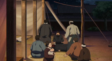 The zaku have their moment in the sun (well – moon) as well. Arato holds out against Henya and Kamatari long enough to let his injured men evacuate, though the two Juppongatana inflict serious damage to the remaining officers still able to fight. Fires are springing up all over. but Arato – ever the pessimist – has arranged for firefighters from the neighboring domains (Shiga, Koka et al) to come and lend a hand. They manage to limit the spread of the blazes (though it was heartbreaking to see all those gorgeous kyomachiya pulled down as fireblocks). Megumi, meanwhile, treats friend and foe alike, true to her beliefs as a doctor.