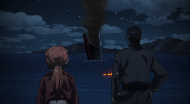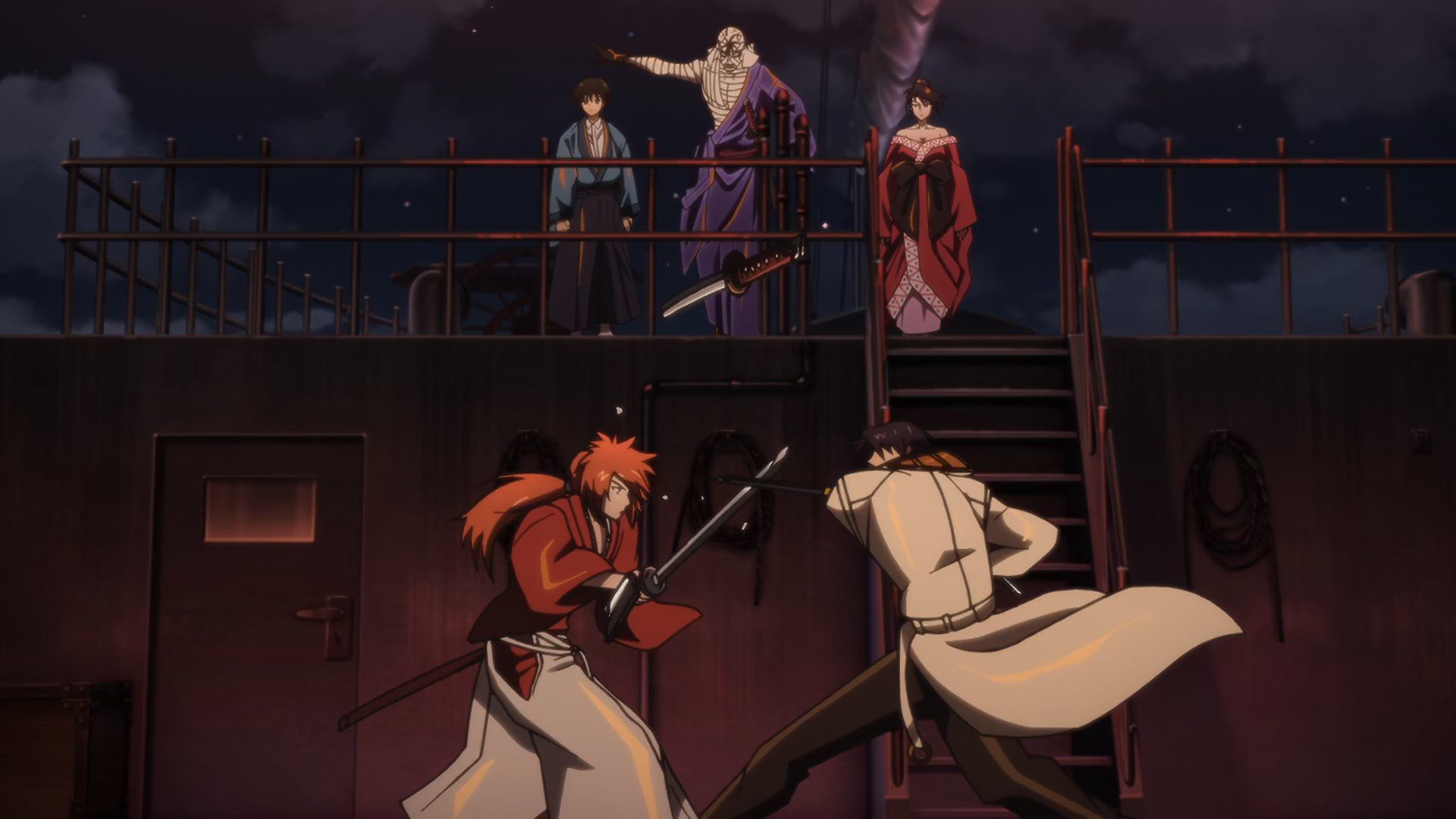 A lot of that confrontation was original but it lands in the same place – Sano destroys the ship. Of more weight is what’s happening on deck, where we got the massive cliffhanger of Kenshin about to unleash Kuzuryuusen on Aoshi (Shishio’s eyes get as big as dinner plates). That prospect defied my ability to reconcile it with the course of the story as originally written, but the timing of Sano’s sabotage is spot-on. An explosion from the boilers rocks the ship just as Ken and Aoshi are in mid-attack, and while that pissant Aoshi does try and land a cheap shot in the chaos, neither attack had the chance to manifest itself. And so that butterfly flits away safely…
