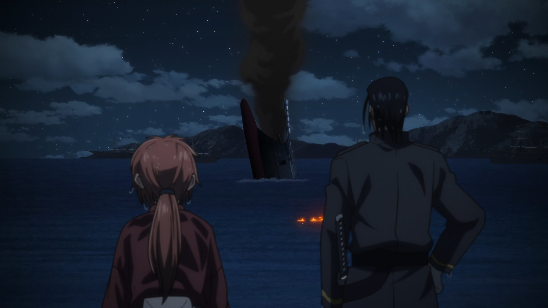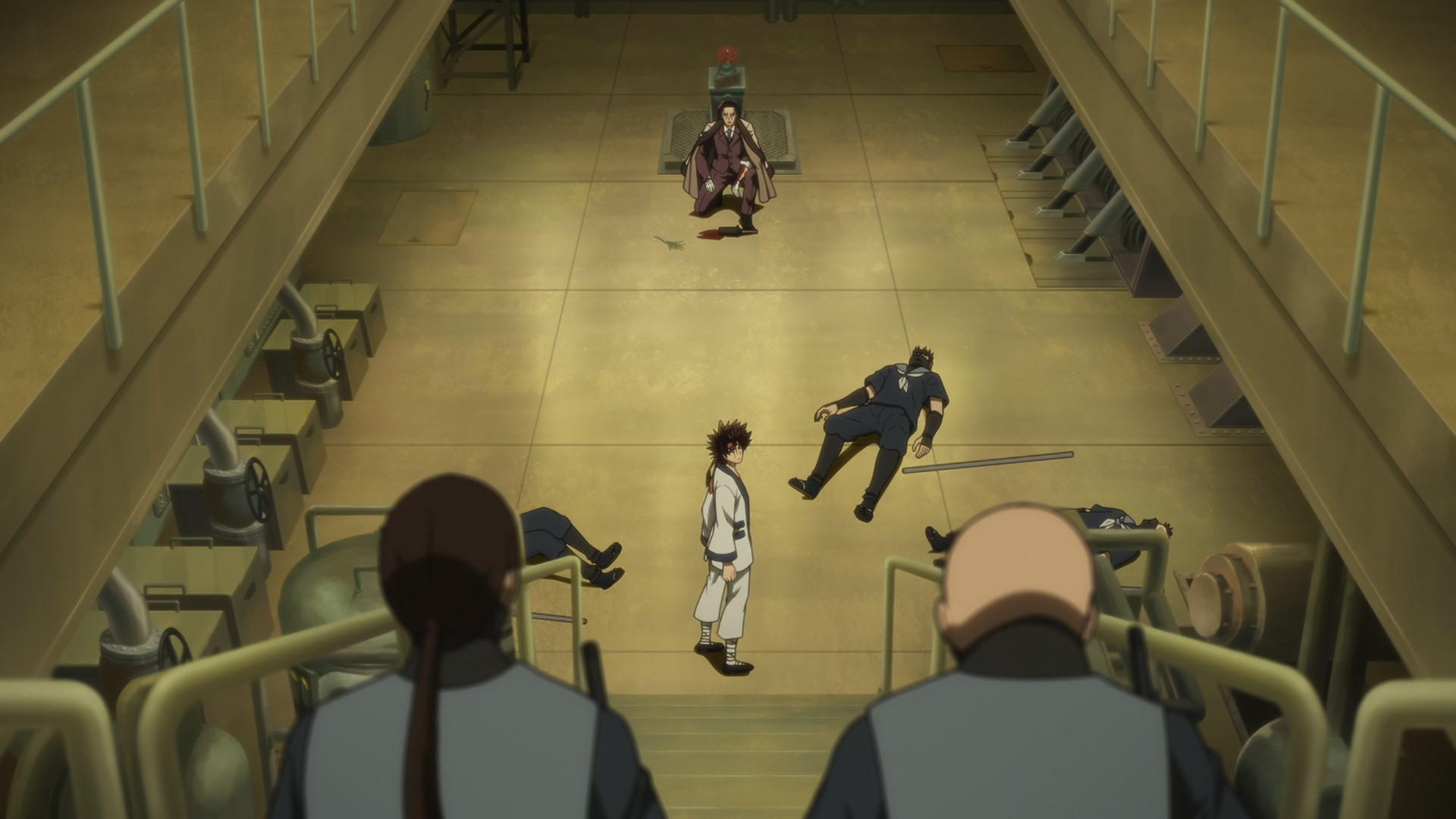 With that, this phase of the battle is over. Shishio extends an invitation to Aoshi to settle his score with Kenshin when he’ll have time to savor it. Saitou has a moment where he could have taken a run at Shishio, but Yumi throws herself in the way and he hesitates long enough for Soujirou to return to Shishio’s side. And Kenshin stops Saitou from engaging with the two of them. Why? Because in doing so, Saitou would have been stopping Shishio’s loyal men from abandoning ship – and Kenshin was not about to let them sacrifice themselves. If one ever needed proof that this is still Himura Kenshin and not the Battousai, there it is. He’s still a man who acts in accordance with his beliefs, much to his enemy-turned-ally’s aggravation.