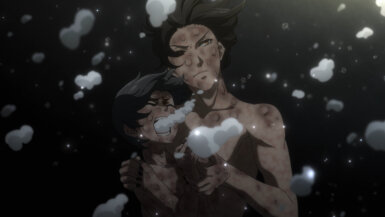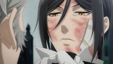 While Sebastian is out of the woods, Ciel is not. The next morning, the boy freaks out when any of the adults touch him- clinging to Finny, the only servant close in age to him. The miasma not only robbed Ciel of his sight, it seems to have done something to his mind as well. He starts talking in the third person and acting as if he were reliving his past. We’ve seen these flashbacks before- nothing new- except that for the first time, we see that he appeared to have another child he bonded with, who, unlike him, didn’t make it out. Now, that really piques my curiosity, especially seeing as it’s something he clearly tried to bury deep within his memory.