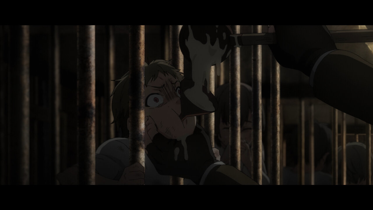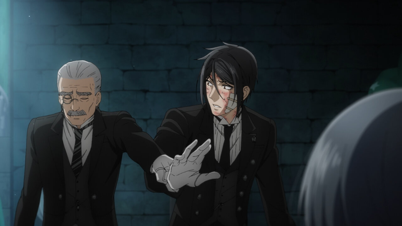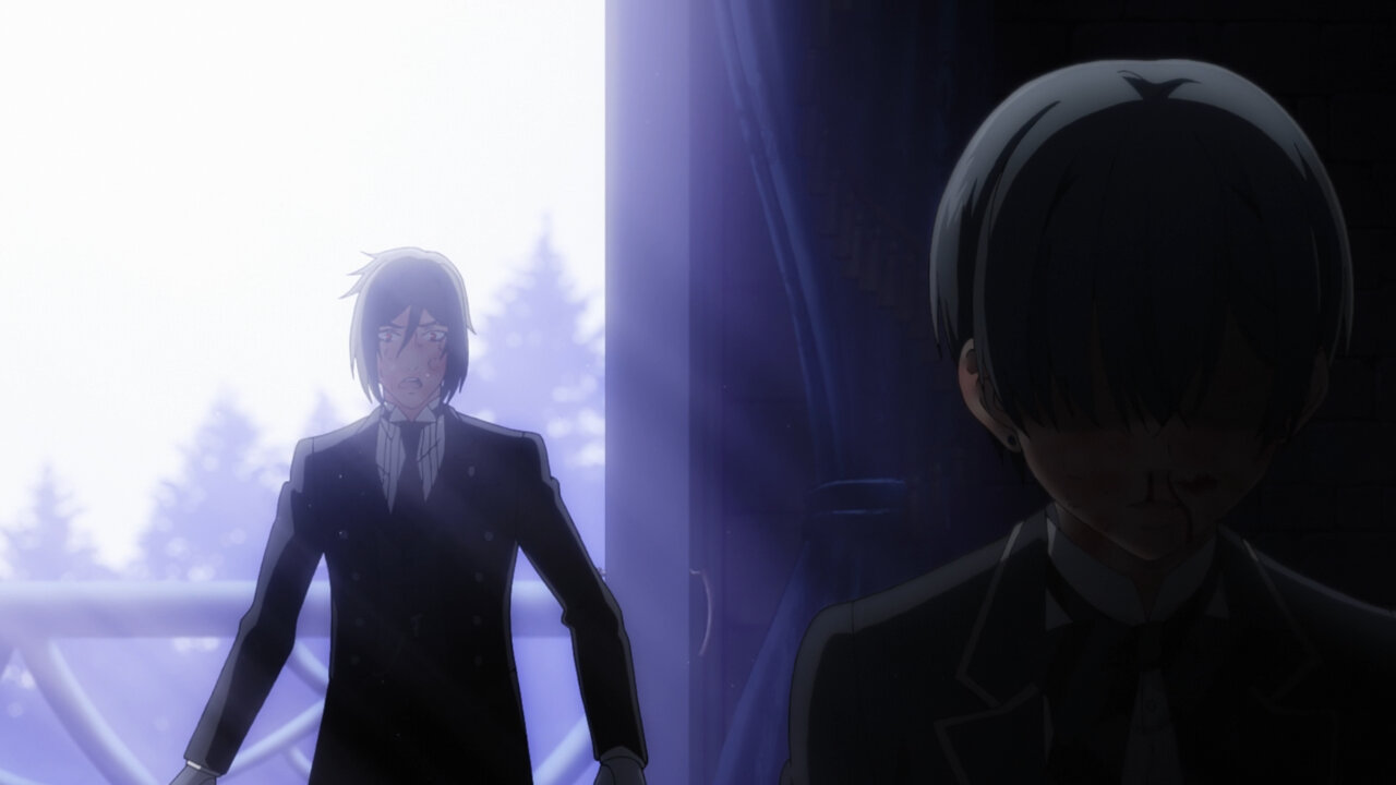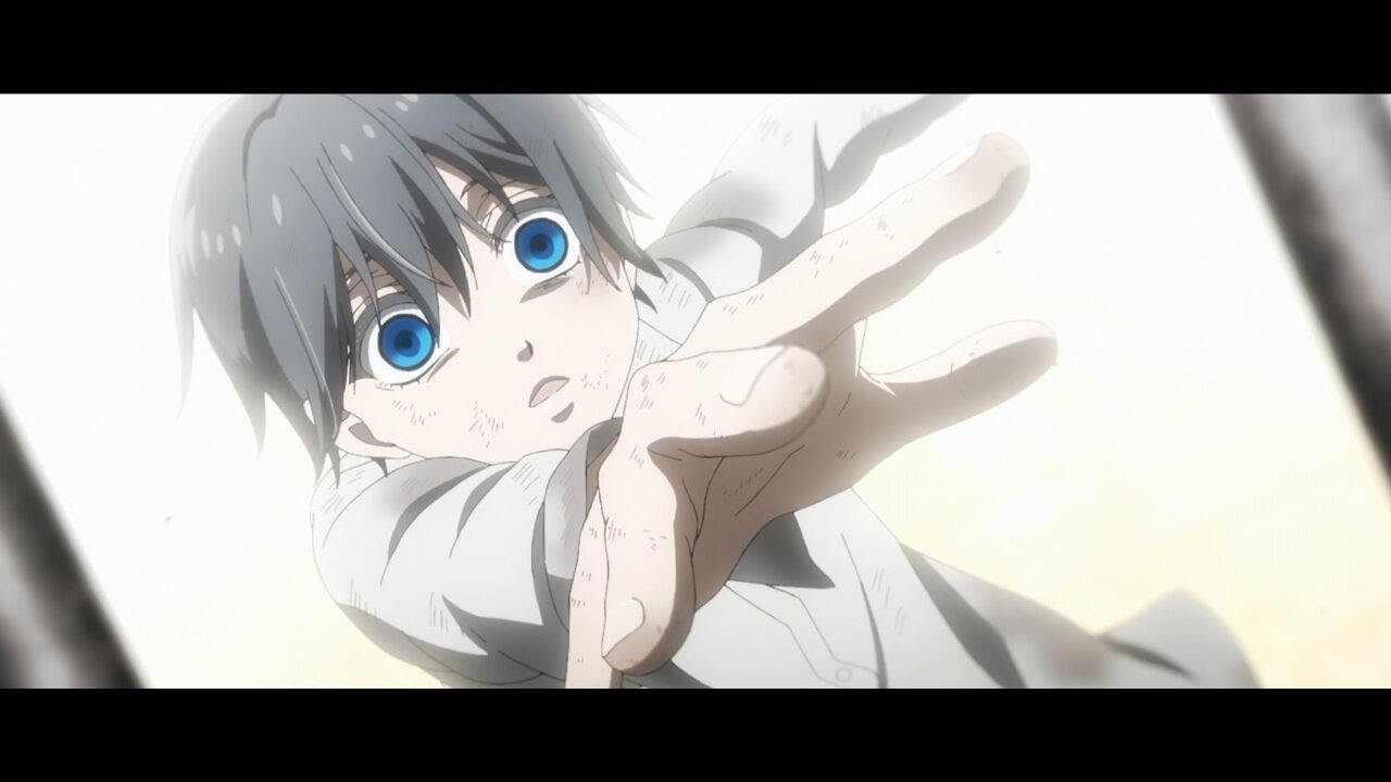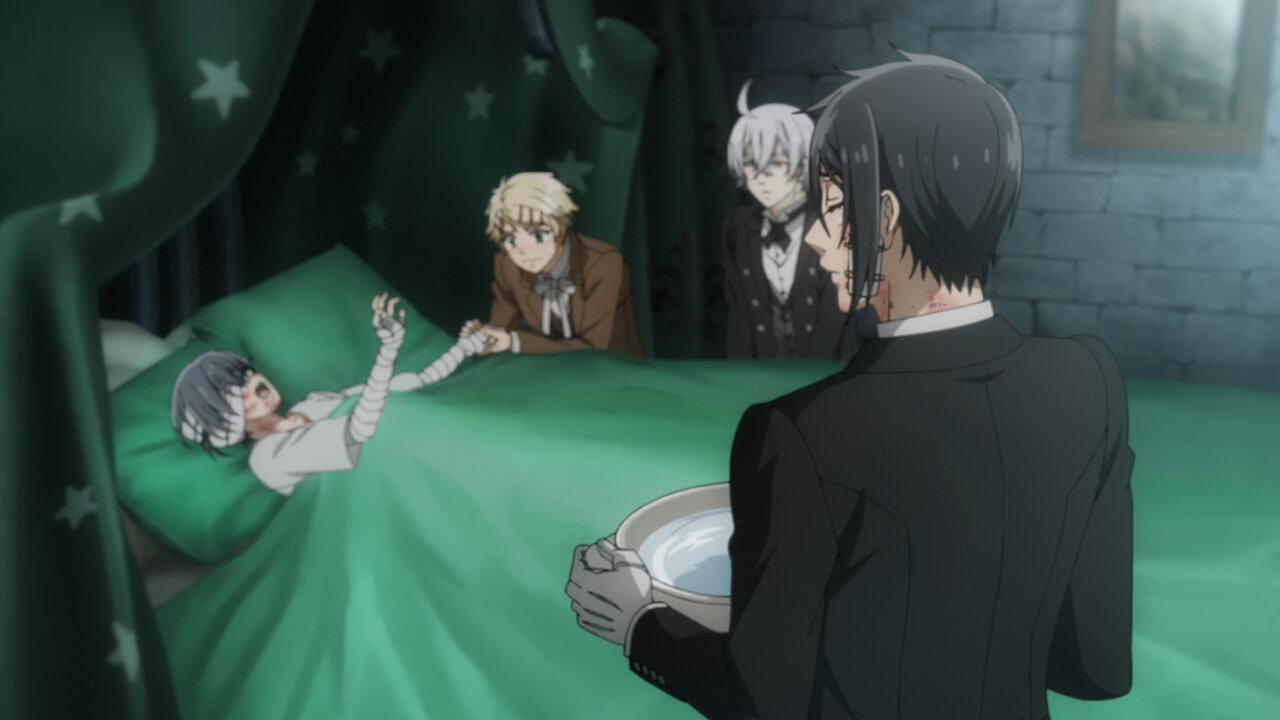 While Sebastian is out of the woods, Ciel is not. The next morning, the boy freaks out when any of the adults touch him- clinging to Finny, the only servant close in age to him. The miasma not only robbed Ciel of his sight, it seems to have done something to his mind as well. He starts talking in the third person and acting as if he were reliving his past. We’ve seen these flashbacks before- nothing new- except that for the first time, we see that he appeared to have another child he bonded with, who, unlike him, didn’t make it out. Now, that really piques my curiosity, especially seeing as it’s something he clearly tried to bury deep within his memory.