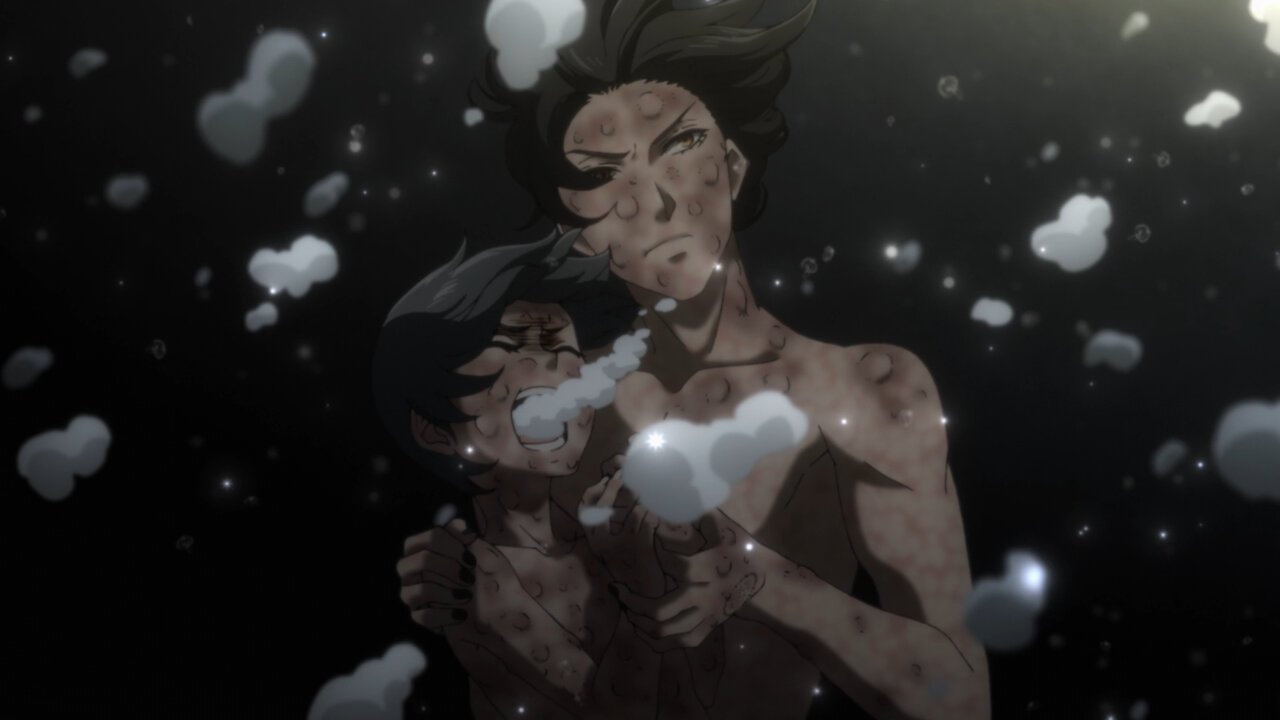 Indeed- the miasma is no normal evil miasma, since such curses shouldn’t be able to effect demons like Sebastian. Nor are demons capable of having the emotions one would associate with tears. Not only does Sebastian cry, he breaks out in horrible pustules and rashes. They built up the suspense leading to the discovery of Ciel’s break out quite well- you could feel the impending horror.